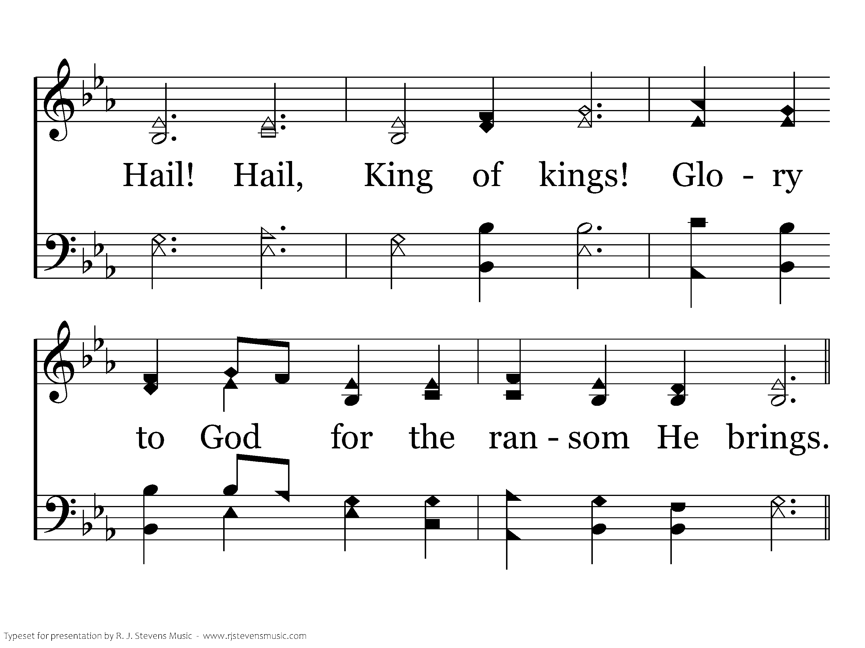 Lowly manger bed, lowly the virgin who cradles His head. Hail! Hail, King of kings! Glory to God for the ransom He brings.