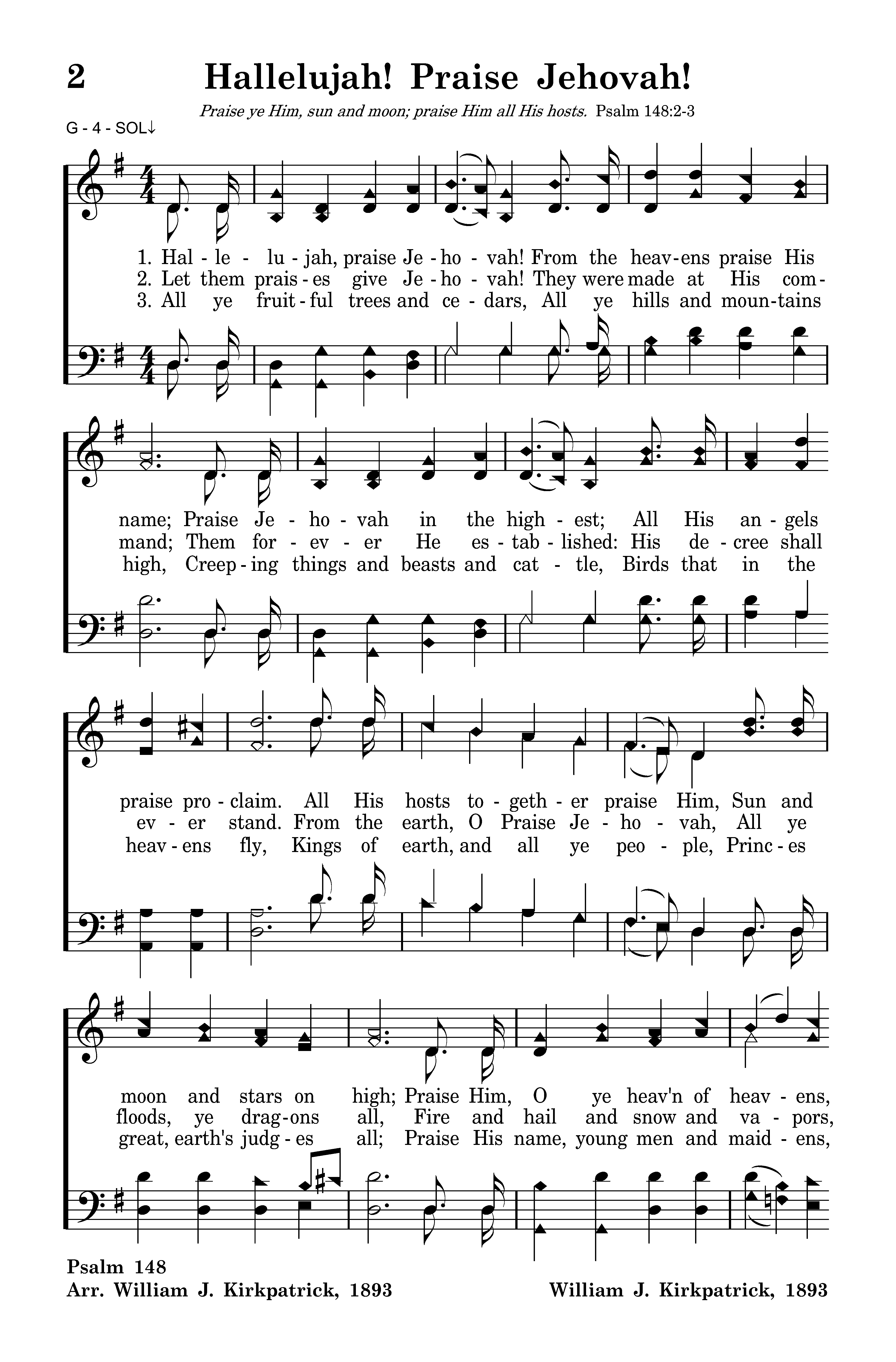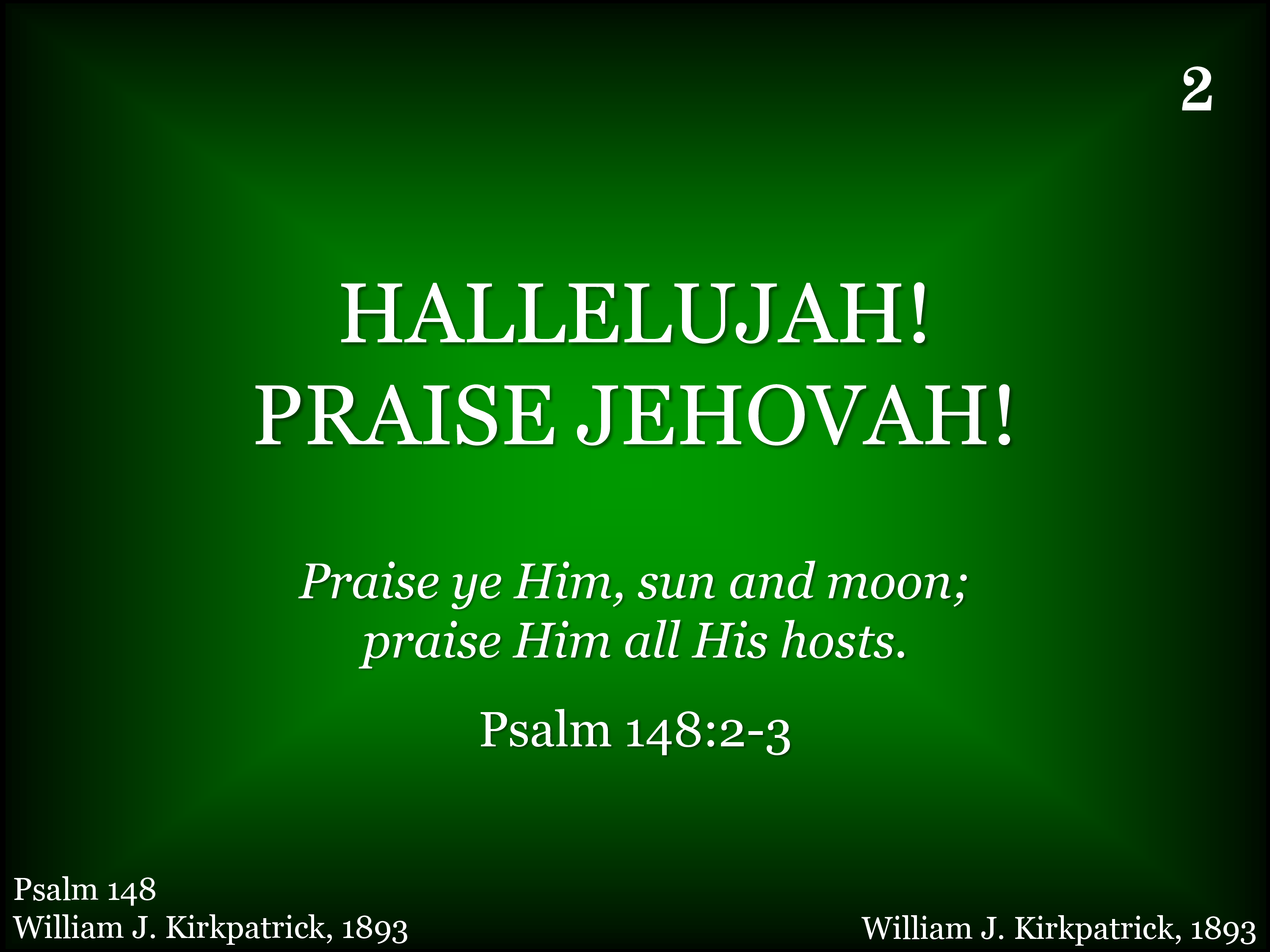 Hallelujah, praise Jehovah! From the heavens praise His name; Praise Jehovah in the highest; All His angels praise proclaim. All His hosts together praise Him, Sun and moon and stars on high; Praise Him, O ye heav'n of heavens, And ye floods above the sky.