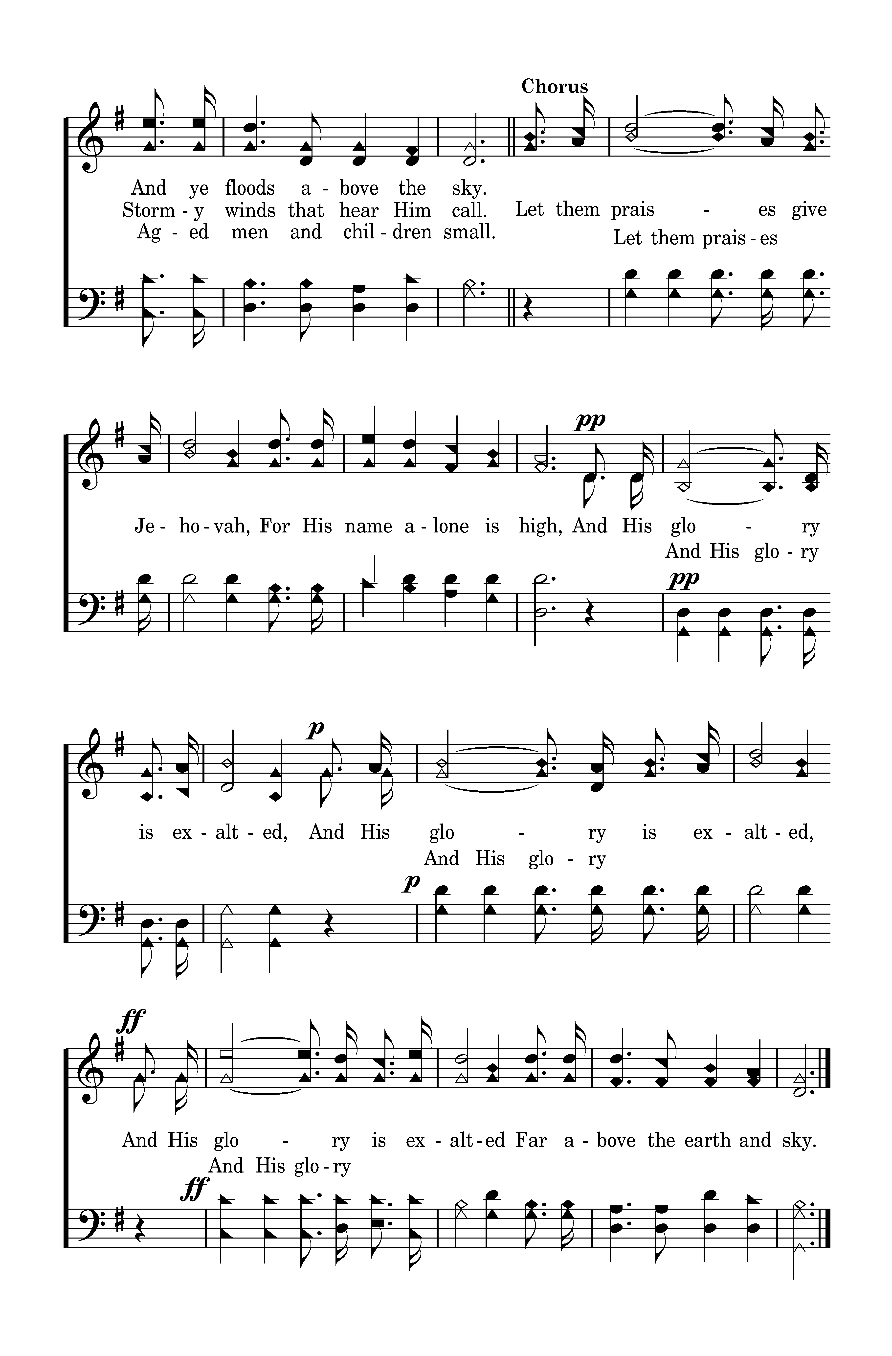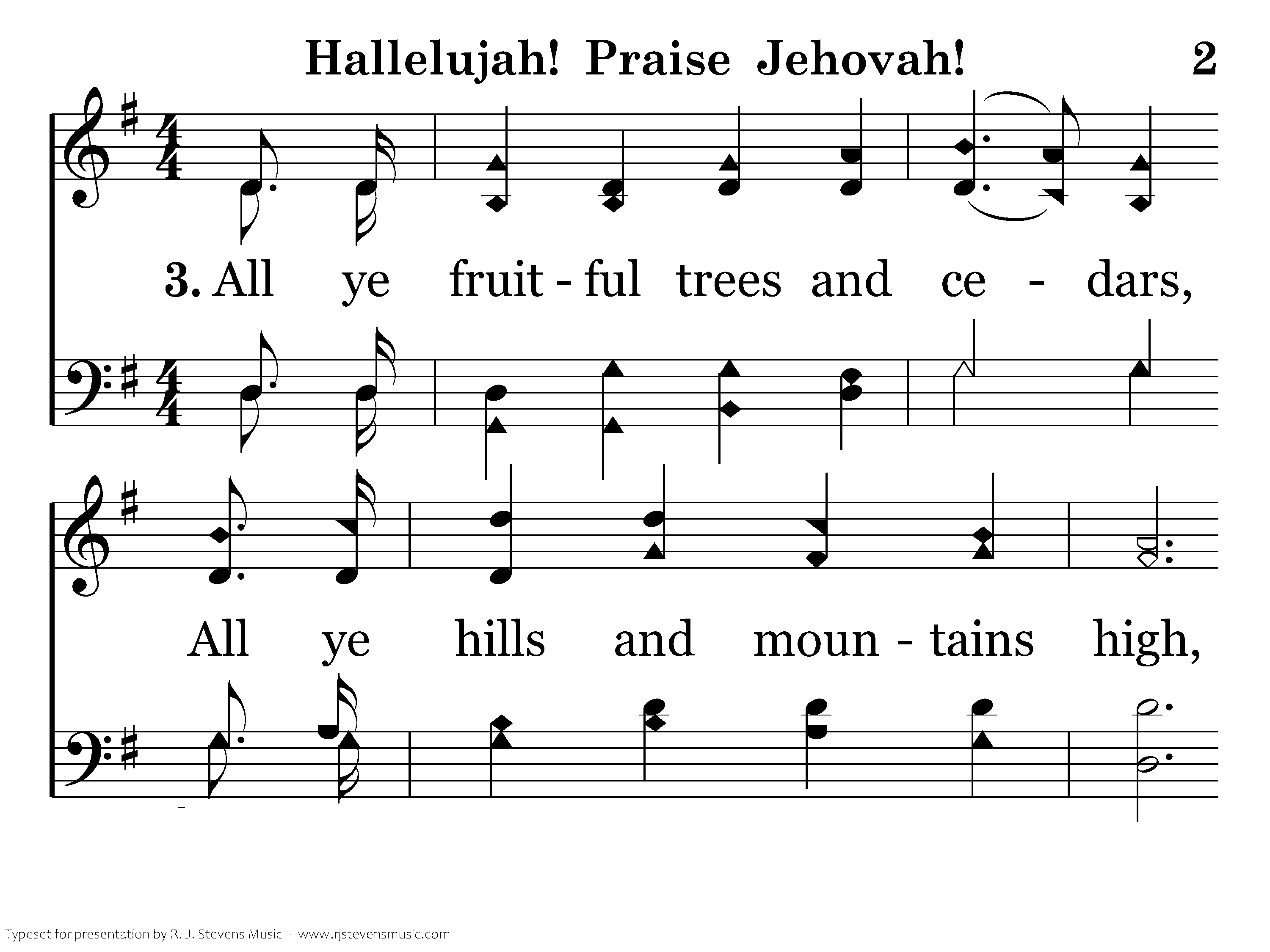 Let them praises give Jehovah, For His name alone is high, And His glory is exalted, And His glory is exalted, And His glory is exalted Far above the earth and sky.