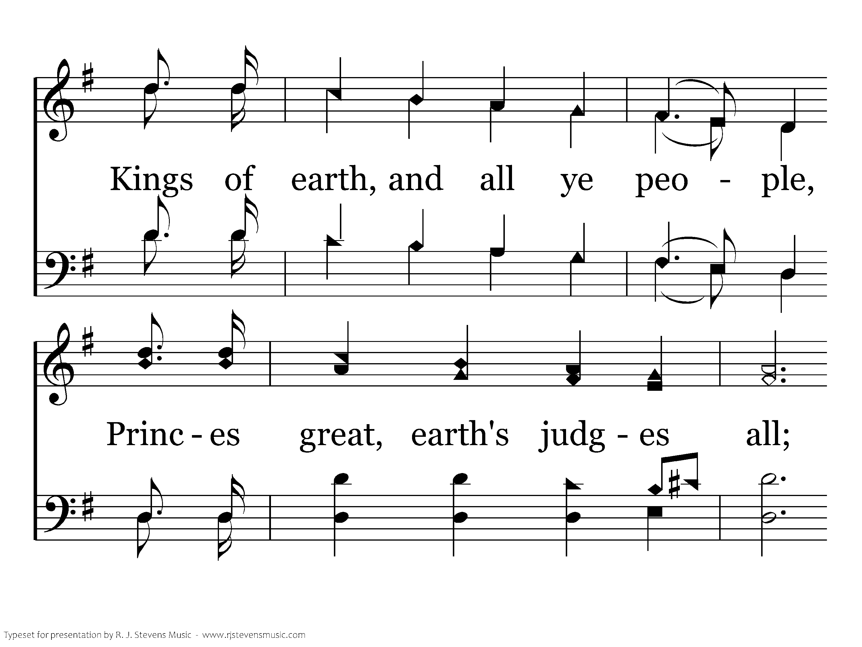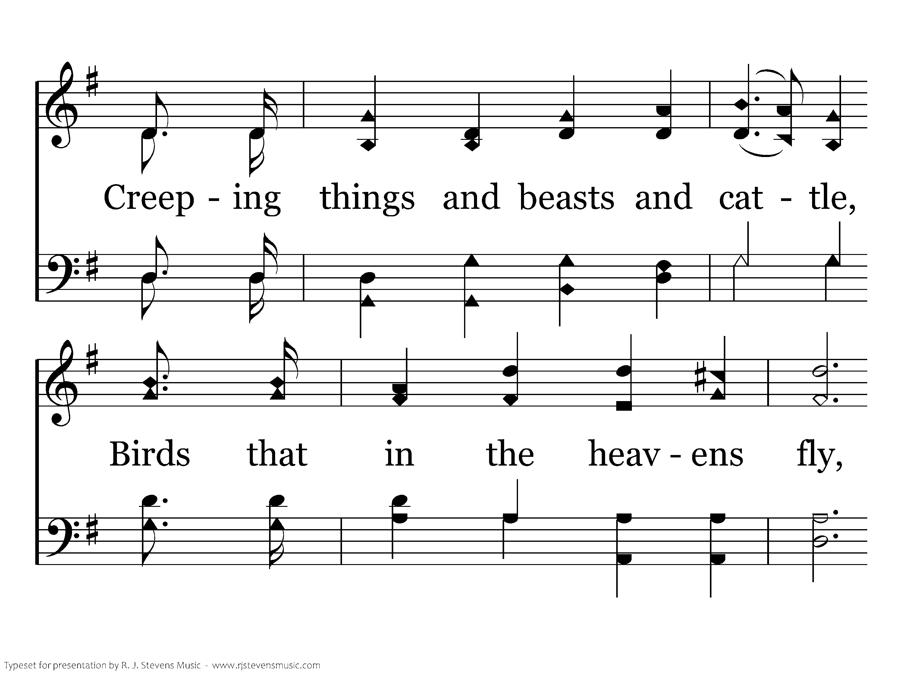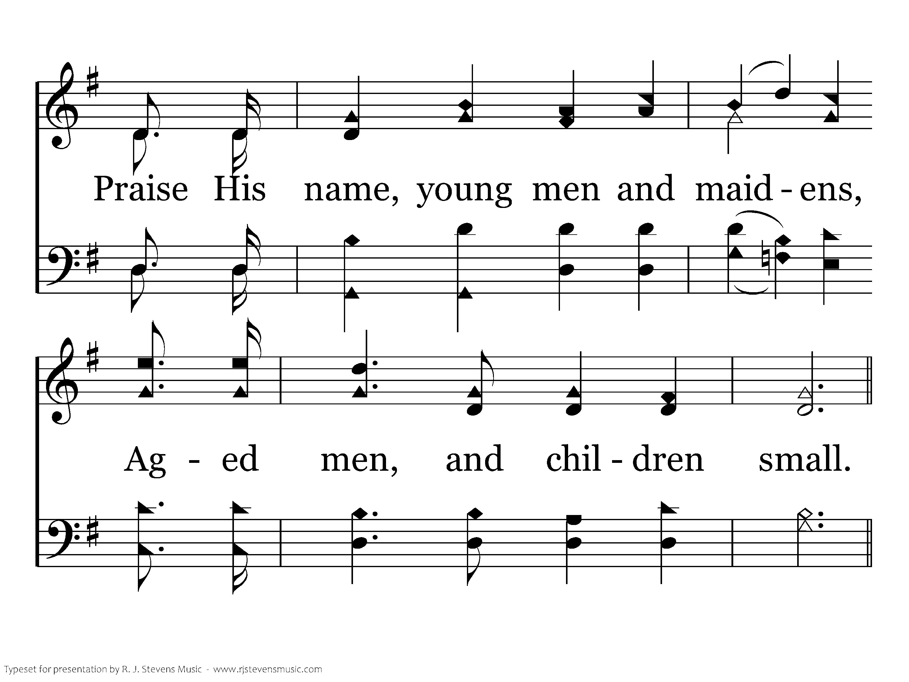 All ye fruitful trees and cedars, All ye hills and mountains high, Creeping things and beasts and cattle, Birds that in the heavens fly, Kings of earth, and all ye people, Princes great, earth's judges all; Praise His name, young men and maidens, Aged men, and children small.