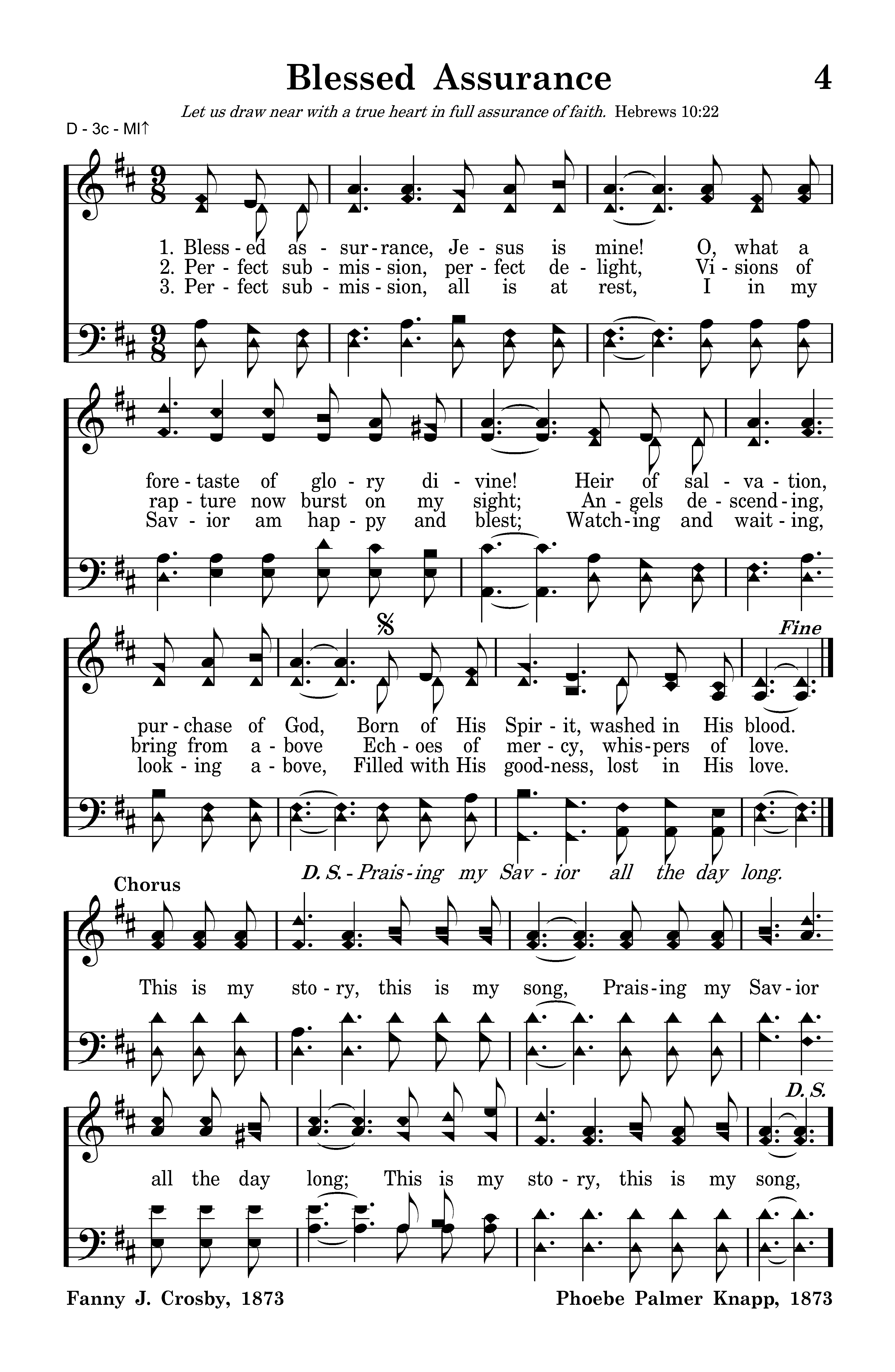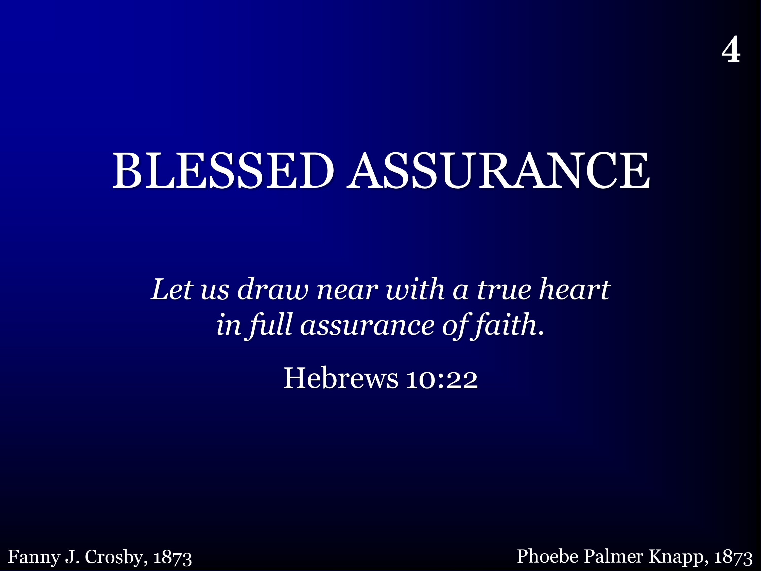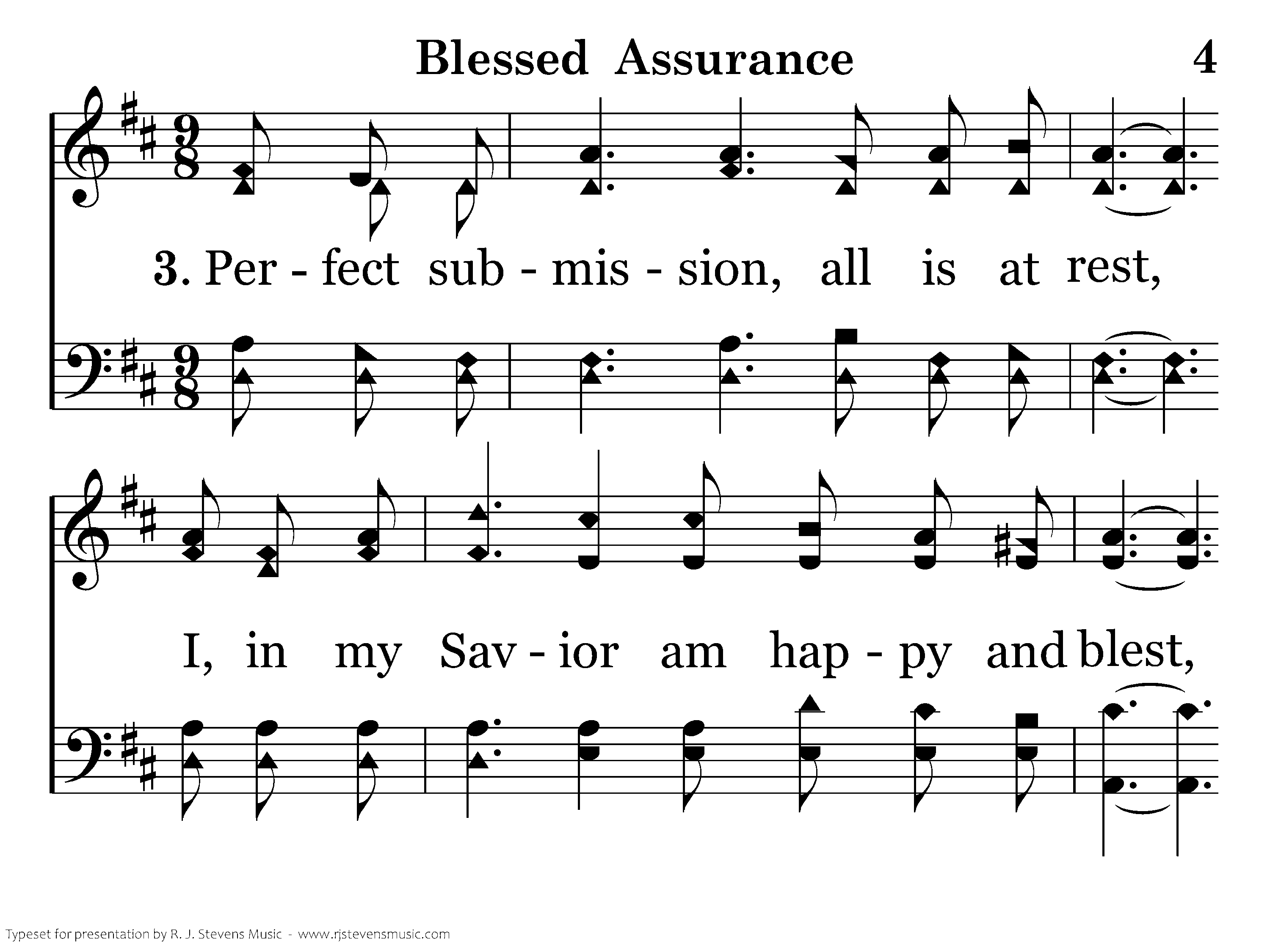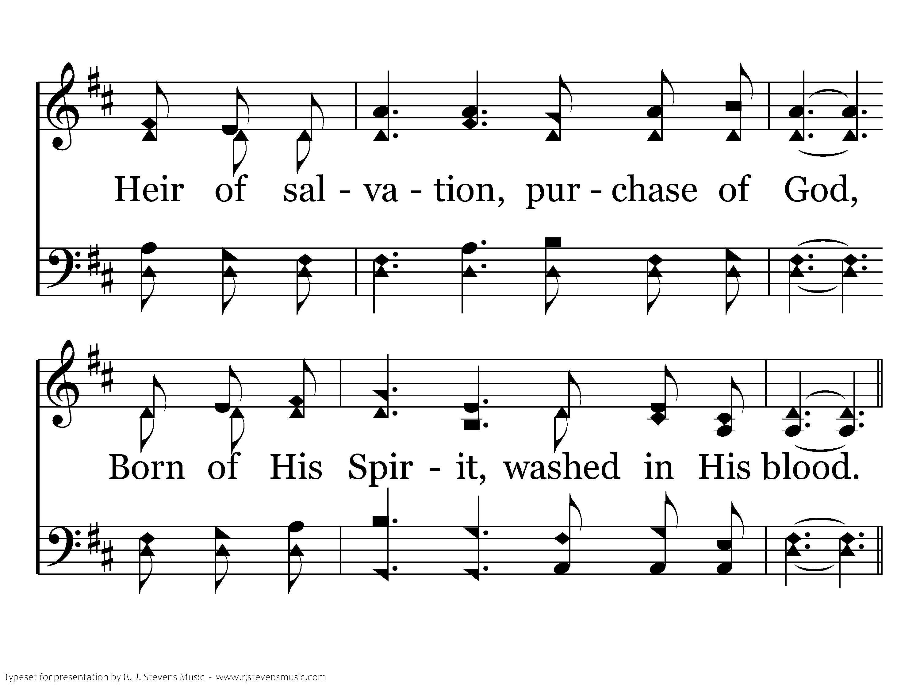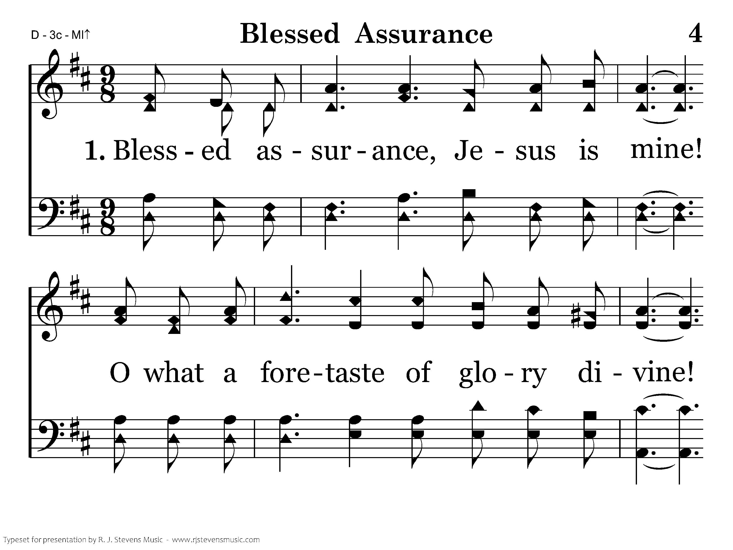 Blessed assurance, Jesus is mine! O, what a foretaste of glory divine! Heir of salvation, purchase of God, Born of His Spirit, washed in His blood.