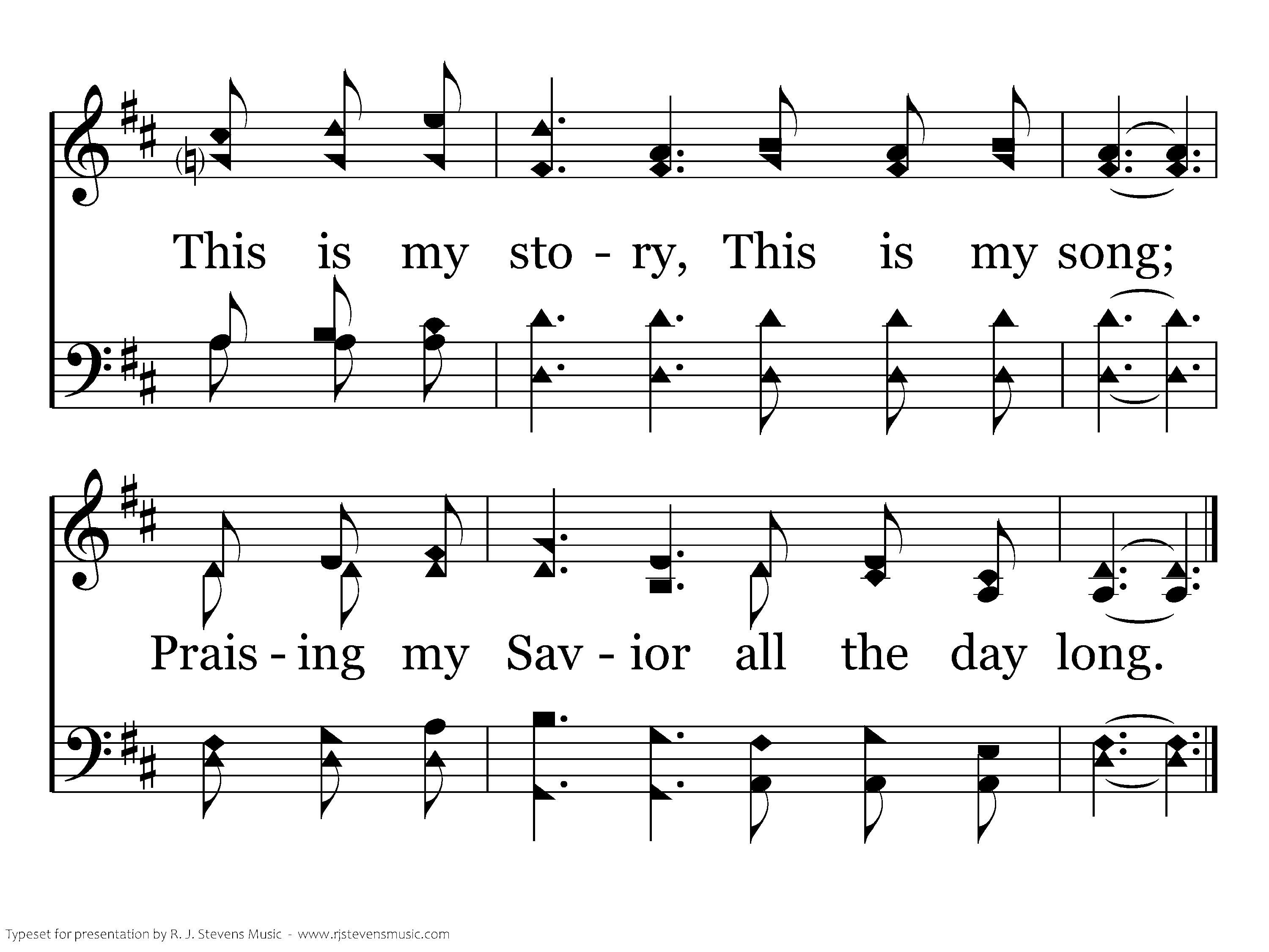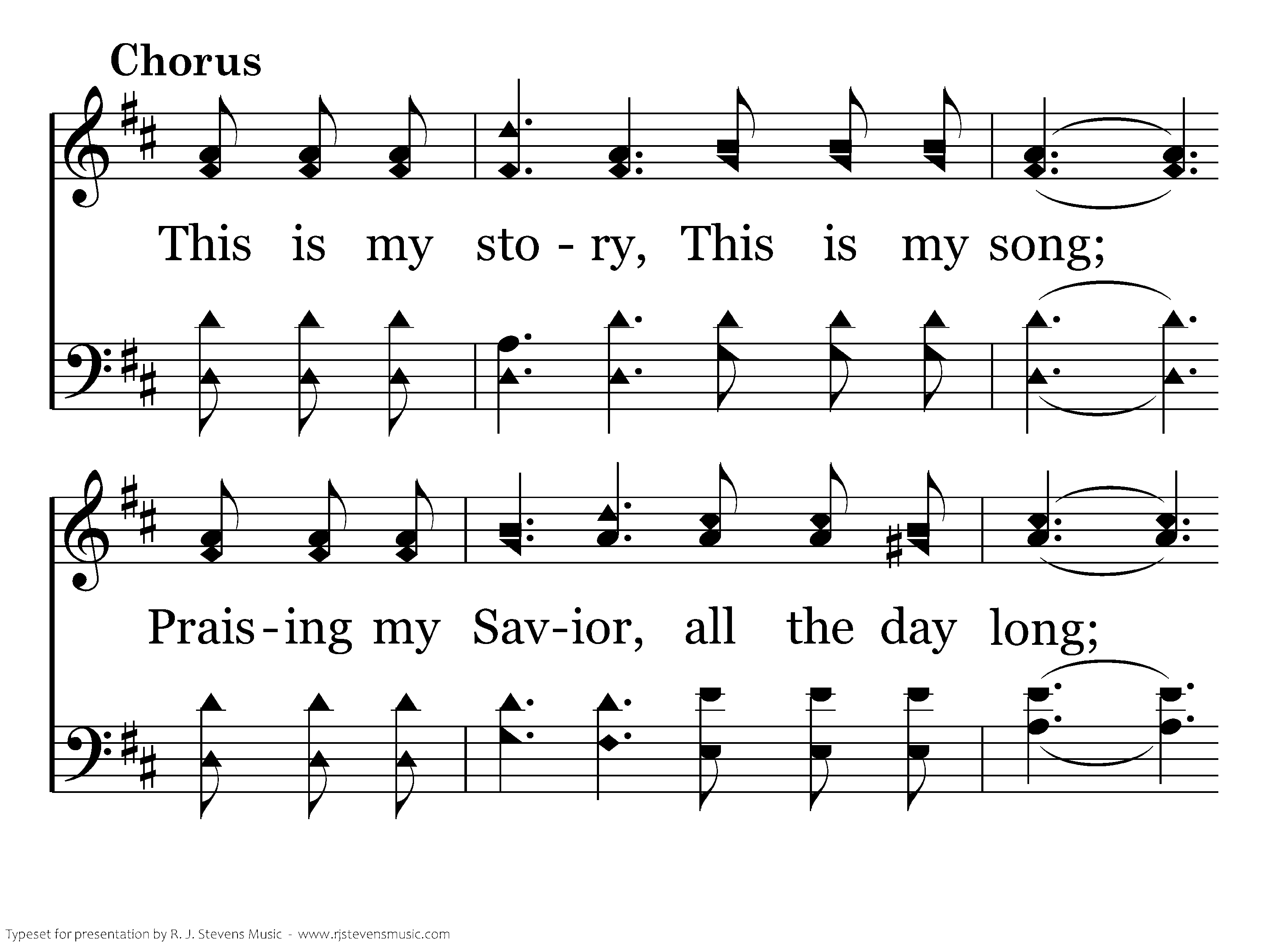 This is my story, this is my song, Praising my Savior all the day long; This is my story, this is my song; Praising my Savior all the day long.