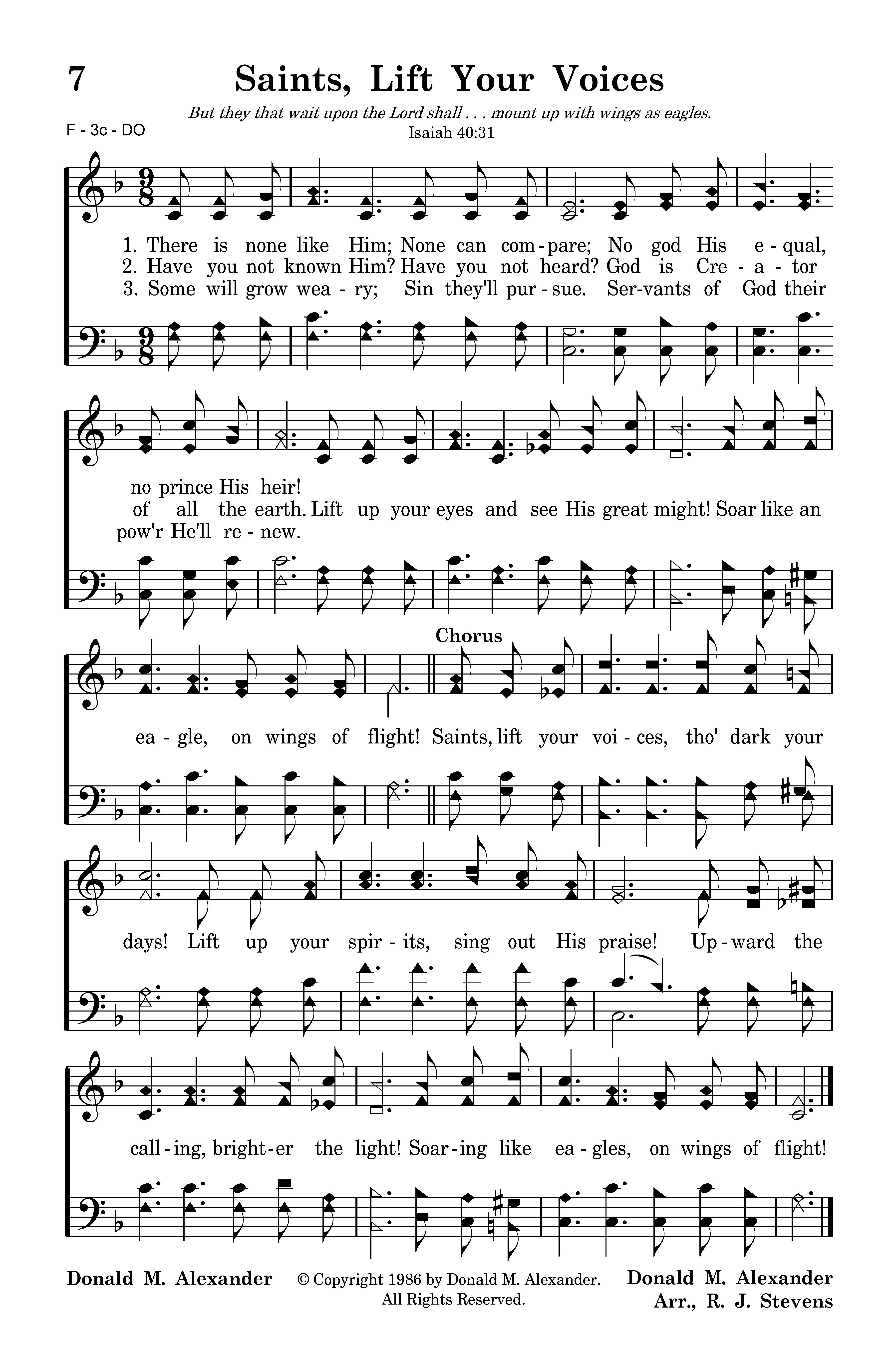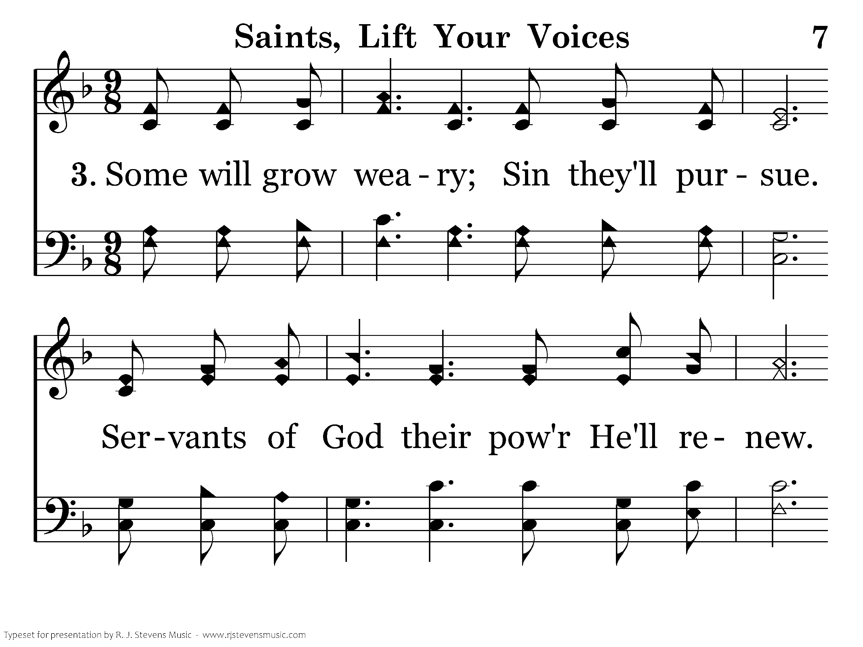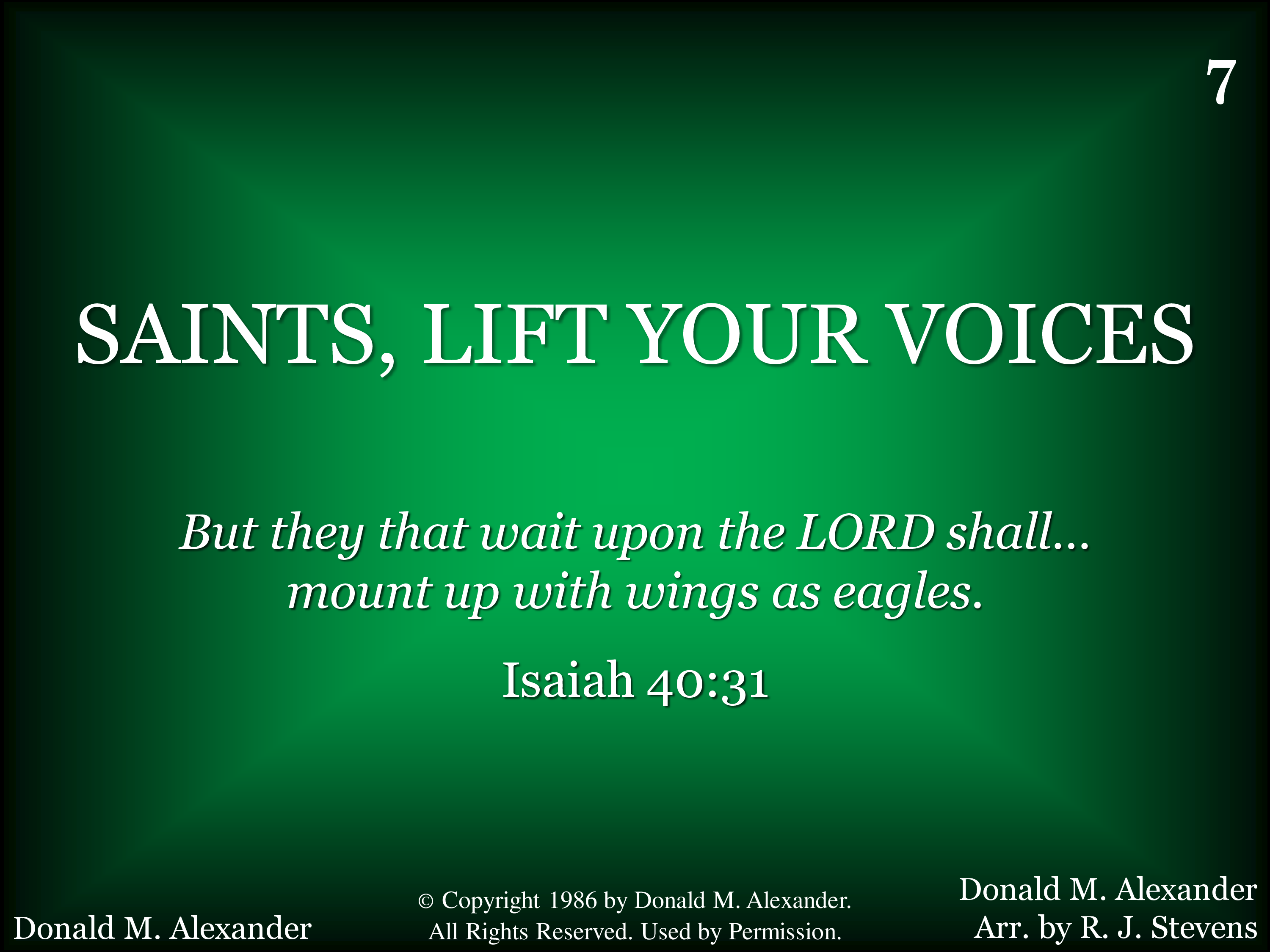 Saints, lift your voices, tho' dark your days! Lift up your spirits, sing out His praise! Upward the calling, brighter the light! Soaring like eagles, on wings of flight.