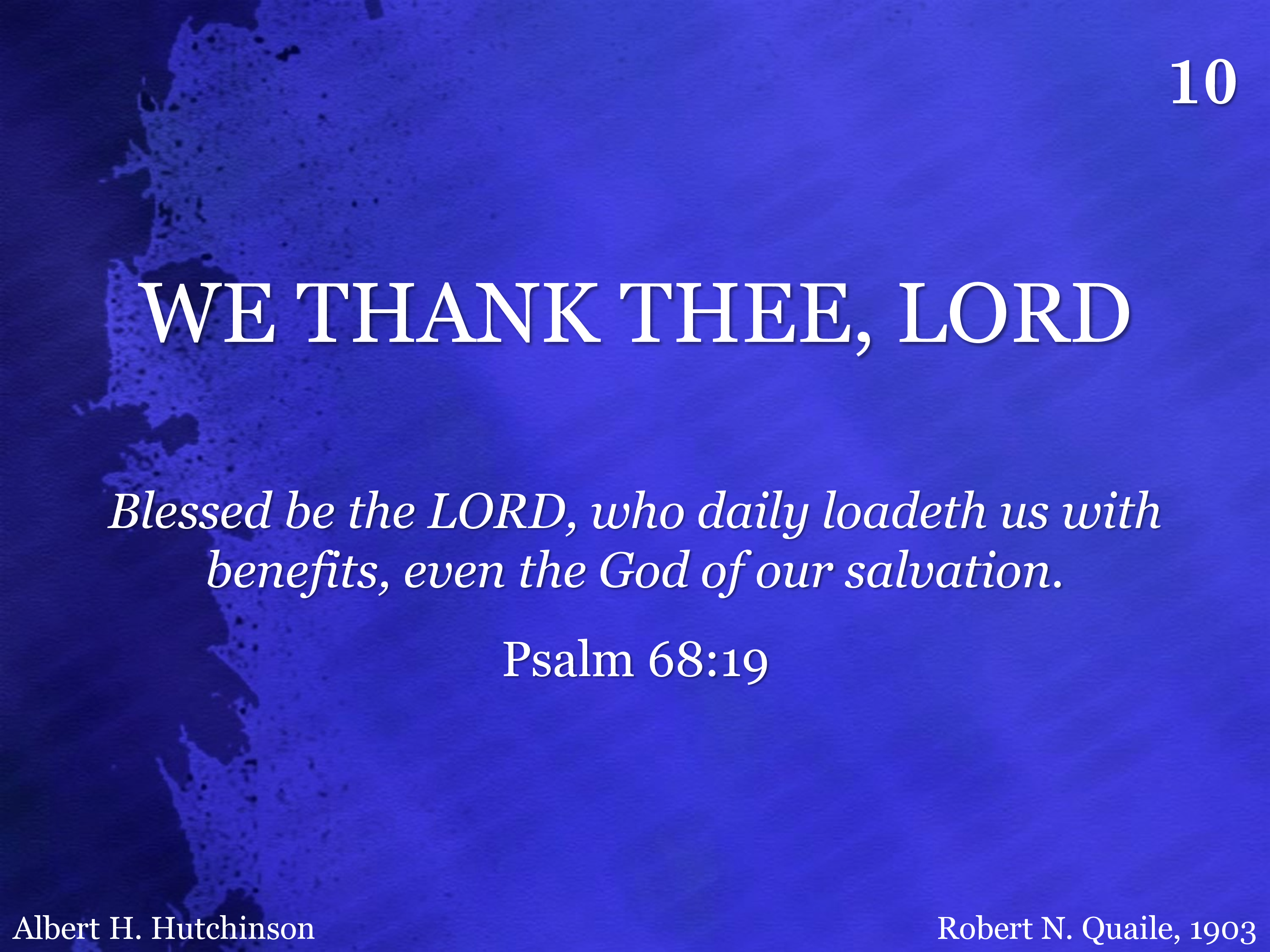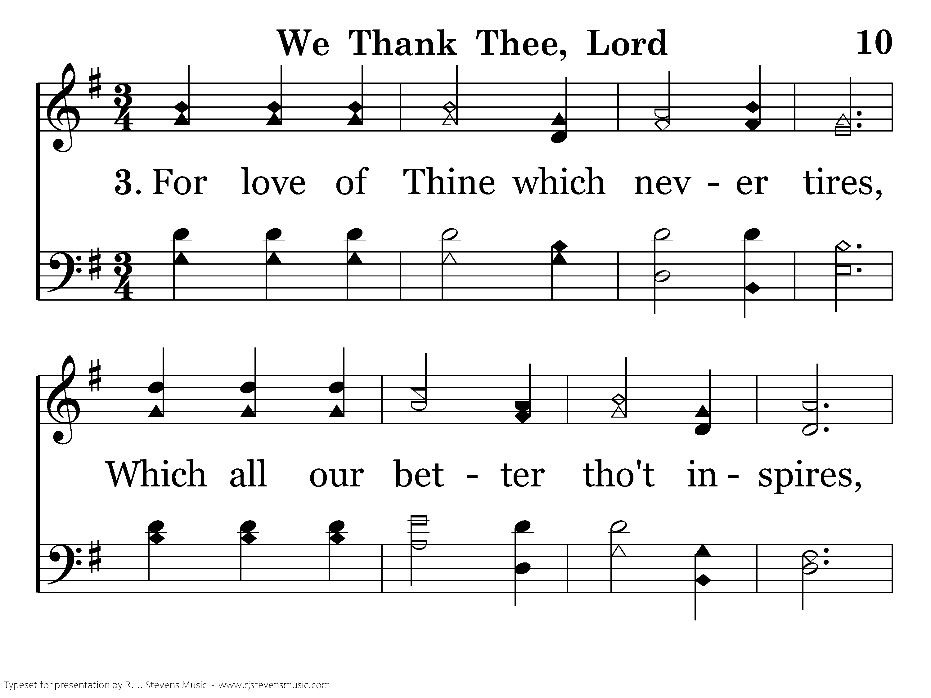 For love of Thine which never tires, Which all our better tho't inspires, And warms our lives, with heav'nly fires, We thank Thee, Lord.