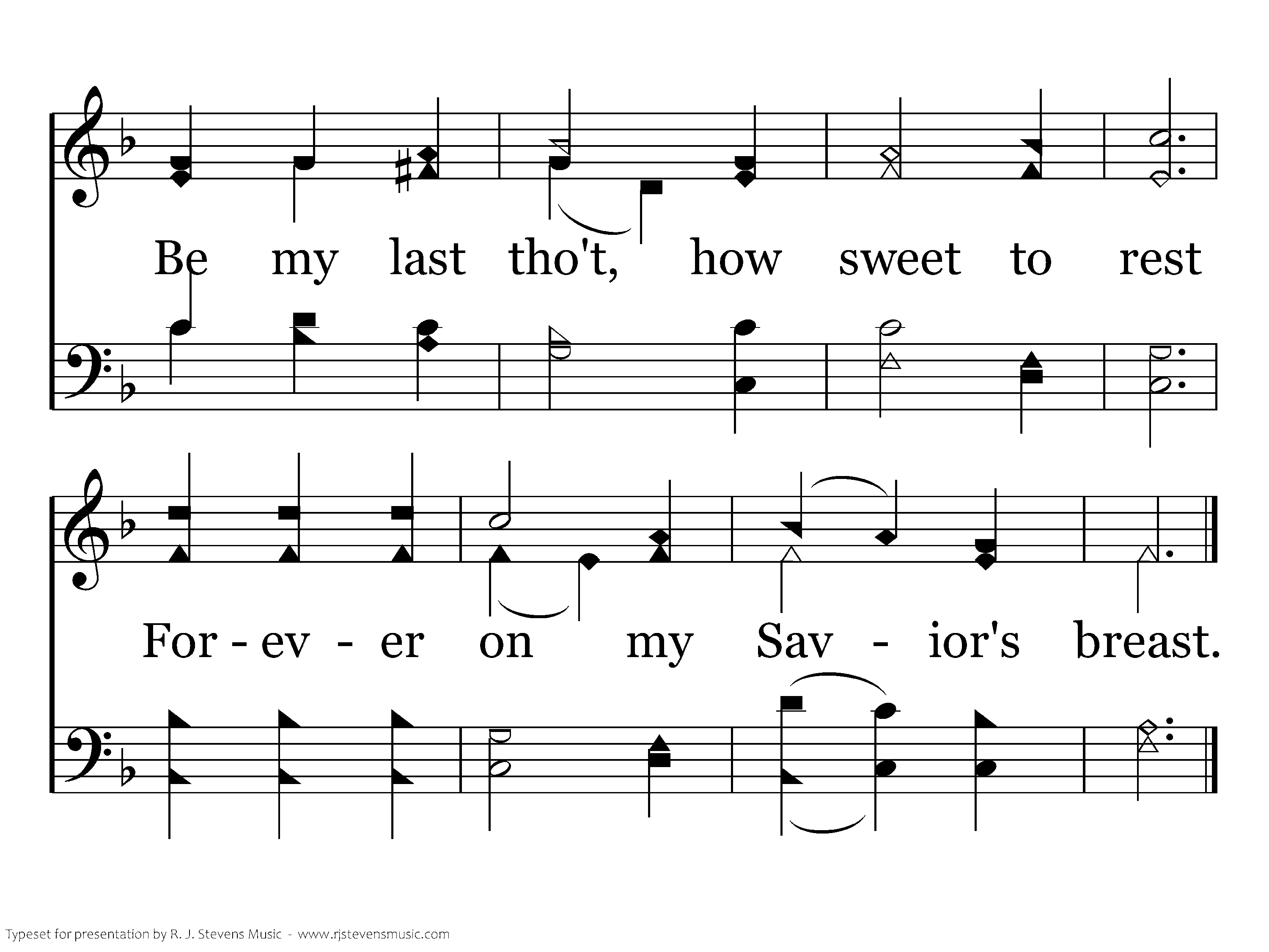 When the soft dews of kindly sleep My wearied eyelids gently steep, Be my last tho't, how sweet to rest Forever on my Savior's breast.