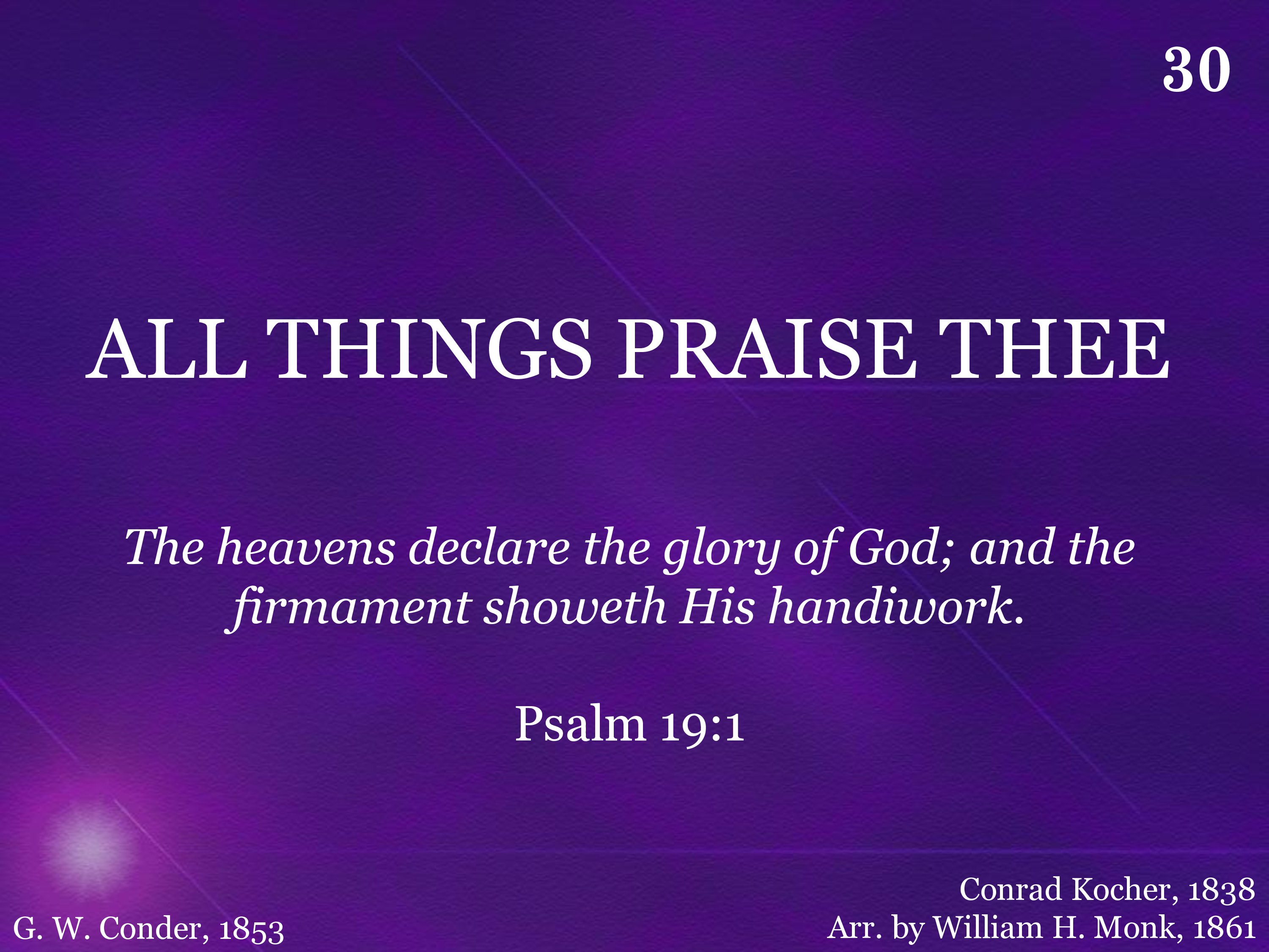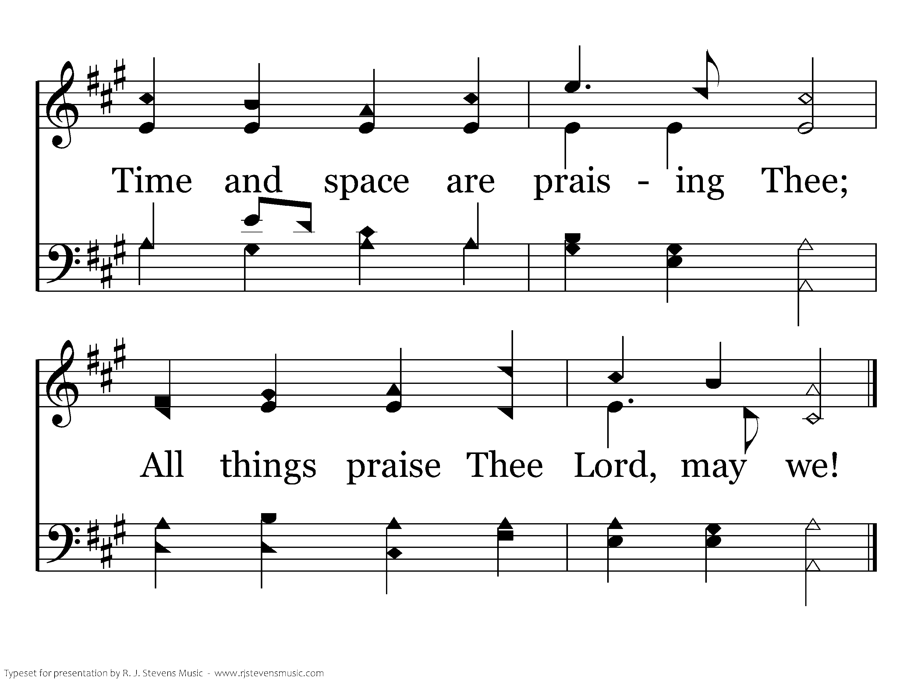 All things praise Thee night to night Sings in silent hymns of light; All things praise Thee day by day Chants Thy pow'r in burning ray; Time and space are praising Thee; All things praise Thee Lord, may we!
