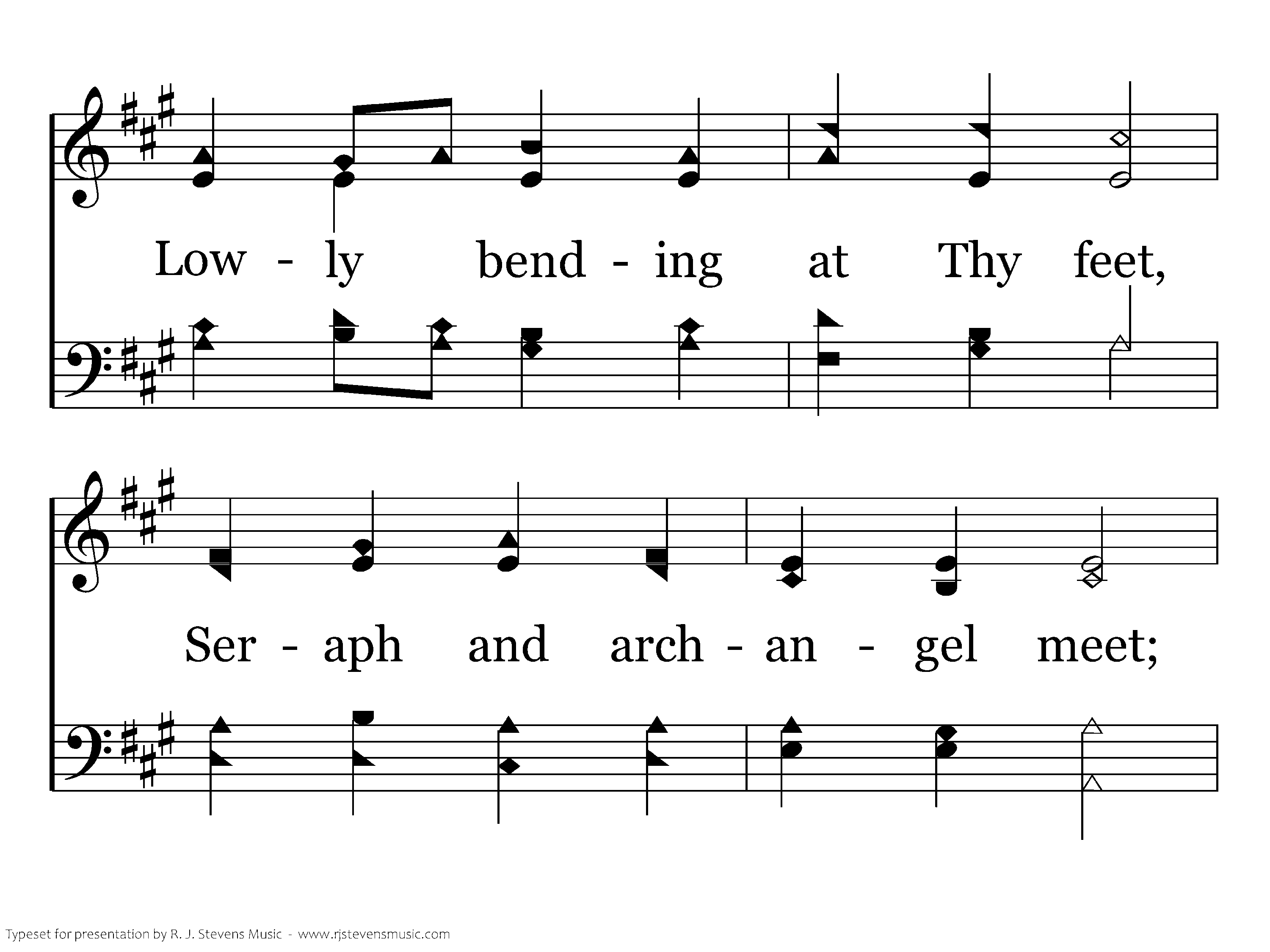 All things praise Thee: heav'n's high shrine Rings with melody divine; Lowly bending at Thy feet, Seraph and arch angel meet; This their highest bliss, to be Ever praising Lord, may we!
