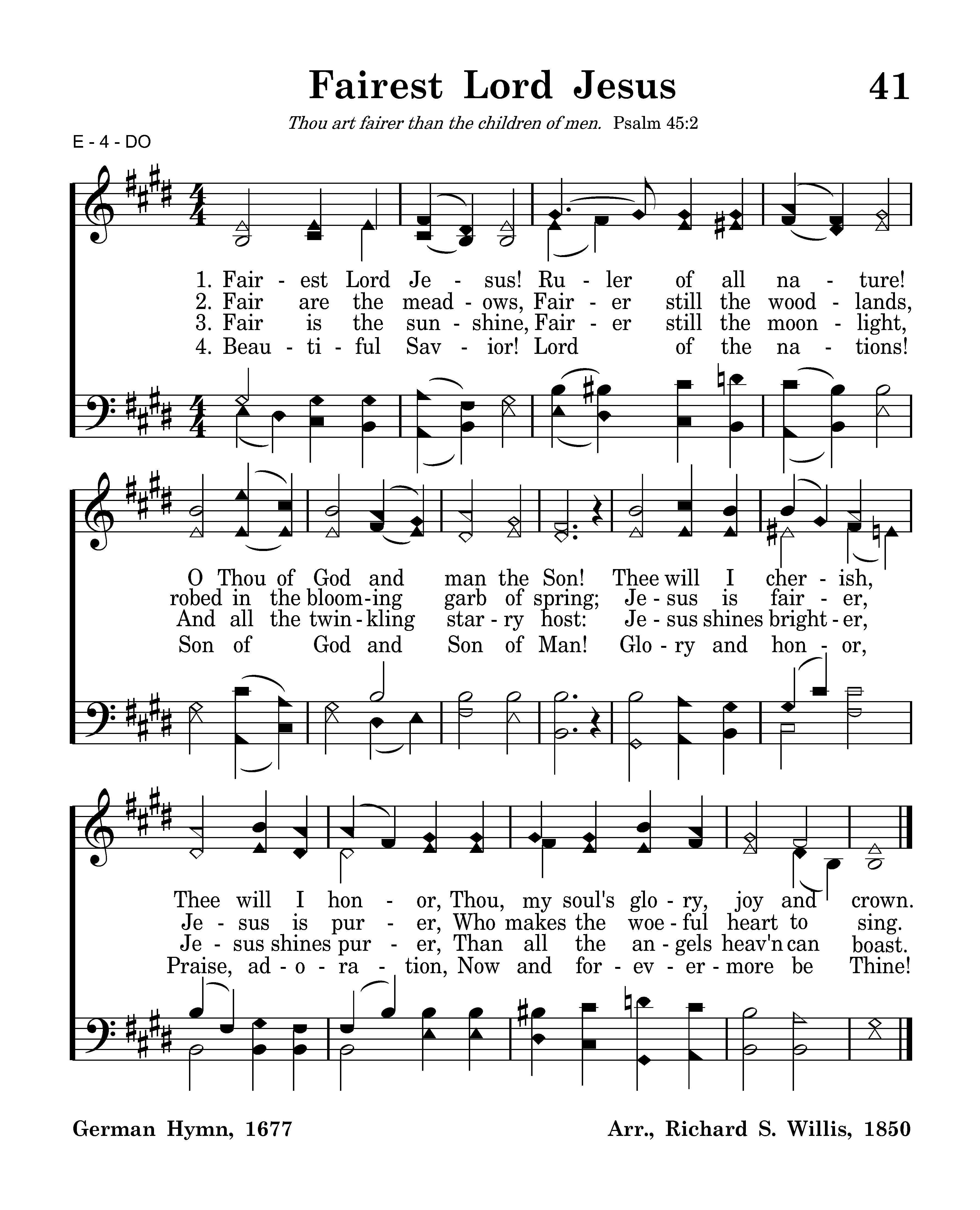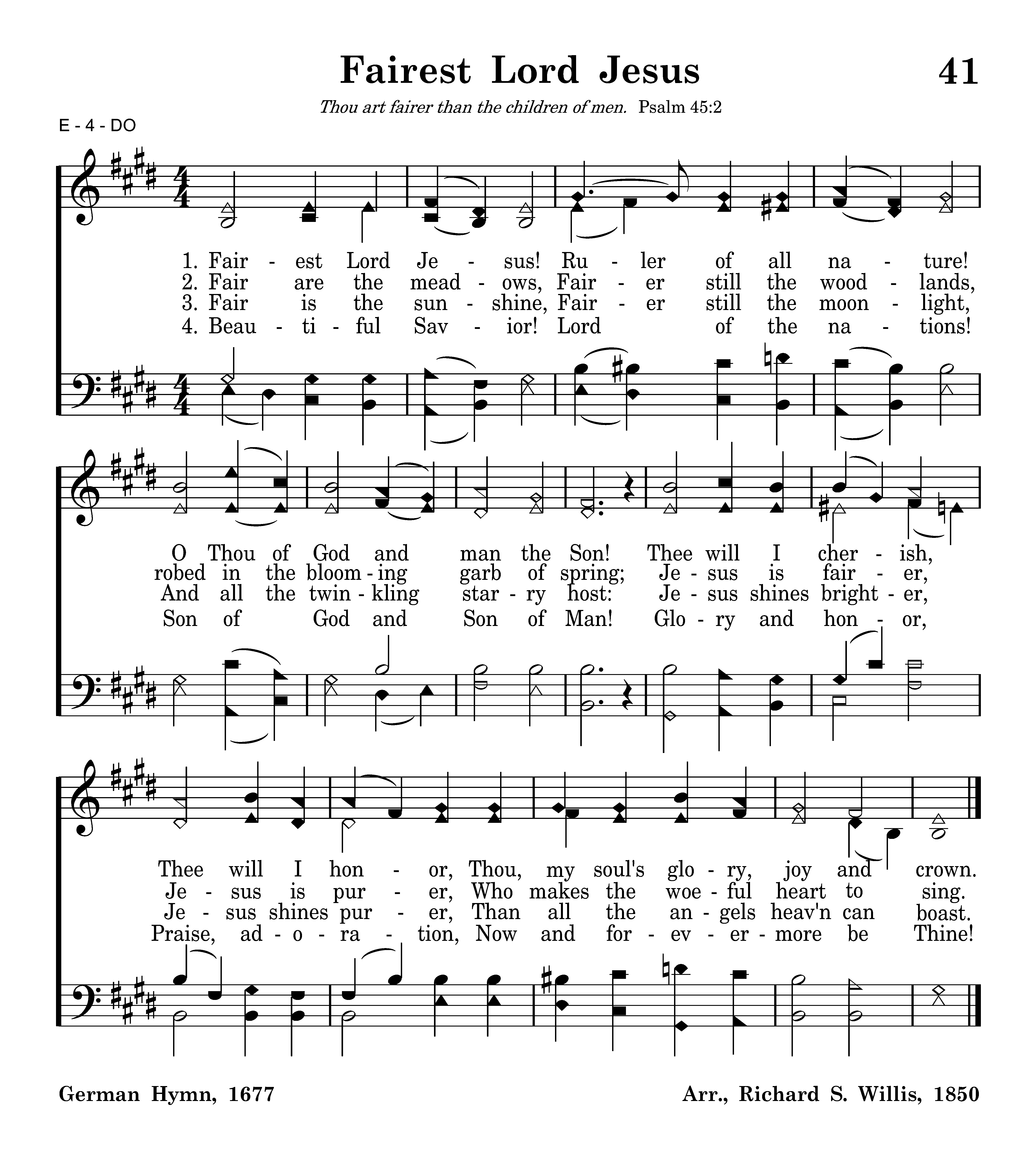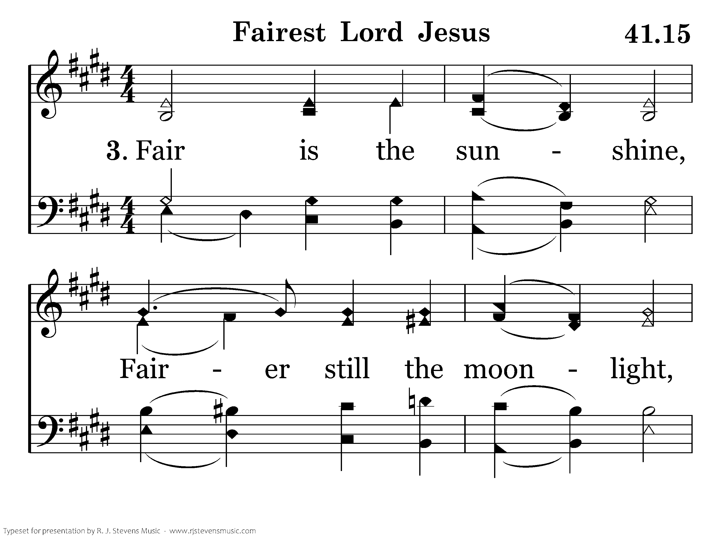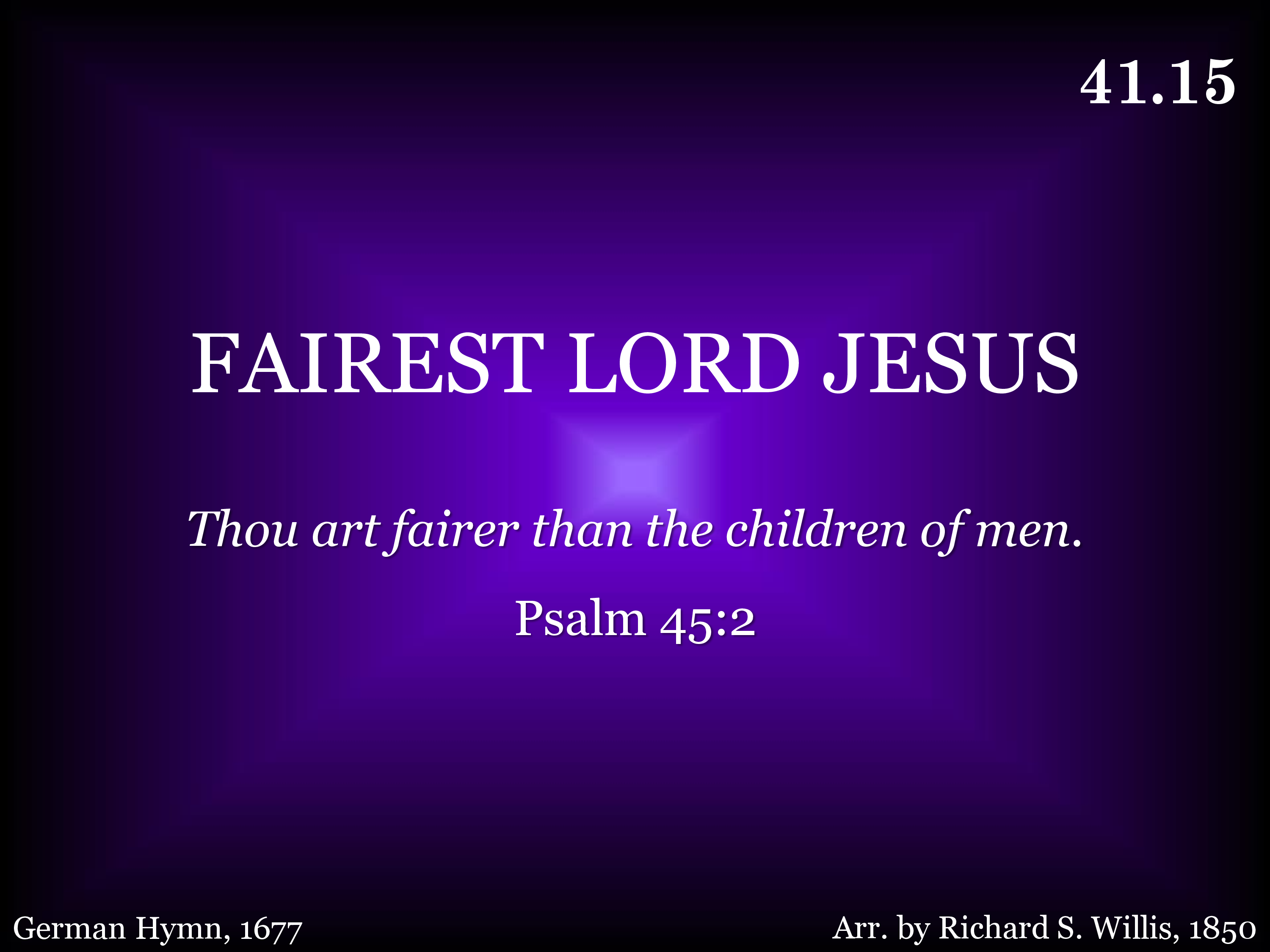 Fairest Lord Jesus! Ruler of all nature! O Thou of God and man the Son! Thee will I cherish, Thee will I honor, Thou, my soul's glory, joy and crown.