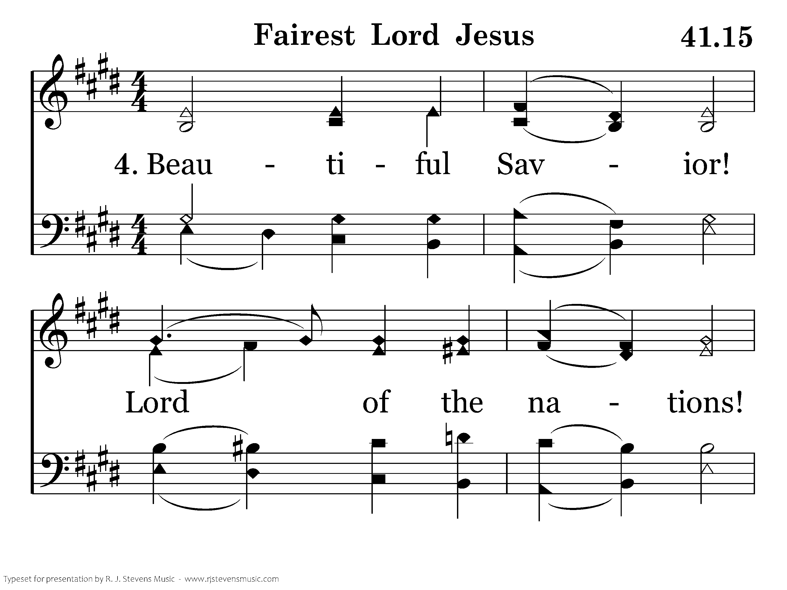 Beautiful Savior! Lord of the nations! Son of God and Son of Man! Glory and honor, Praise, adoration, Now and forevermore be thine!