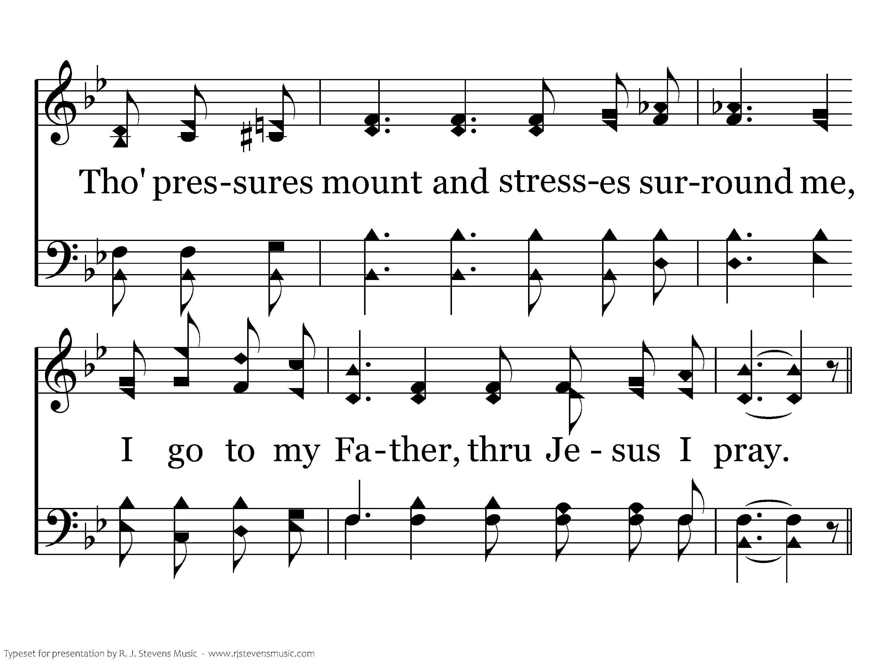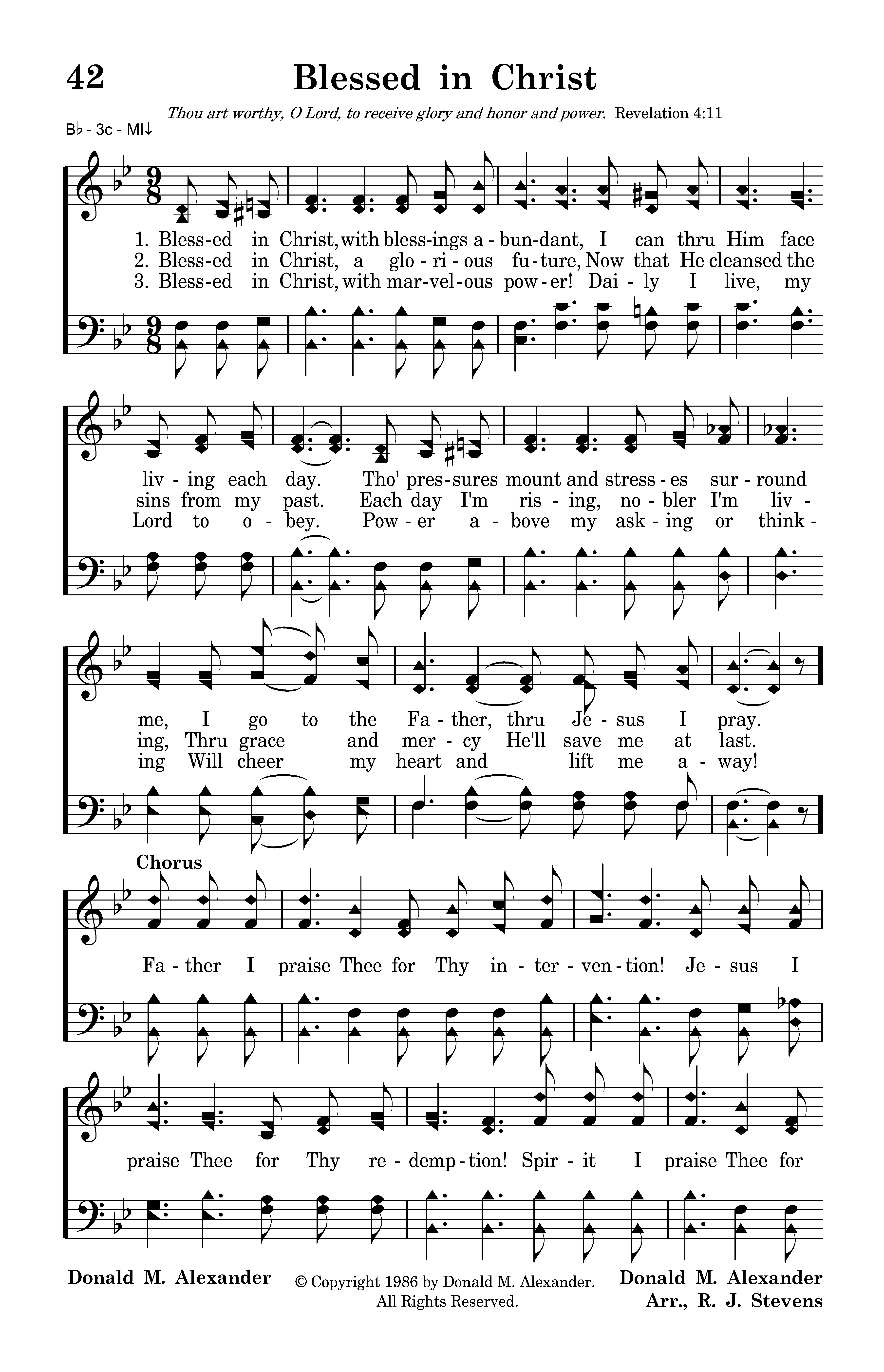 Blessed in Christ, with blessings abundant, I can thru Him face living each day. Tho' pressures mount and stresses surround me, I go to my Father, thru Jesus I pray.