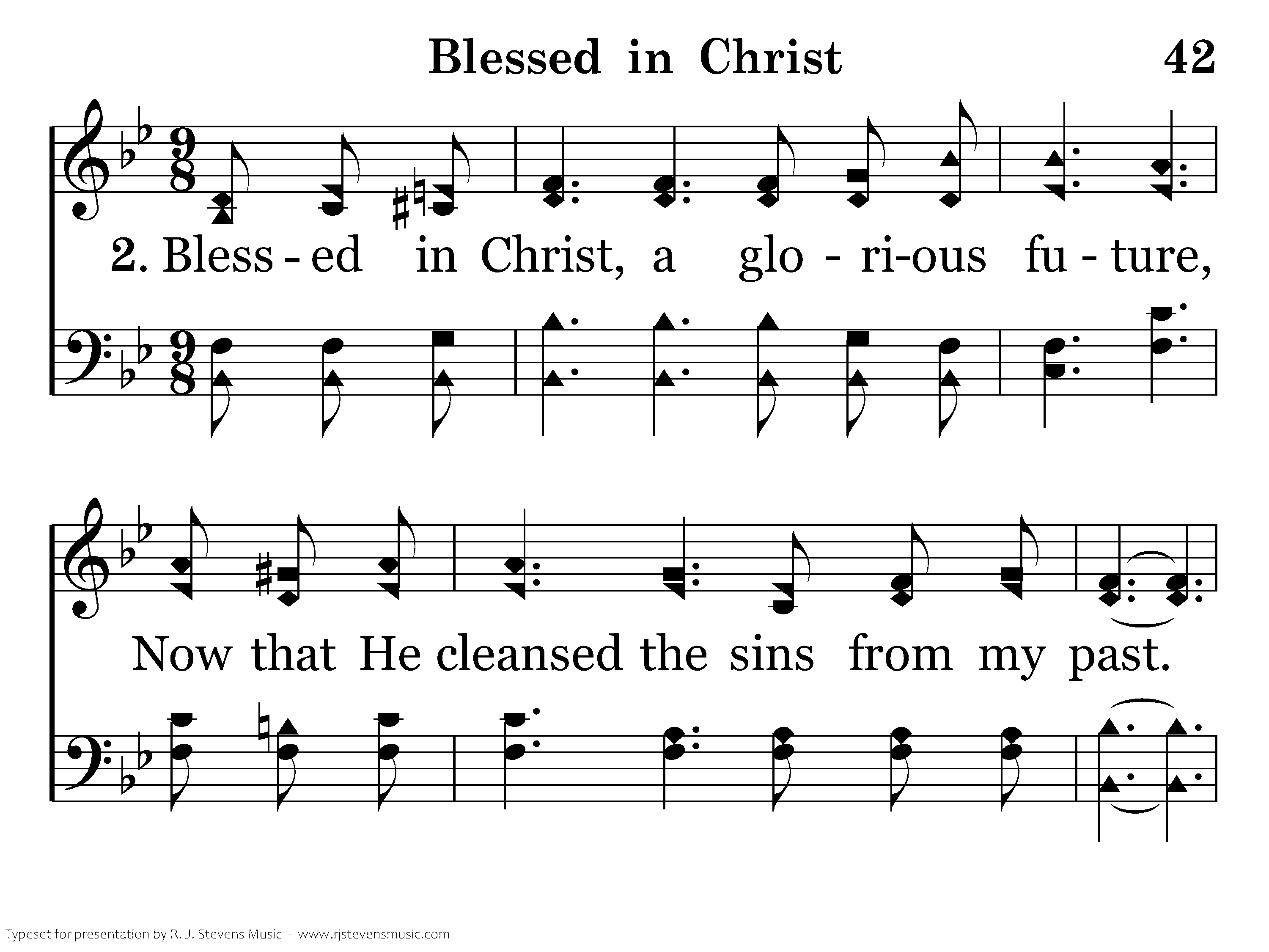 Blessed in Christ, a glorious fututre. Now that He cleansed the sins from my past. Each day I'm rising, nobler I'm living, Thru grace and mercy He'll save me at last.