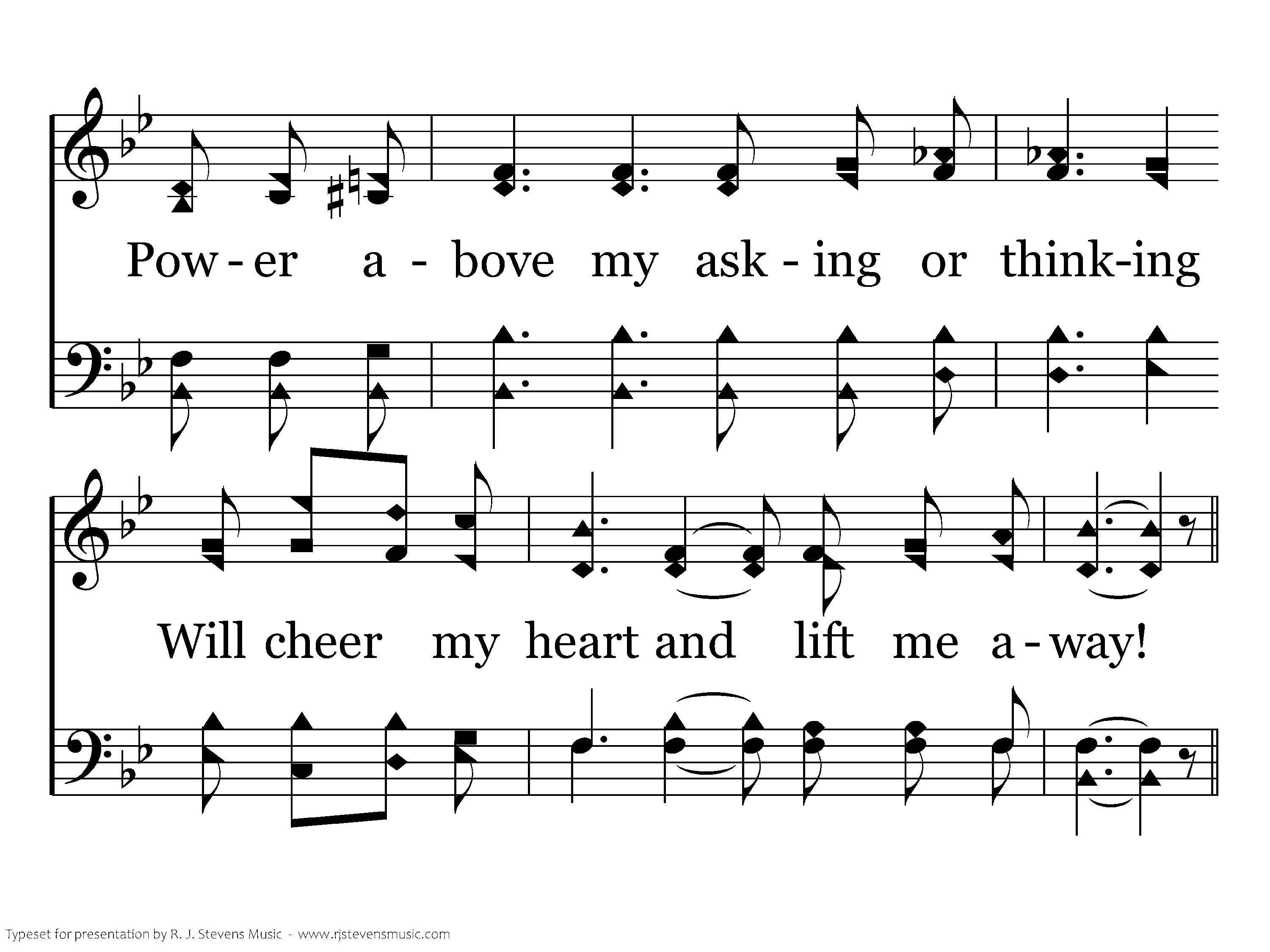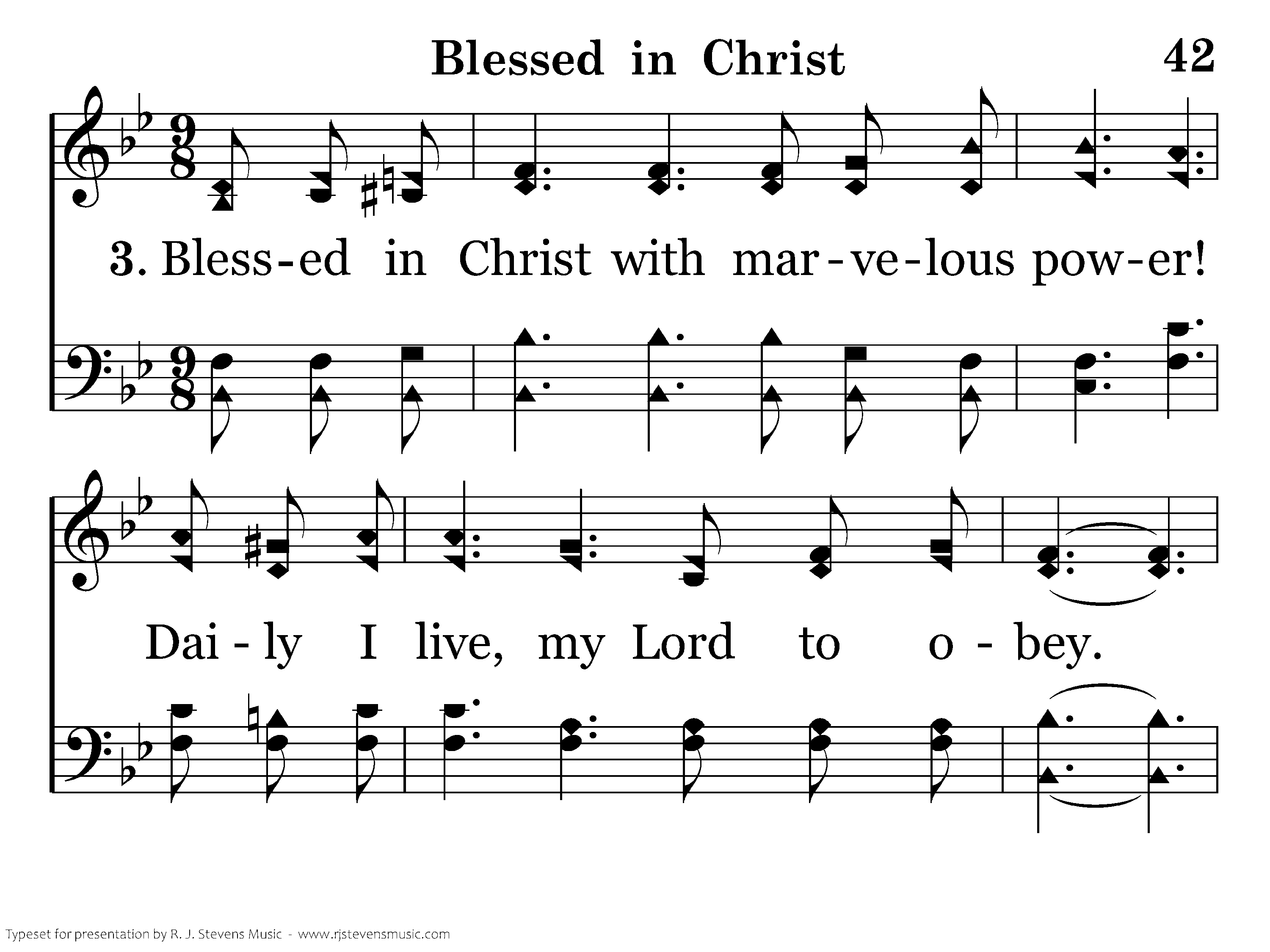 Blessed in Christ, with marvelous power! Daily I live, my Lord to obey. Power above my asking or thinking Will cheer my heart and lift me away!