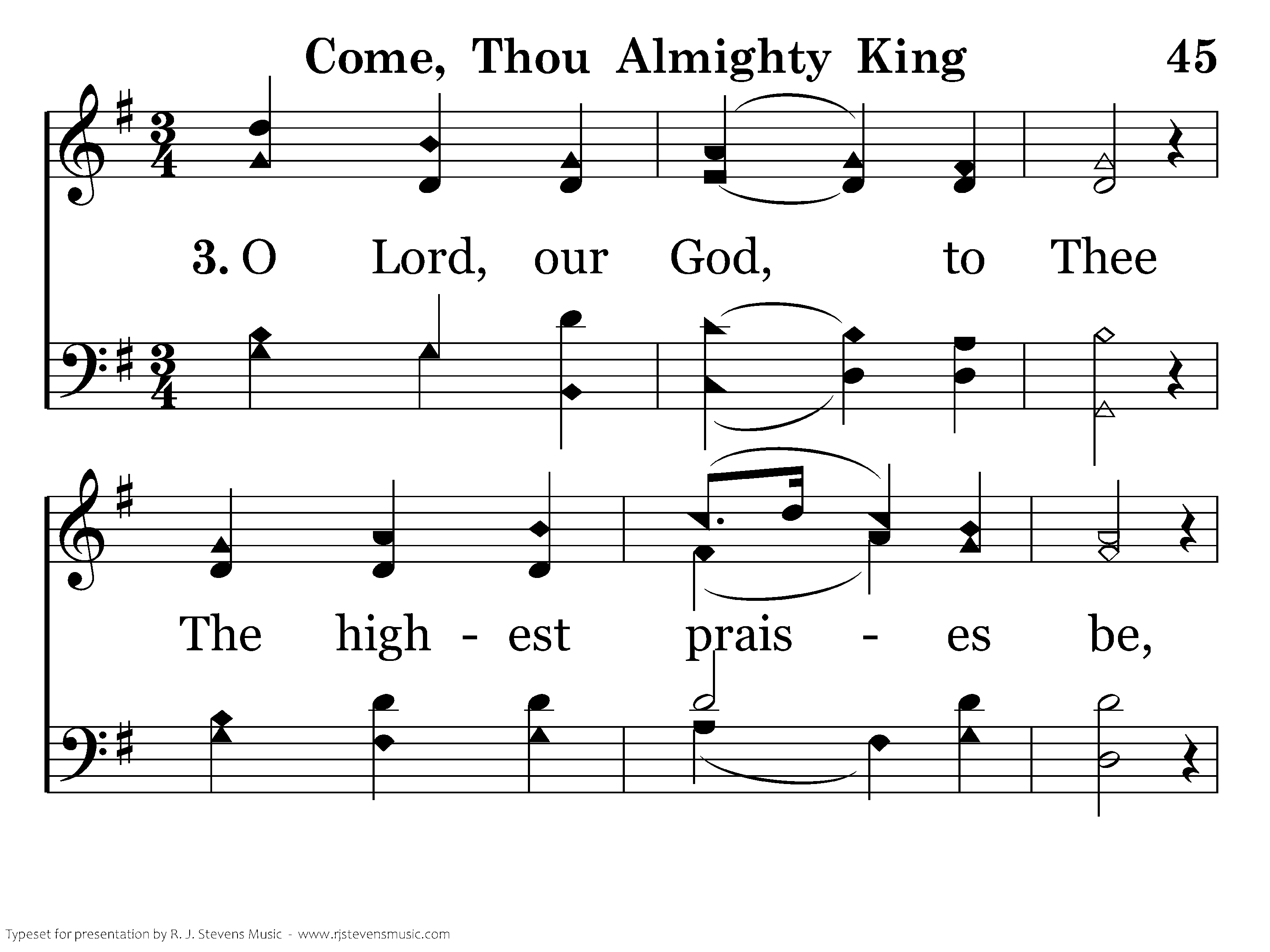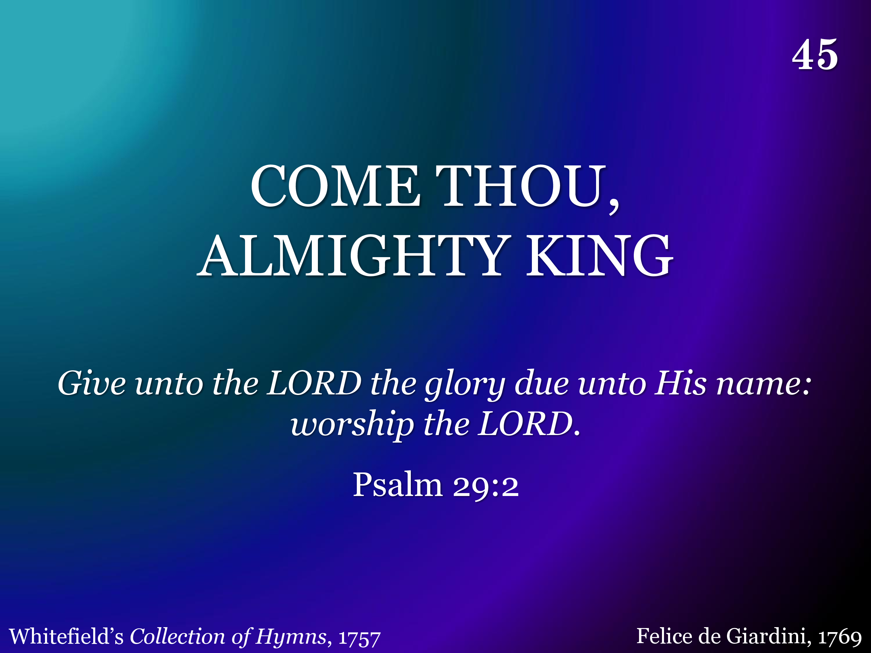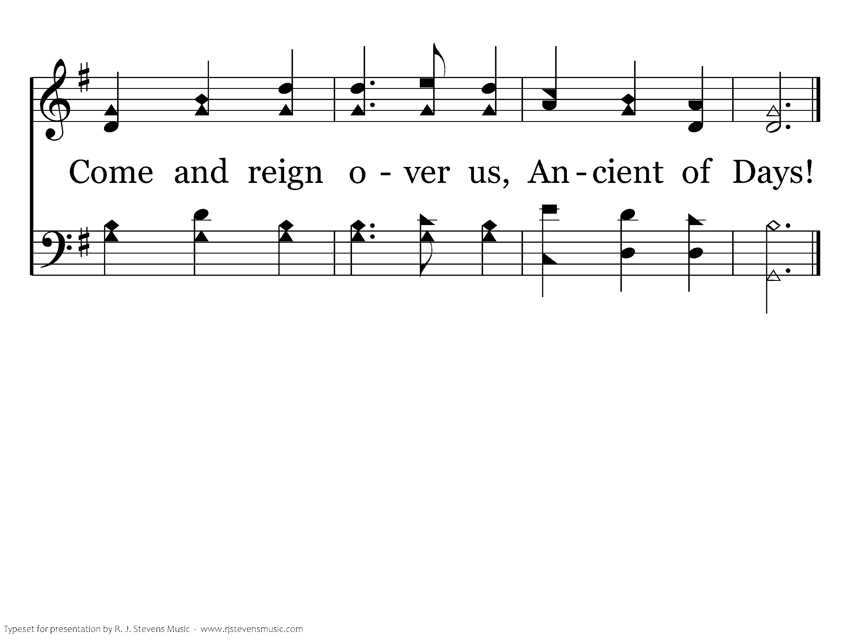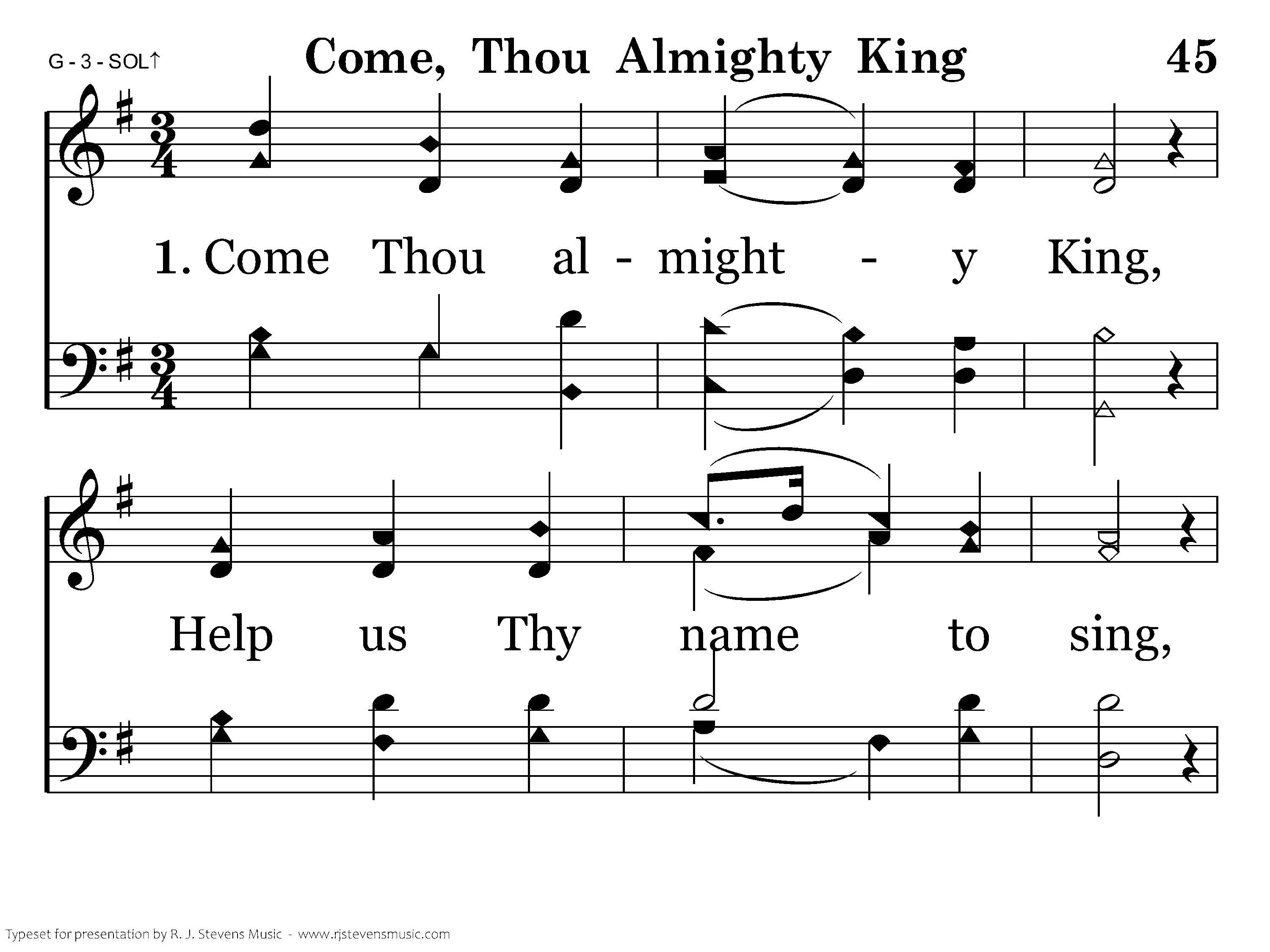 Come Thou almighty King, Help us Thy name to sing, Help us to praise! Father all glorious, O'er all victorious, Come and reign over us, Ancient of Days!