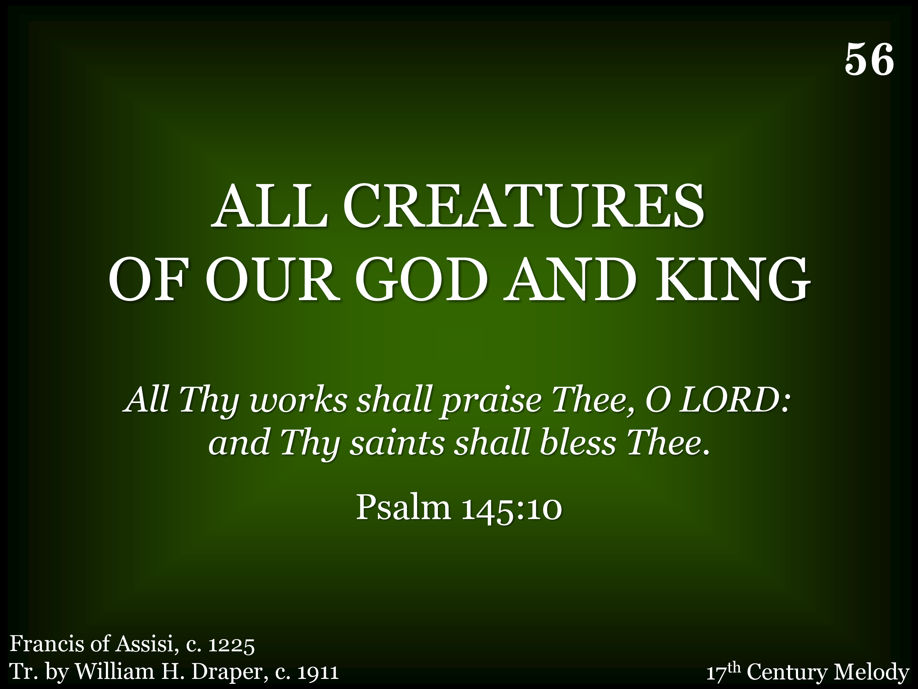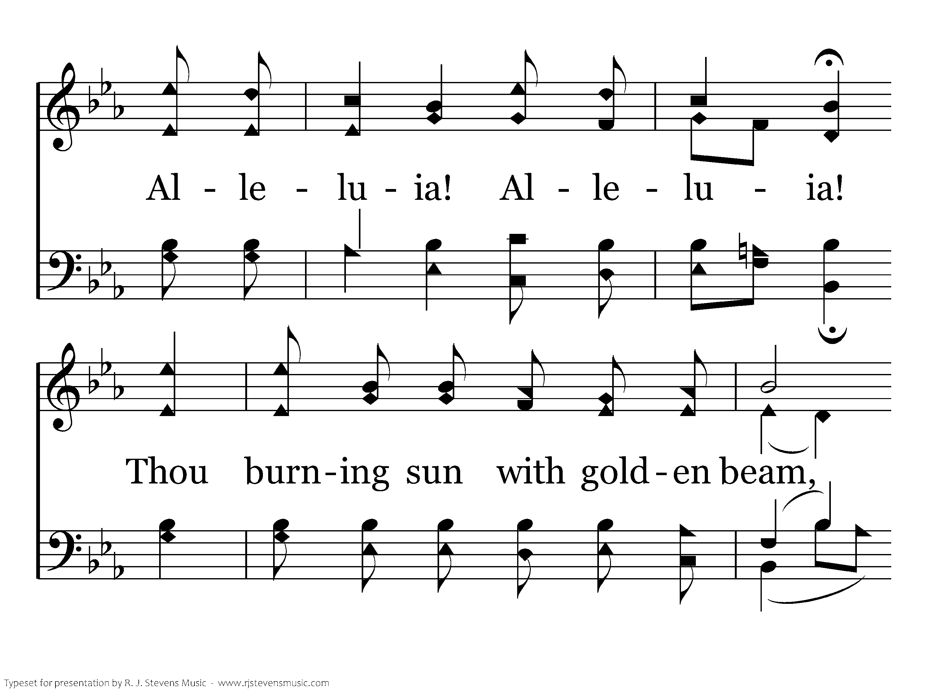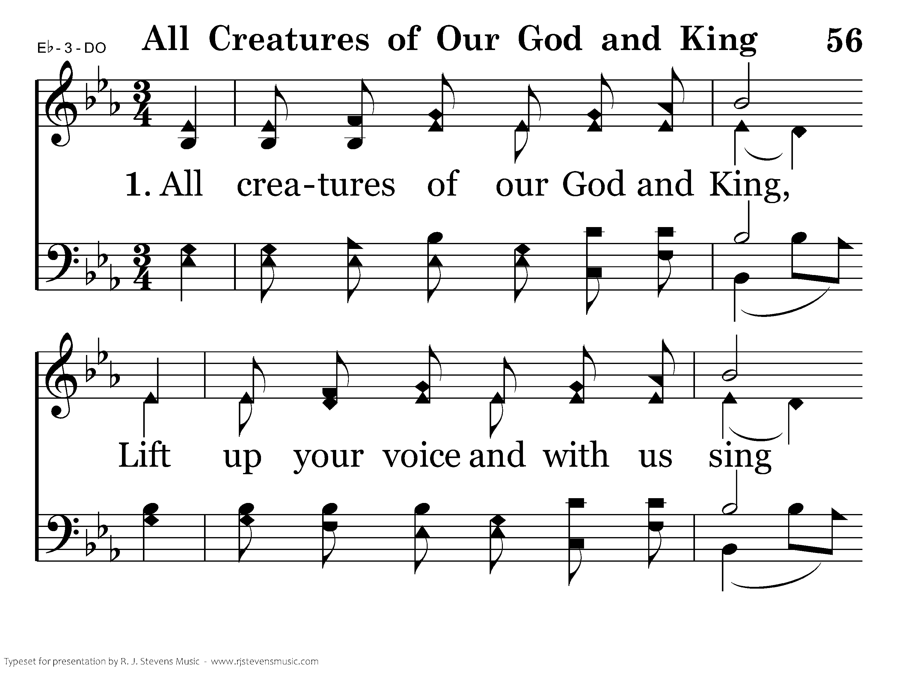 All creatures of our God and King, Lift up your voice and with us sing Alleluia! Alleluia! Thou burning sun with golden beam, Thou silver moon with softer gleam, O praise Him, O praise Him! Alleluia! Alleluia! Alleluia!