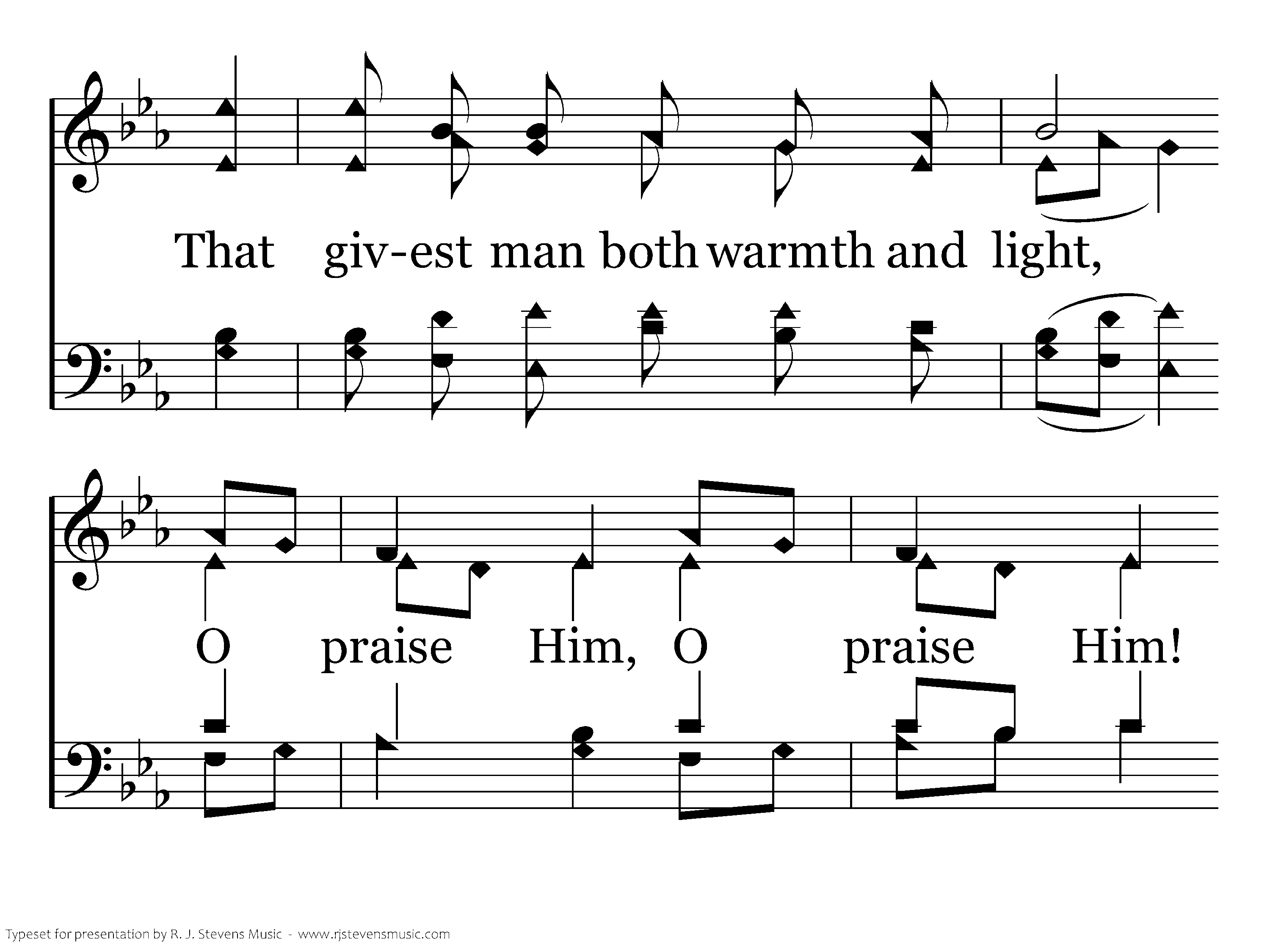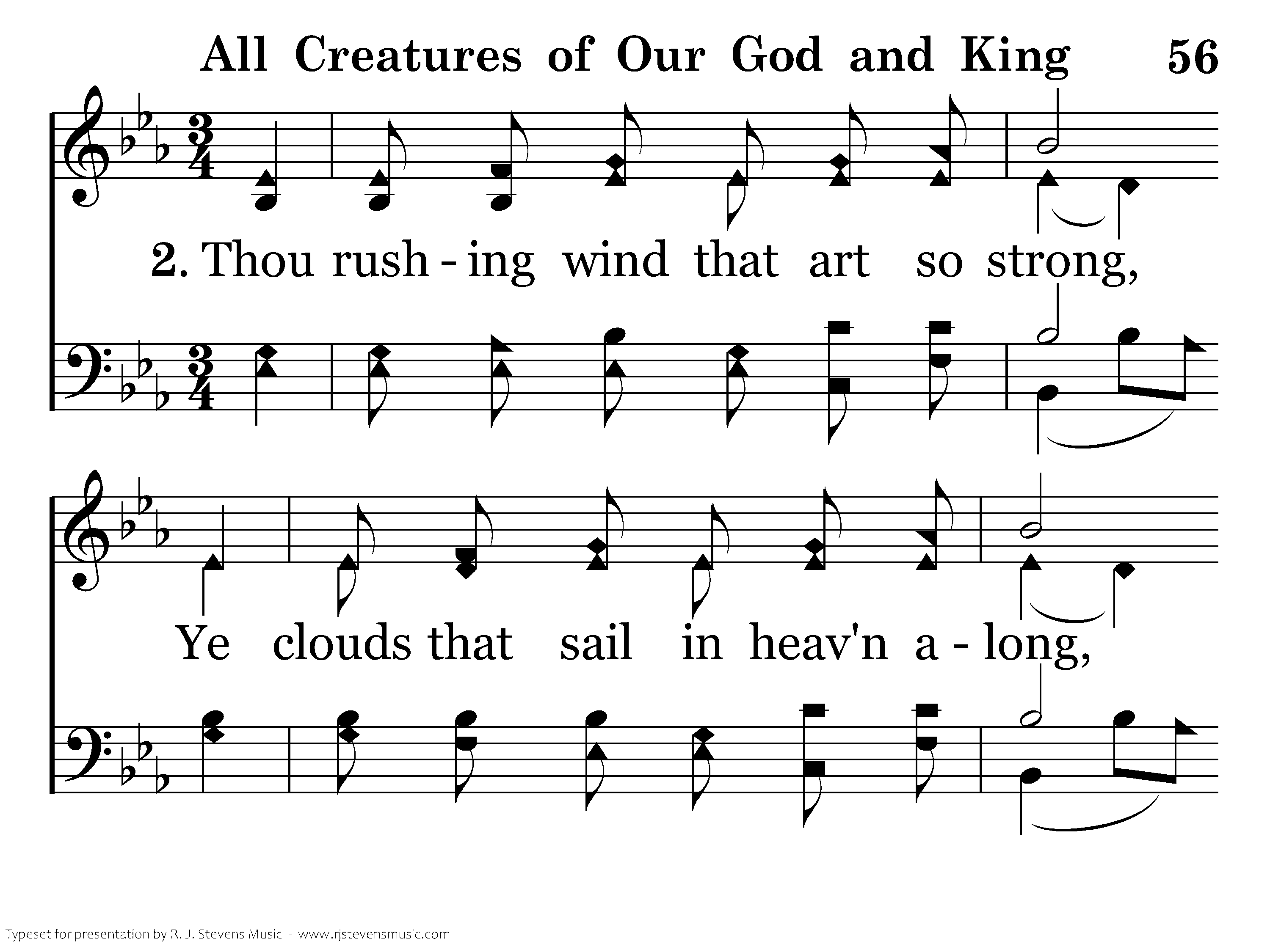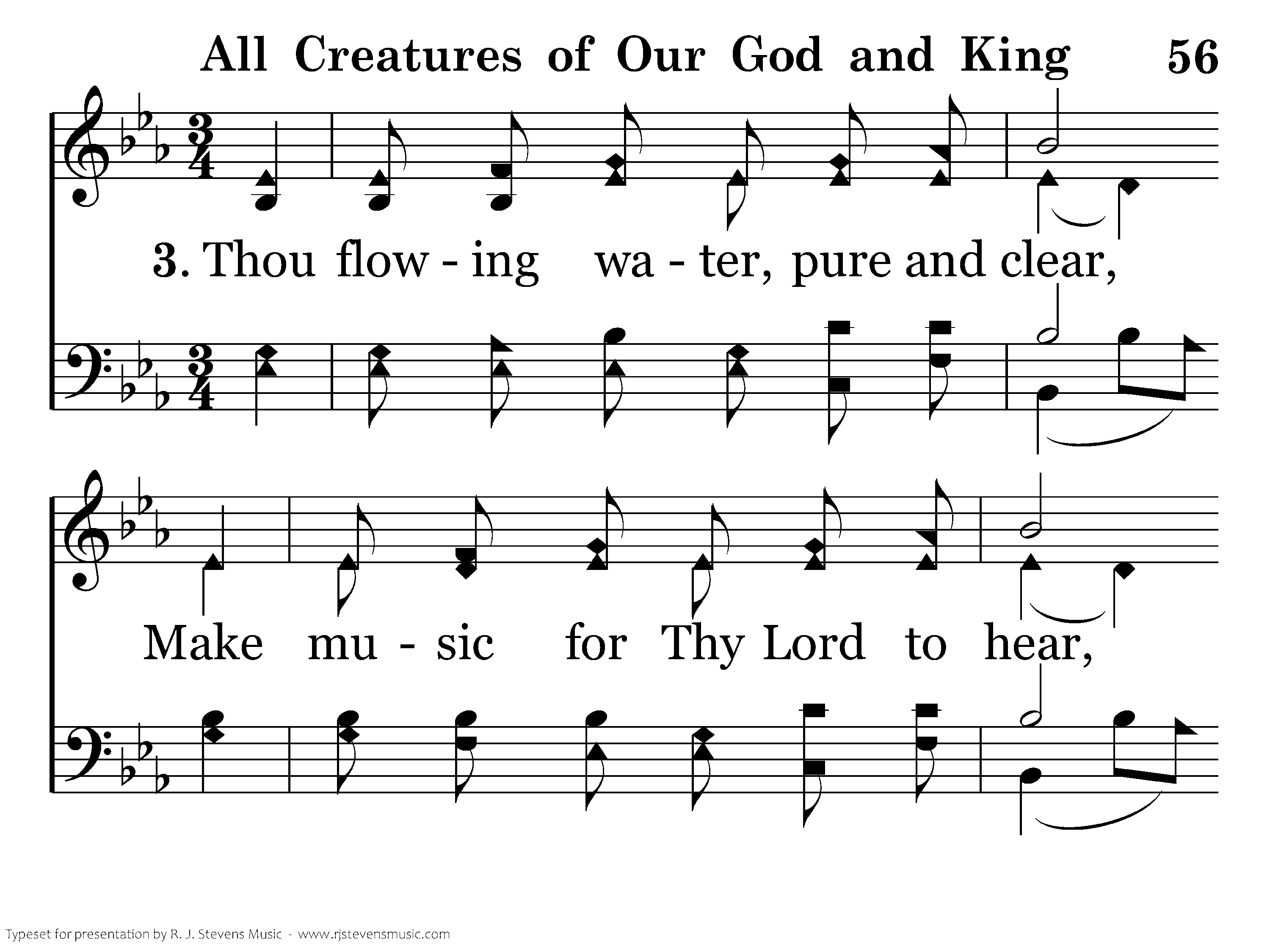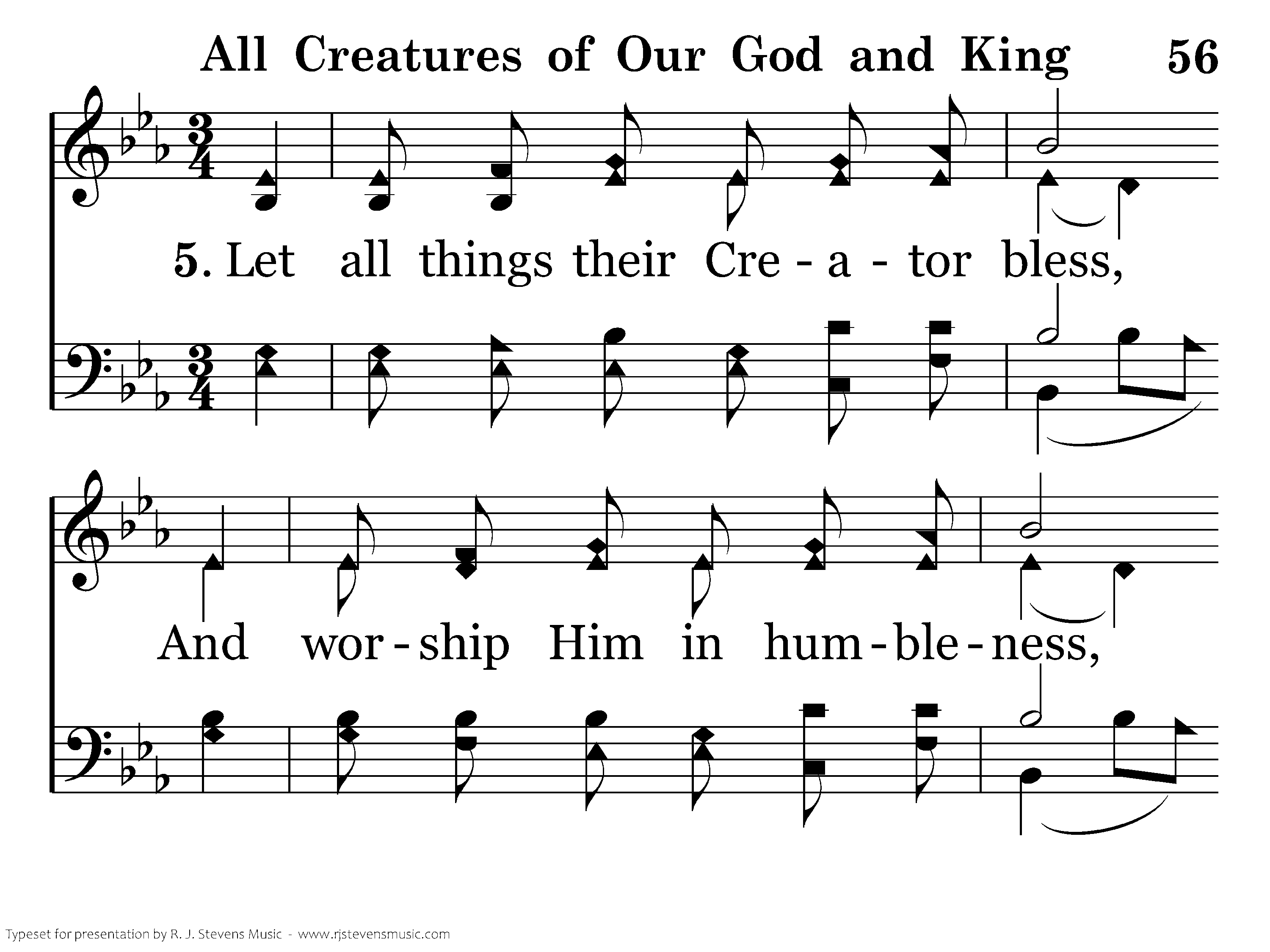 All creatures of our God and King, Lift up your voice and with us sing Alleluia! Alleluia! Thou burning sun with golden beam, Thou silver moon with softer gleam, O praise Him, O praise Him! Alleluia! Alleluia! Alleluia!