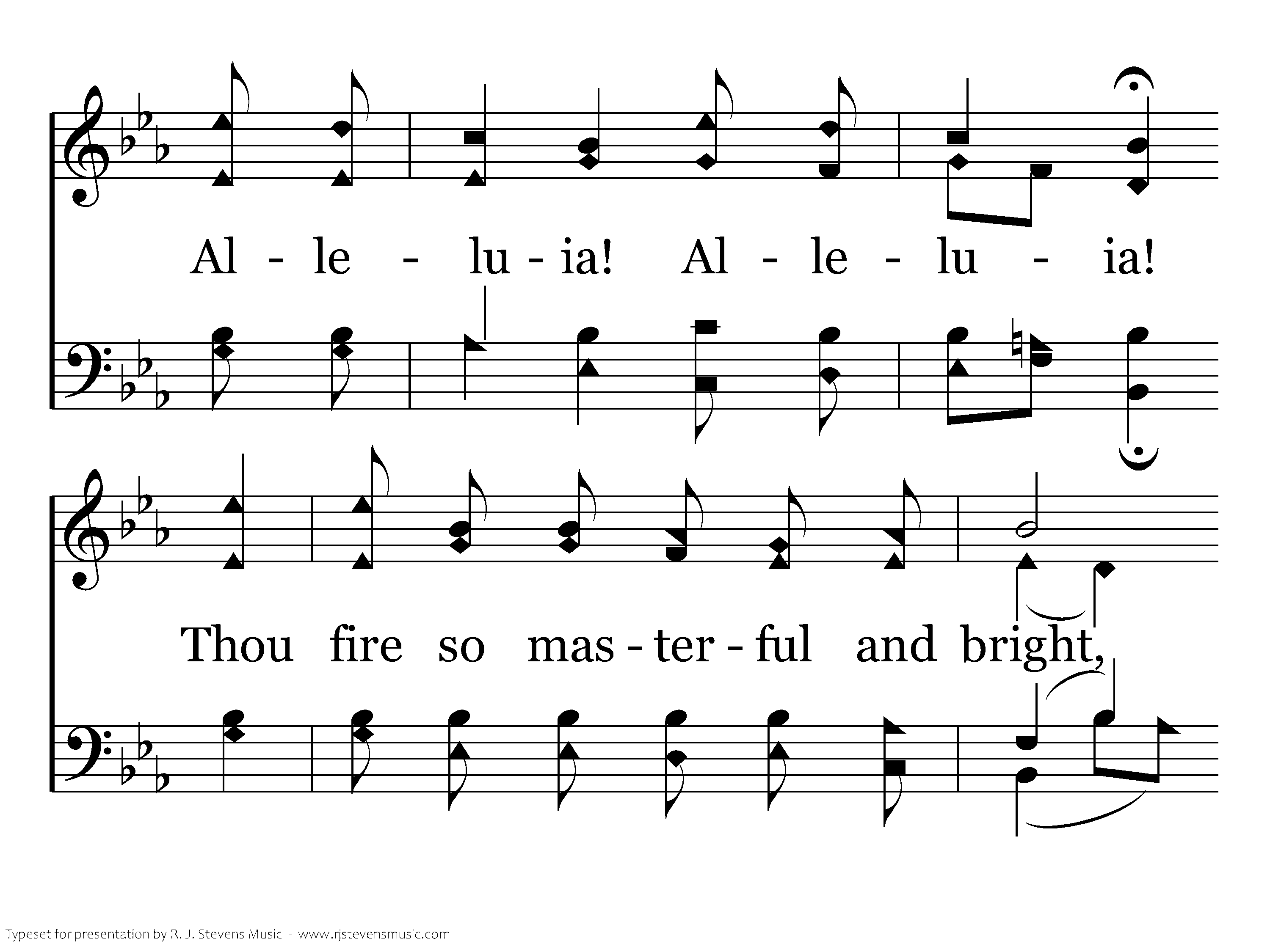 Thou flowing water, pure and clear, Make music for Thy Lord to hear, Alleluia! Alleluia! Thou fire so masterful and bright, That givest man both warmth and light, O praise Him, O praise Him! Alleluia! Alleluia! Alleluia!