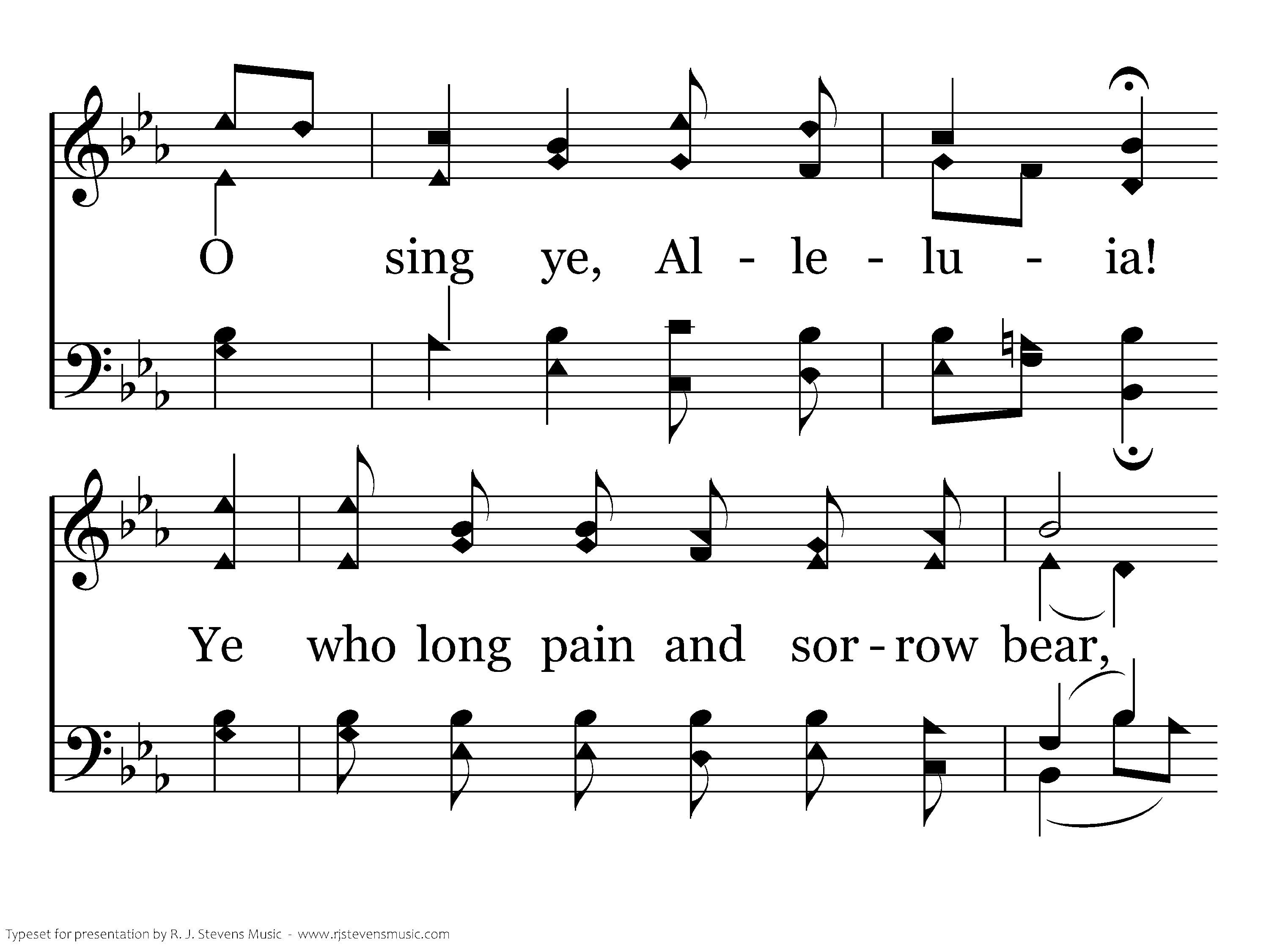 And all ye men of tender heart, Forgiving others, take your part, O sing ye, Alleluia! Ye who long pain and sorrow bear, Praise God and on Him cast your care! O praise Him, O praise Him! Alleluia! Alleluia! Alleluia!