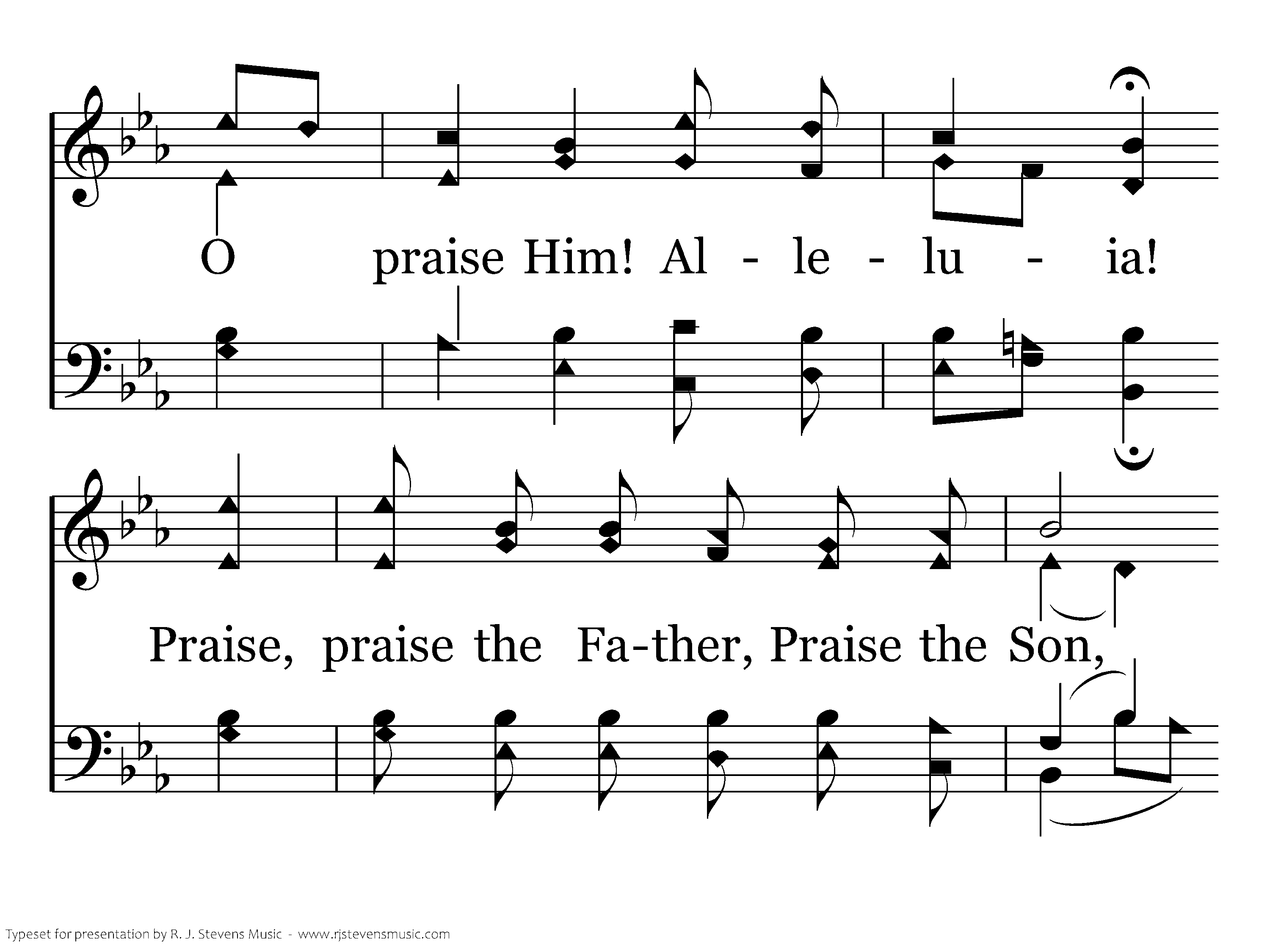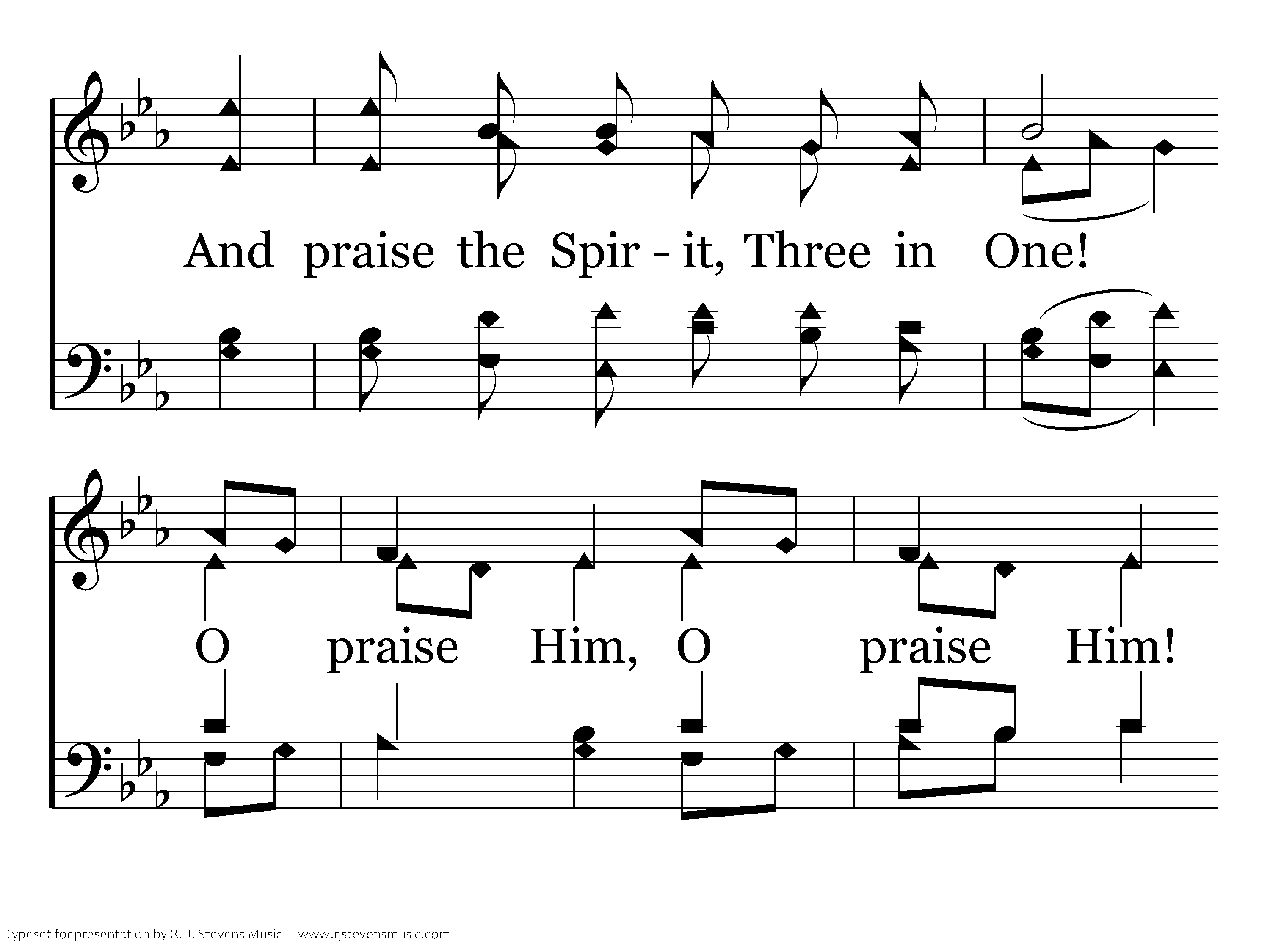 Let all things their Creator bless, And worship Him in humbleness, O praise Him! Alleluia! Praise, praise the Father, Praise the Son, And praise the Spirit, Three in One! O praise Him, O praise Him! Alleluia! Alleluia! Alleluia!