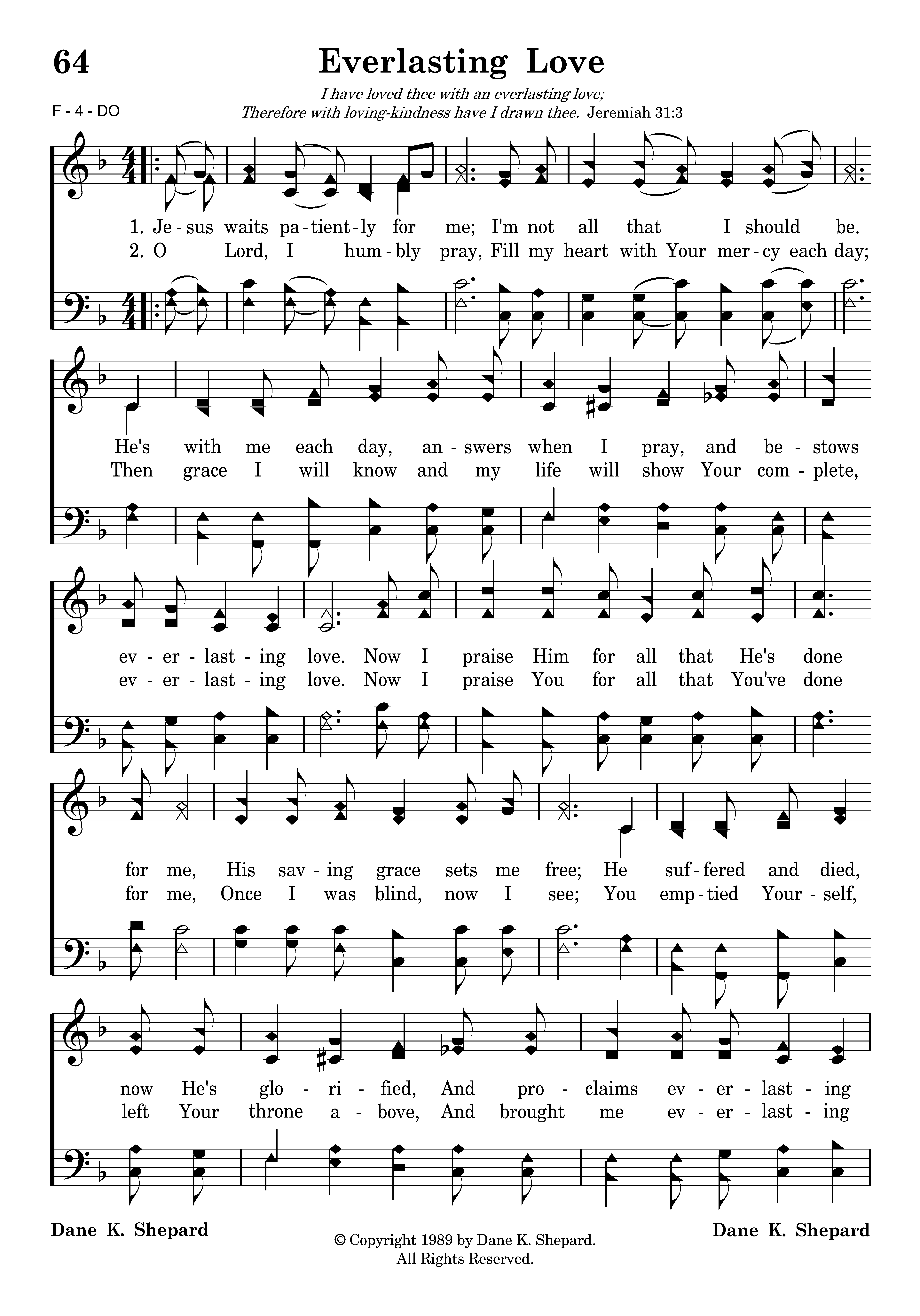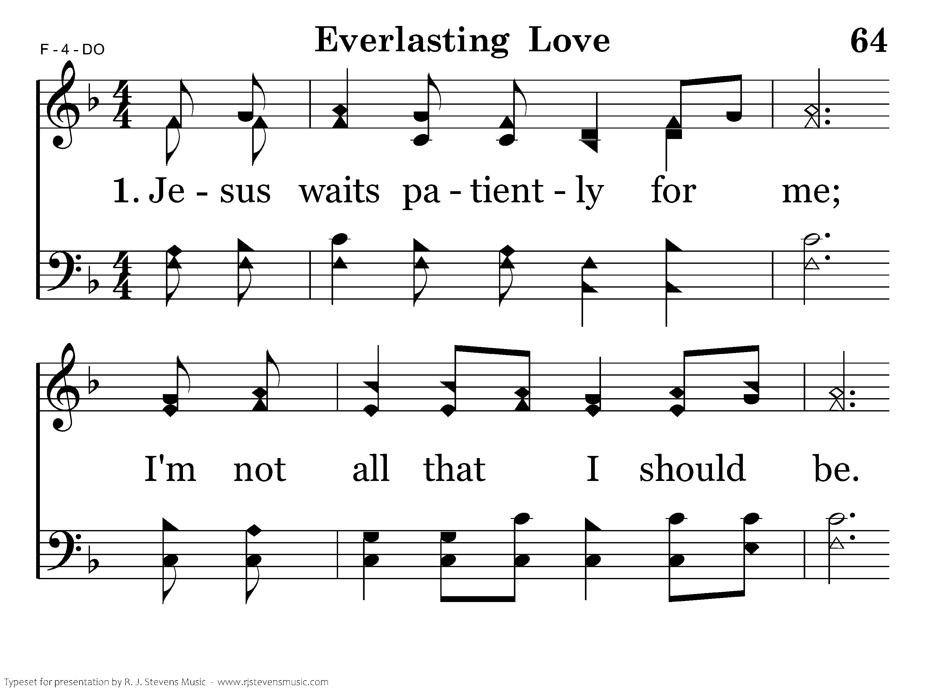 Jesus waits patiently for me; I'm not all that I should be. He's with me each day, answers when I pray, and bestows everlasting love. Now I praise Him for all that He's done for me, His saving grace sets me free; He suffered and died, now He's glorified, and proclaims everlasting love.