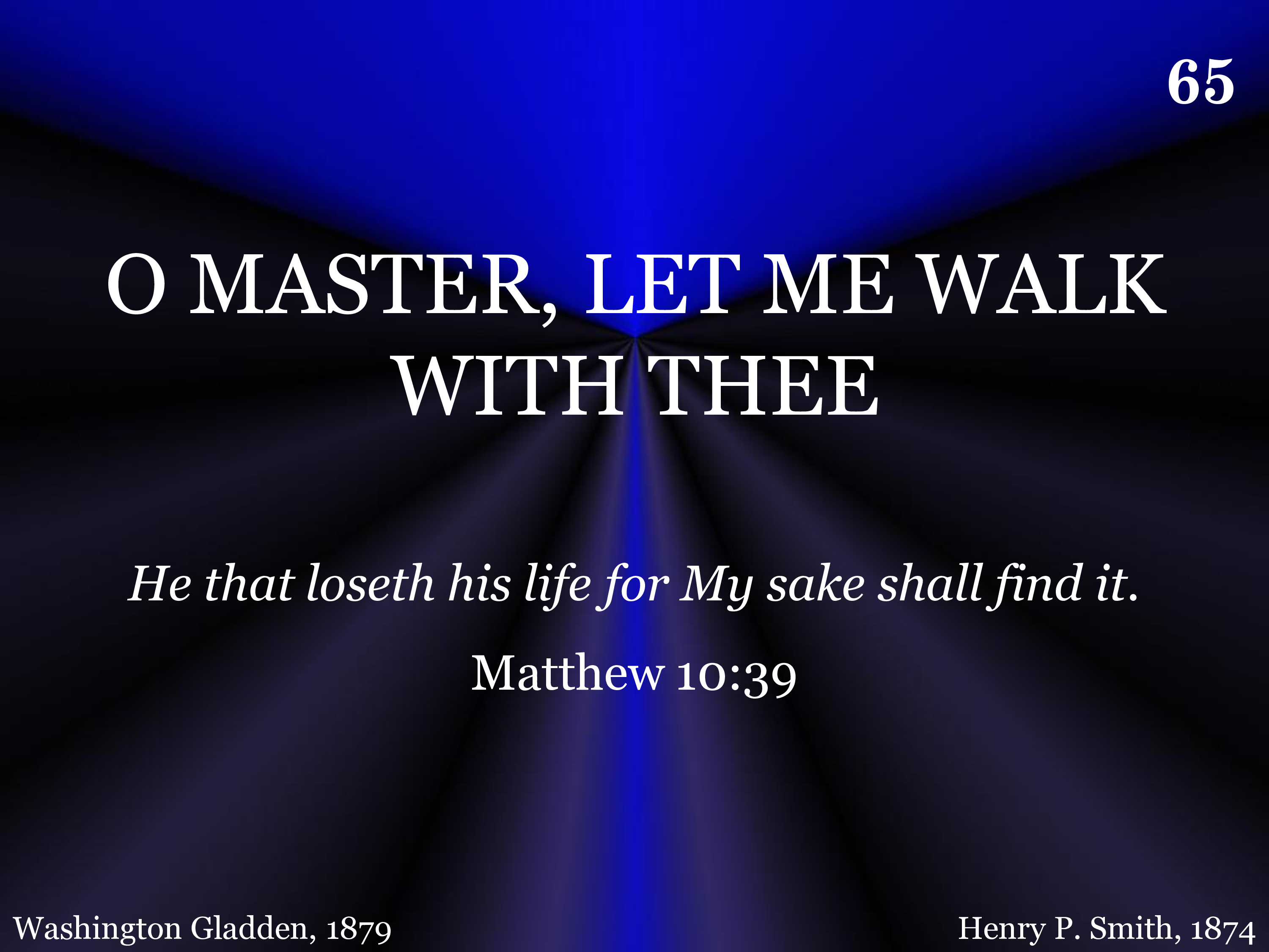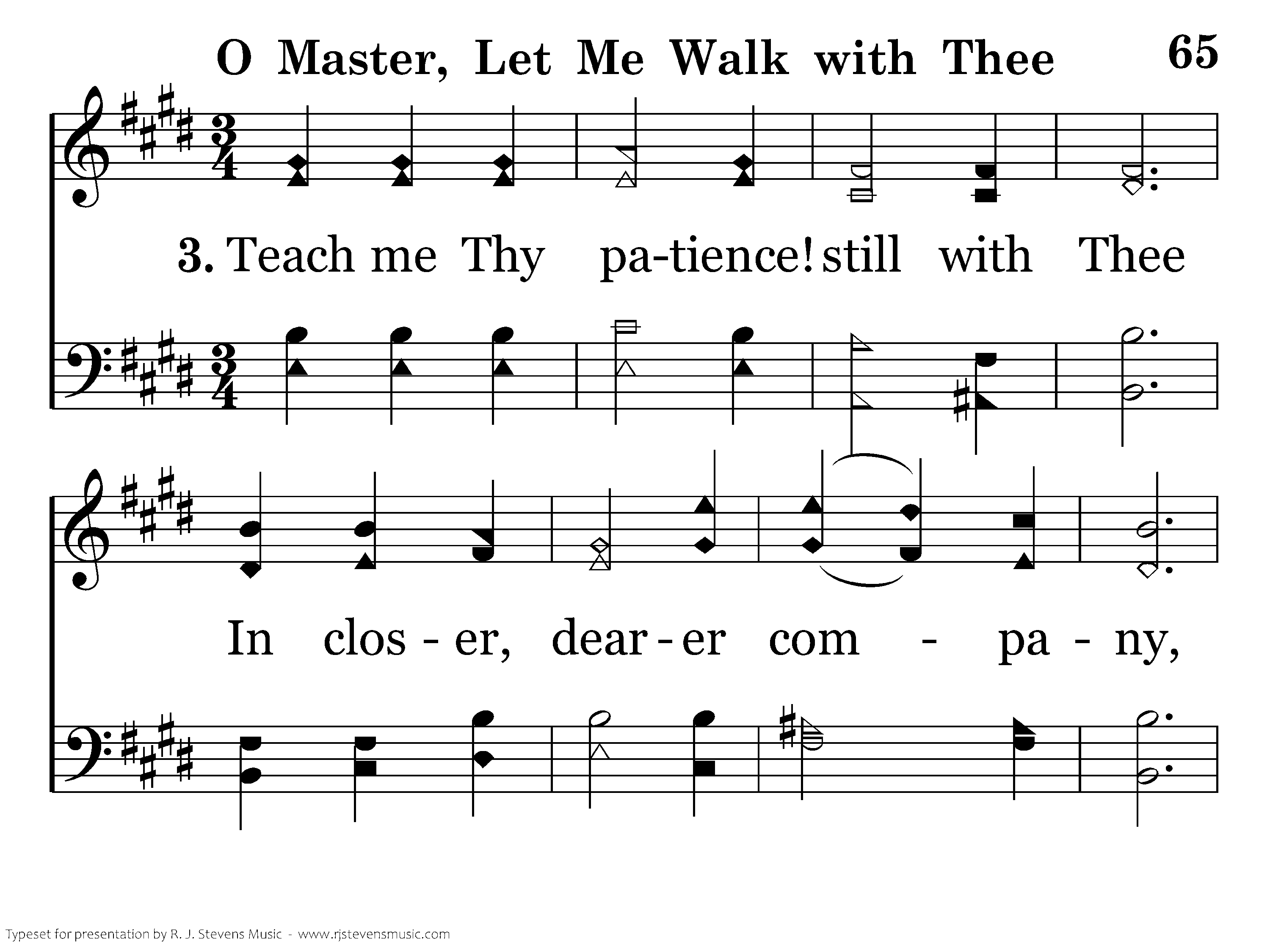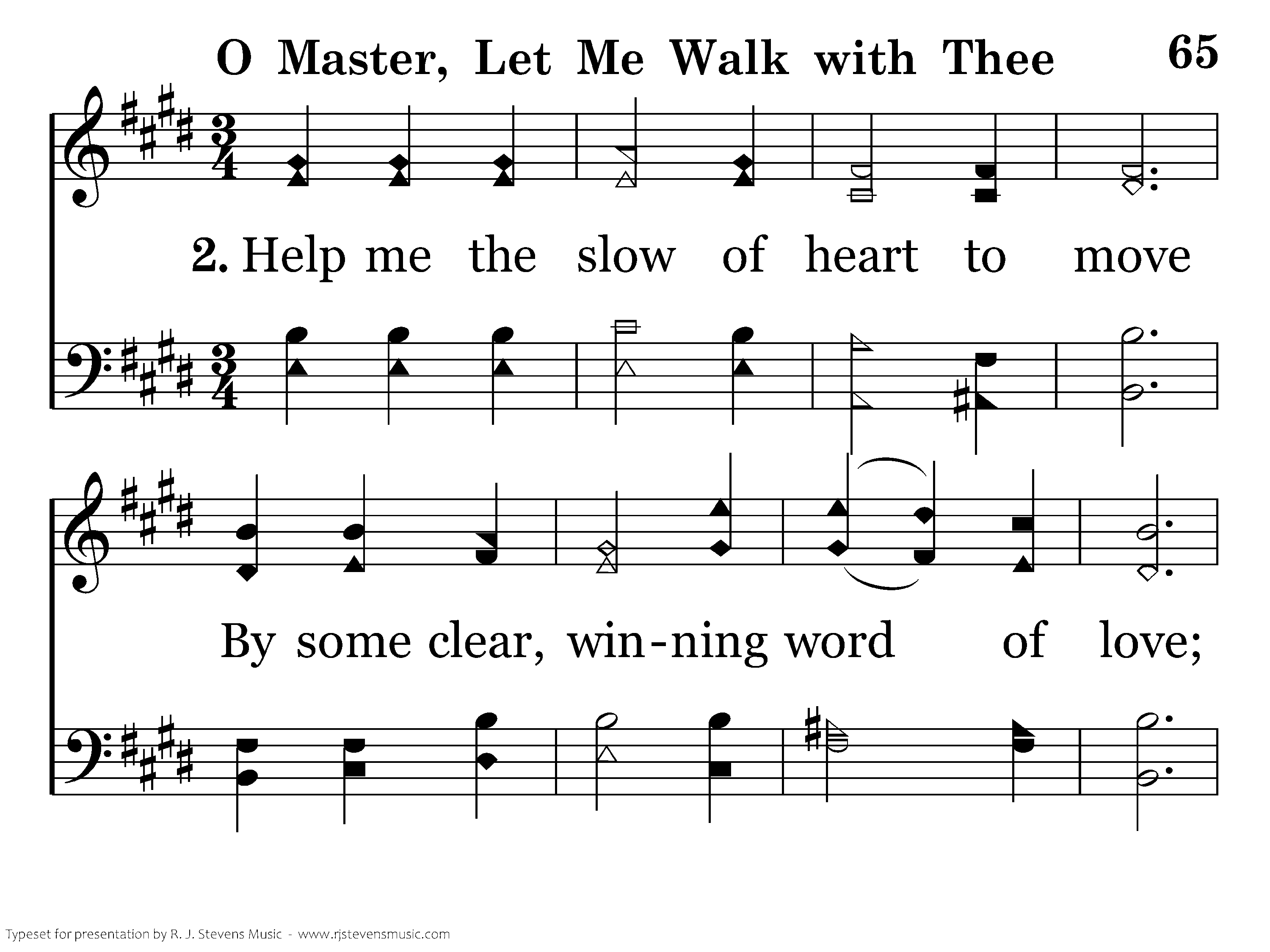 O Master, let me walk with Thee In lowly paths of service free; Tell me Thy secret; help me bear The strain of toil, the fret of care.