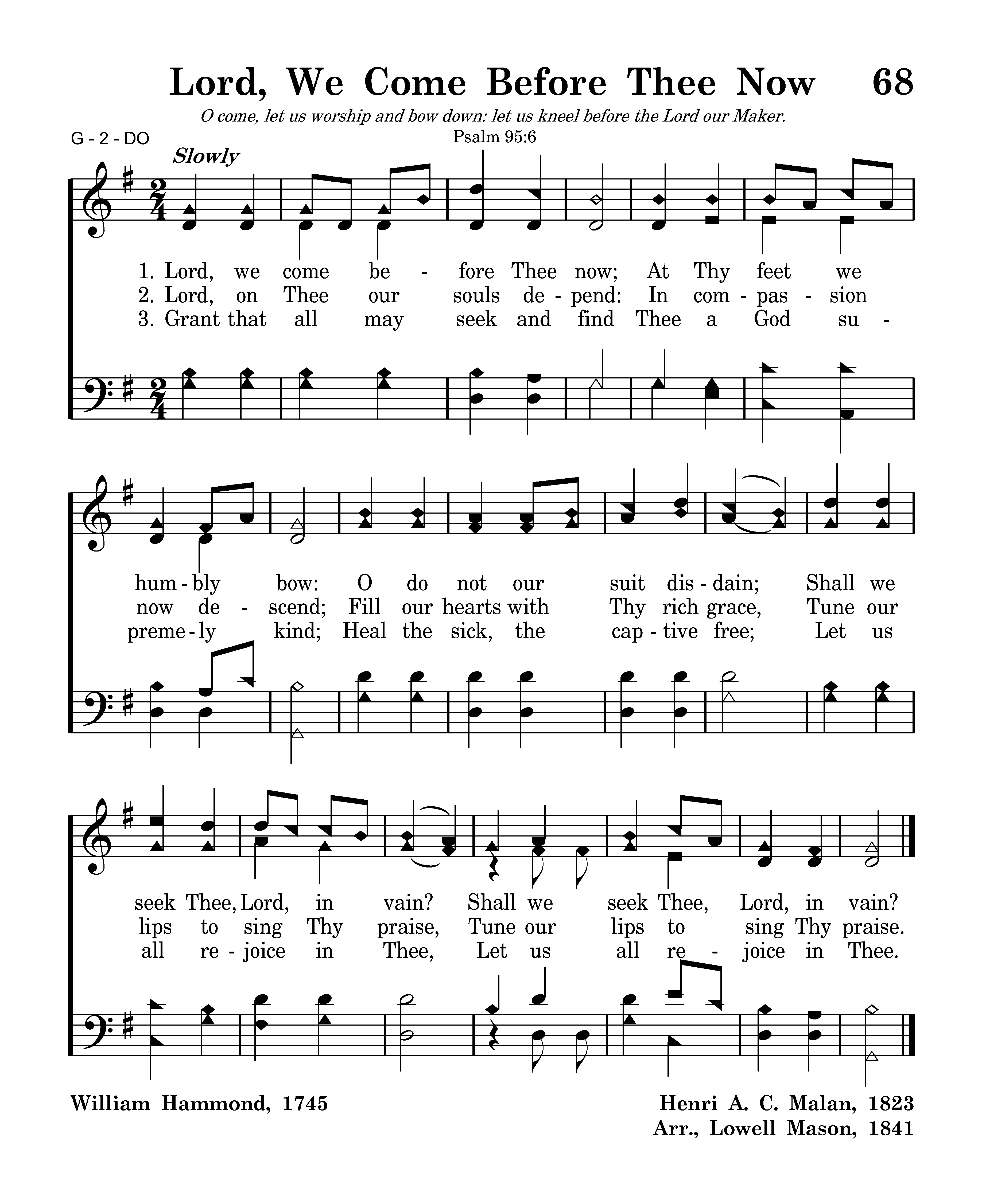 Lord, we come before Thee now; At Thy feet we humbly bow: O do not our suit disdain; Shall we seek Thee, Lord in vain? Shall we seek Thee, Lord in vain?