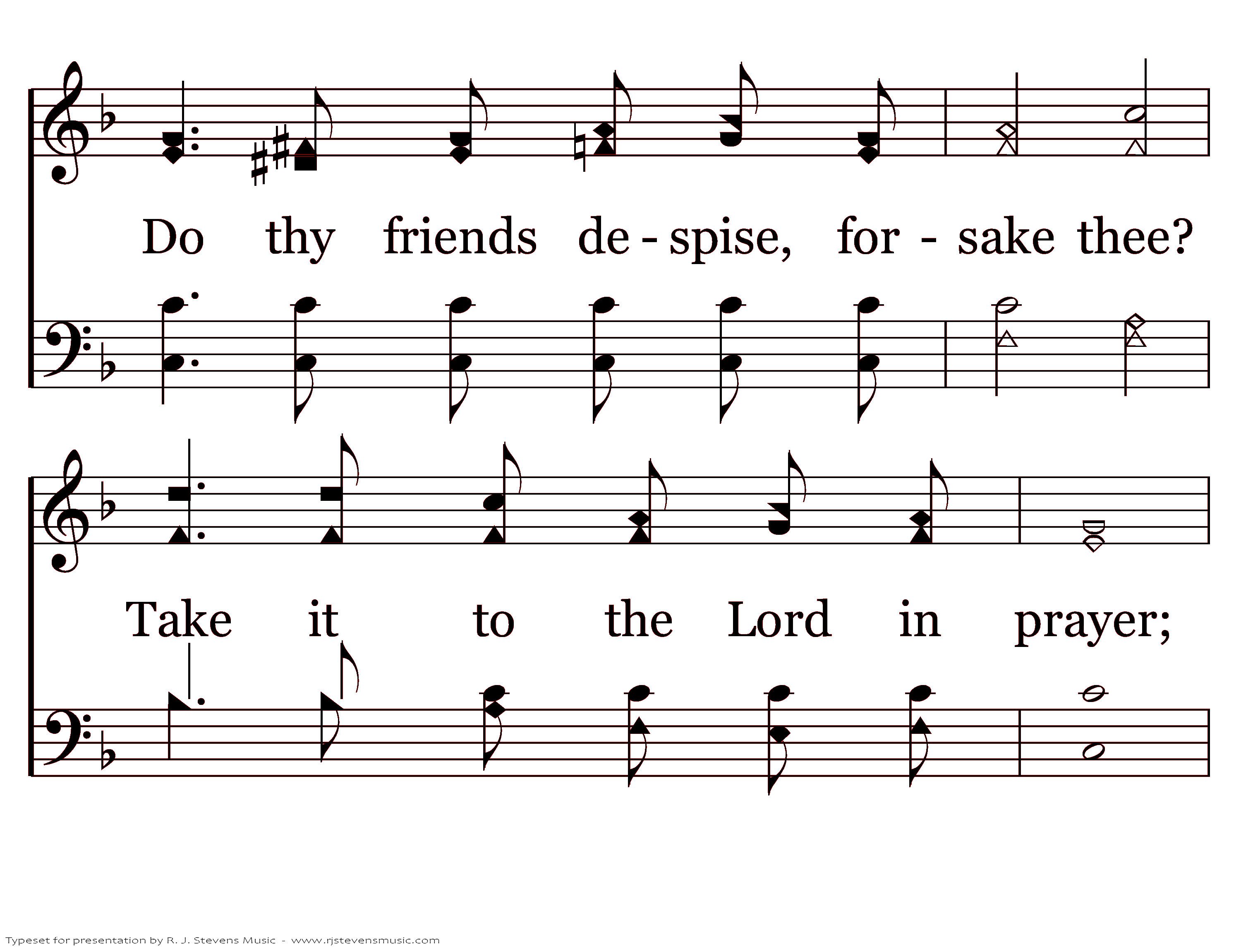 What a friend we have in Jesus, All our sins and griefs to bear; What a privilege to carry Ev'rything to God in prayer. O what peace we often forfeit, O what needless pain we bear, All because we do not carry Everything to God in prayer.