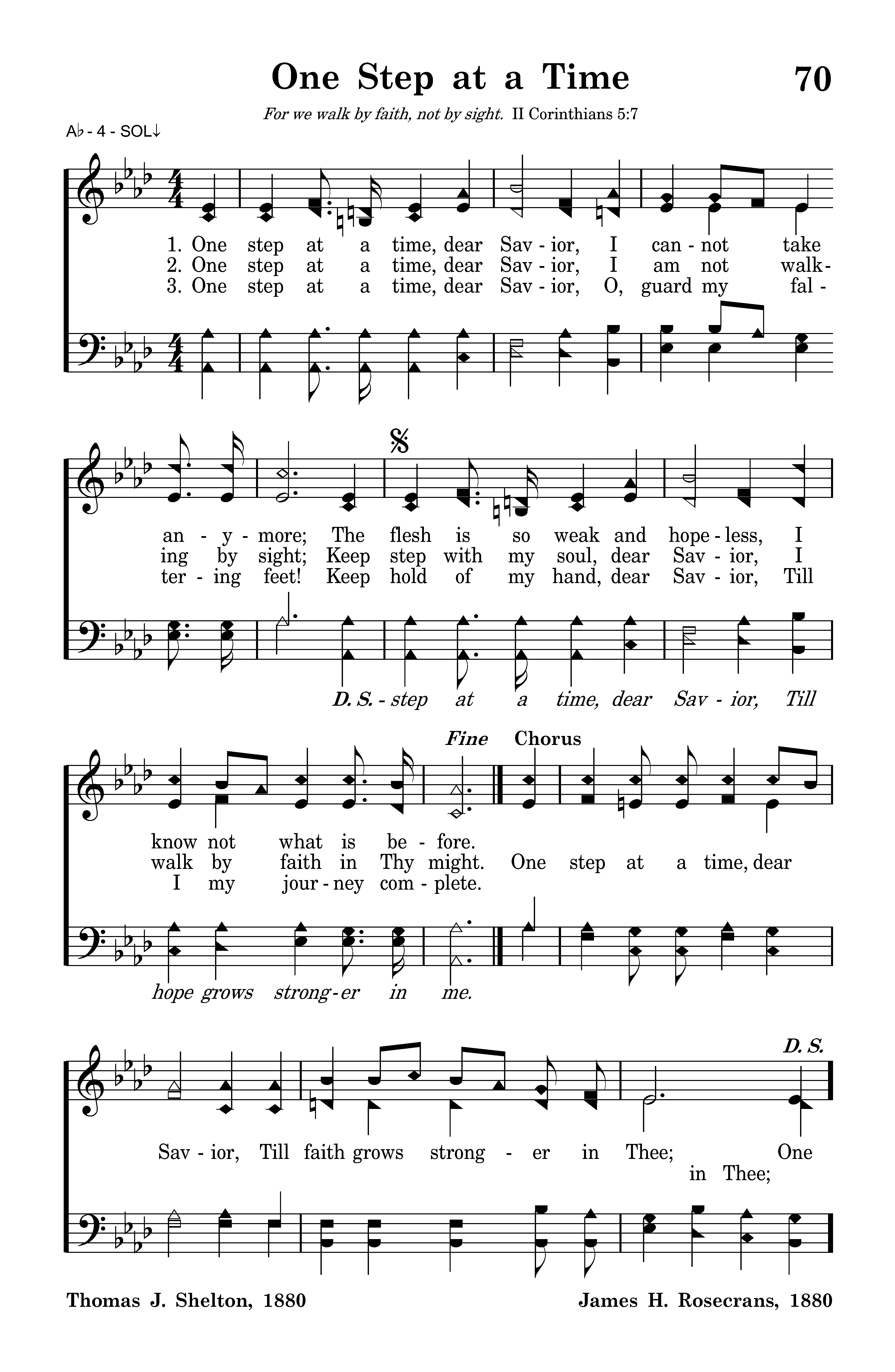 One step at a time, dear Savior, I cannot take anymore; The flesh is so weak and hopeless, I know not what is before.