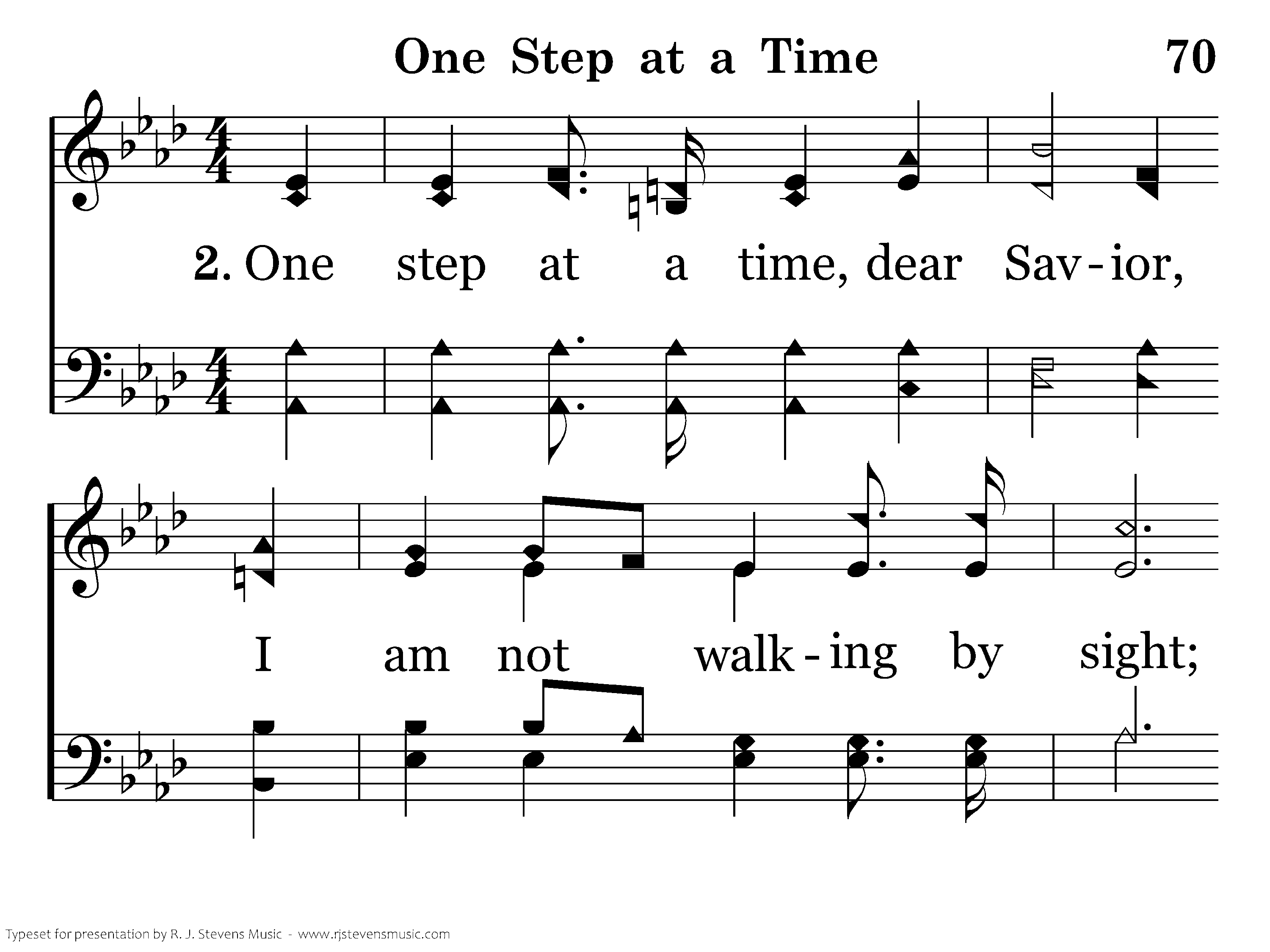 One step at a time, dear Savior, I am not walking by sight; Keep step with my soul, dear Savior, I walk by faith in Thy might.