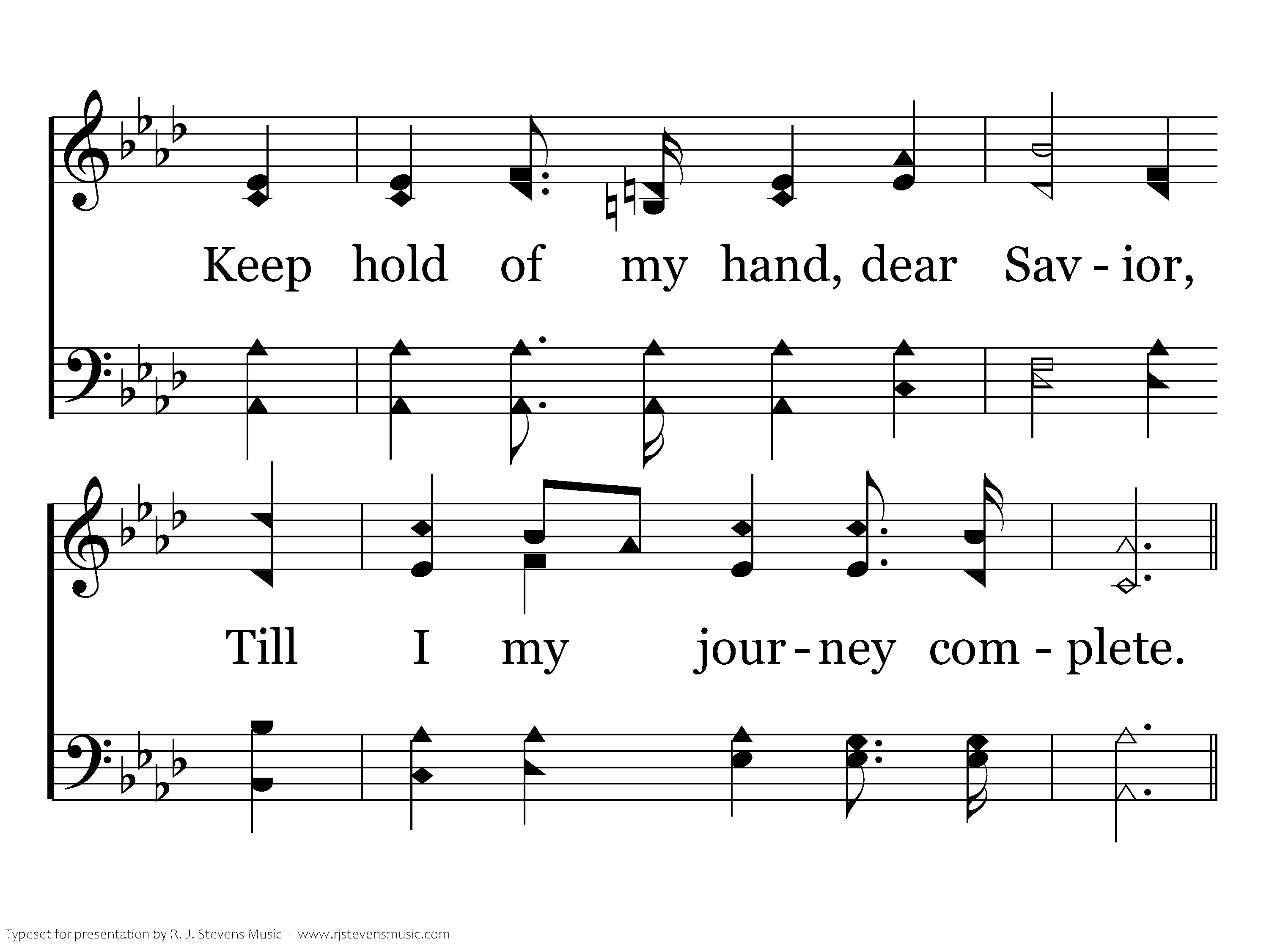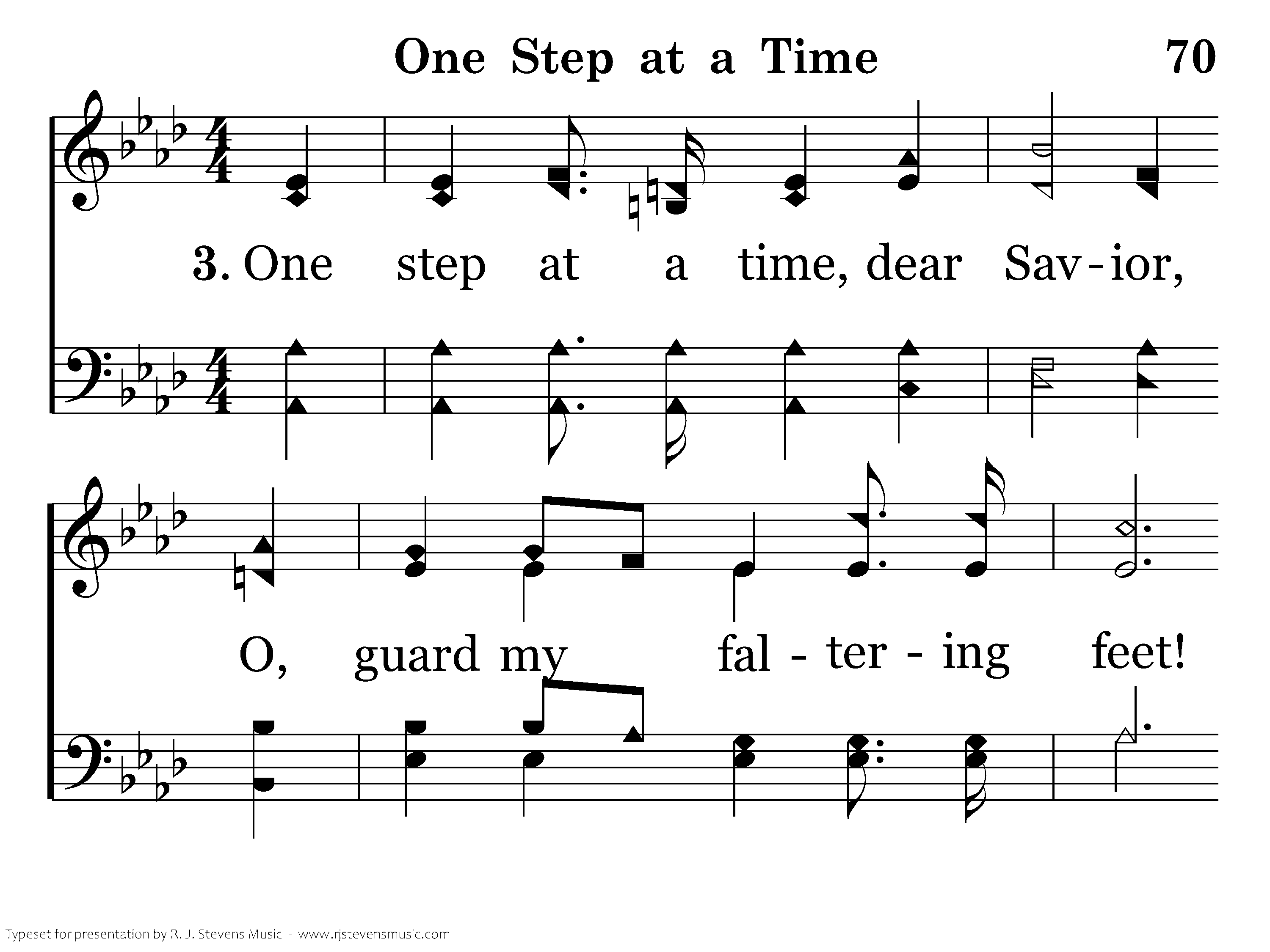 One step at a time, dear Savior, O, guard my faltering feet! Keep hold of my hand, dear Savior, Till I my journey complete.