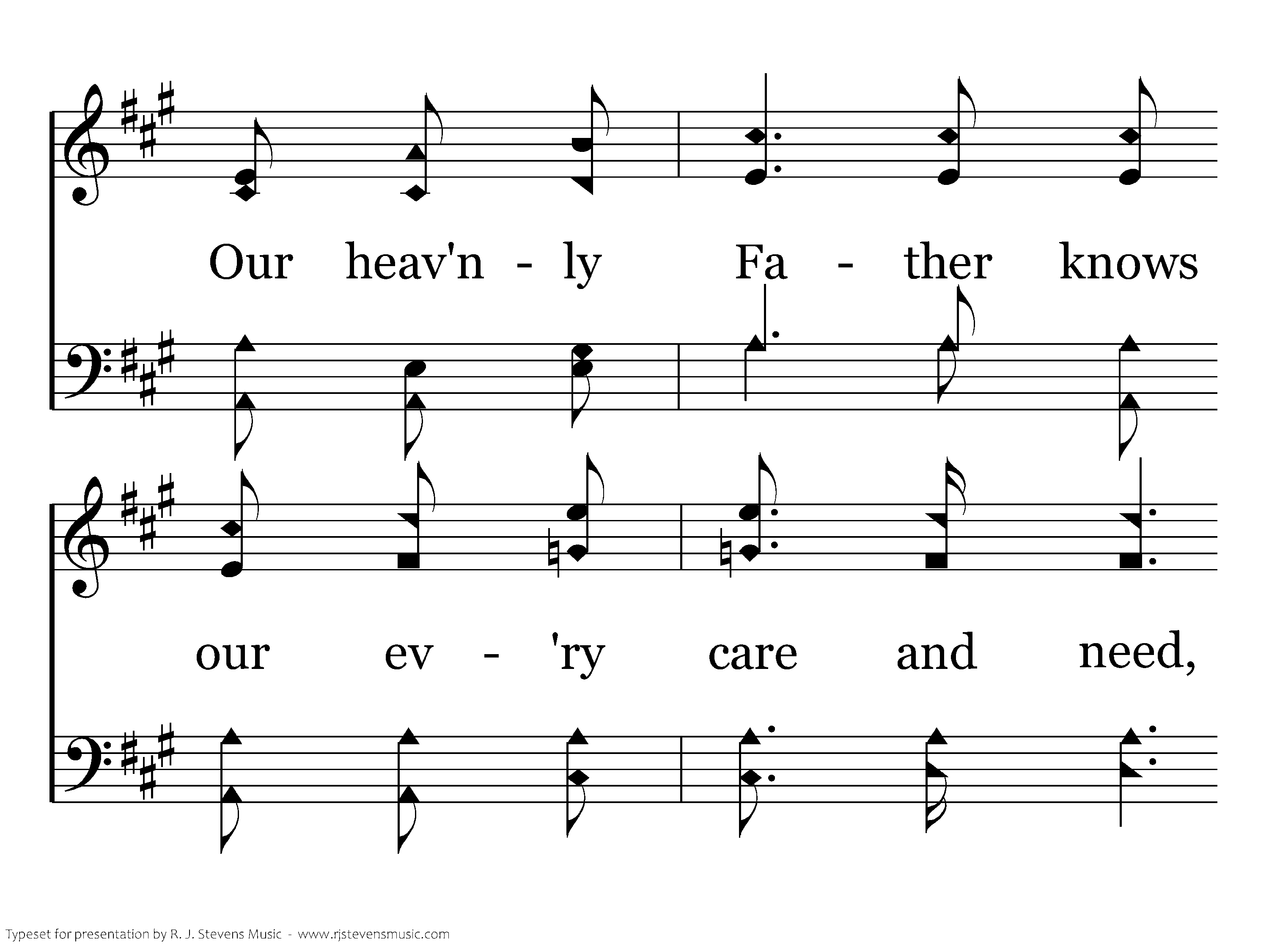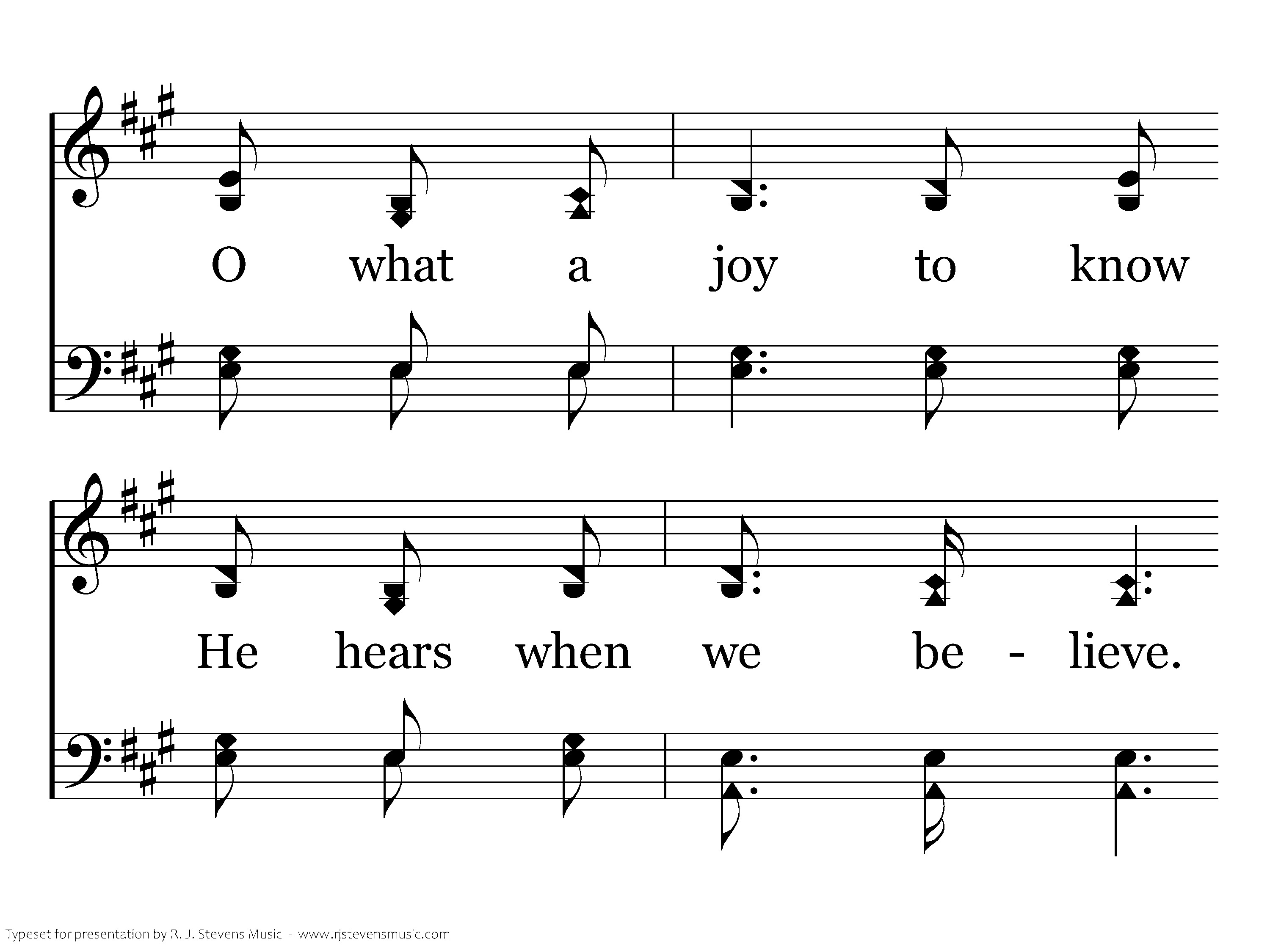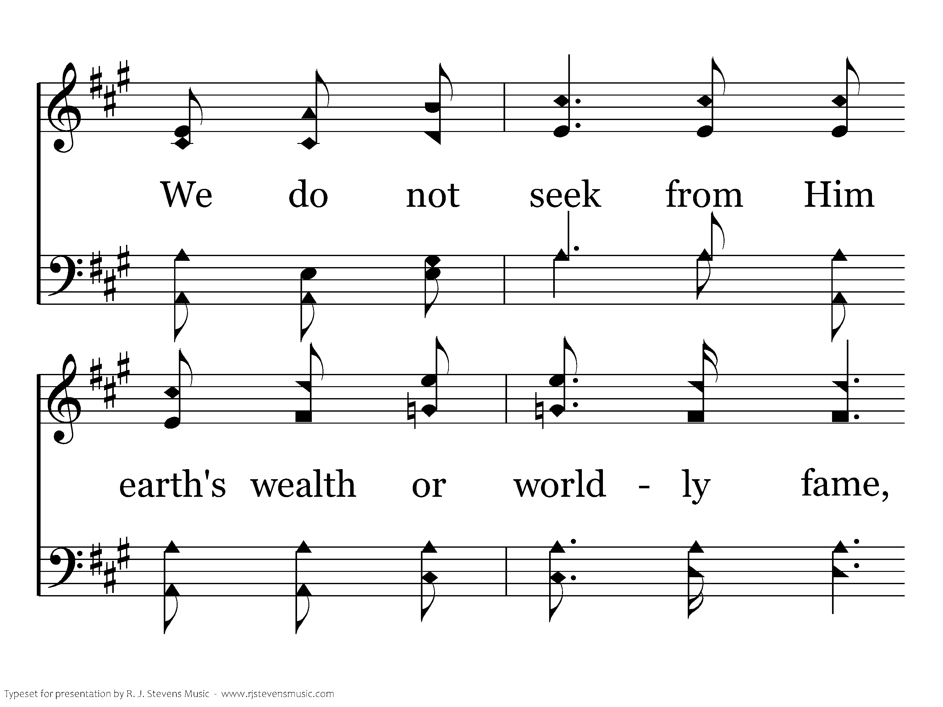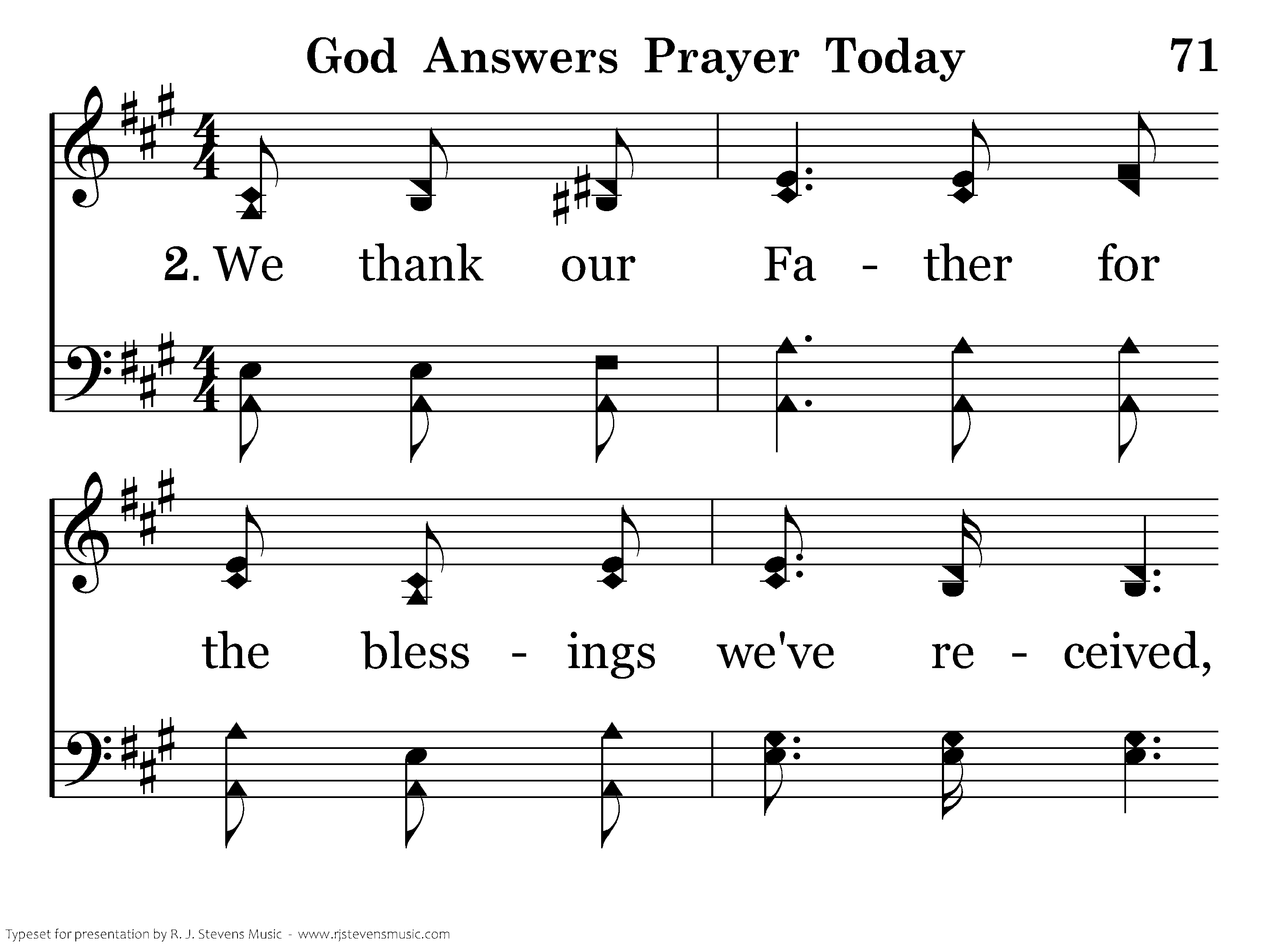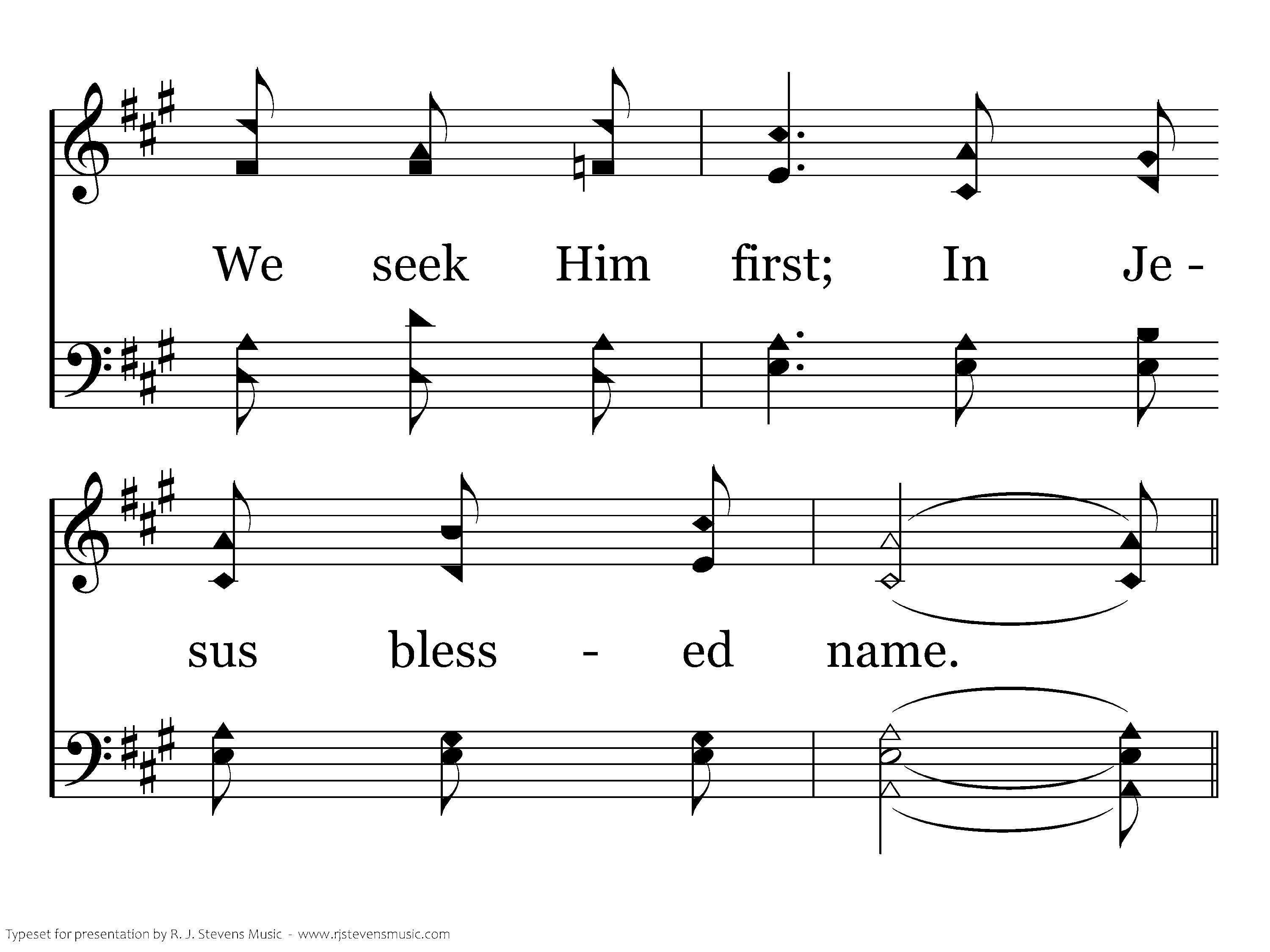We thank our Father for the blessings we've received, O what a joy to know He hears when we believe. We do not seek from Him earth's wealth or wordly fame, We seek Him first; In Jesus' blessed name.