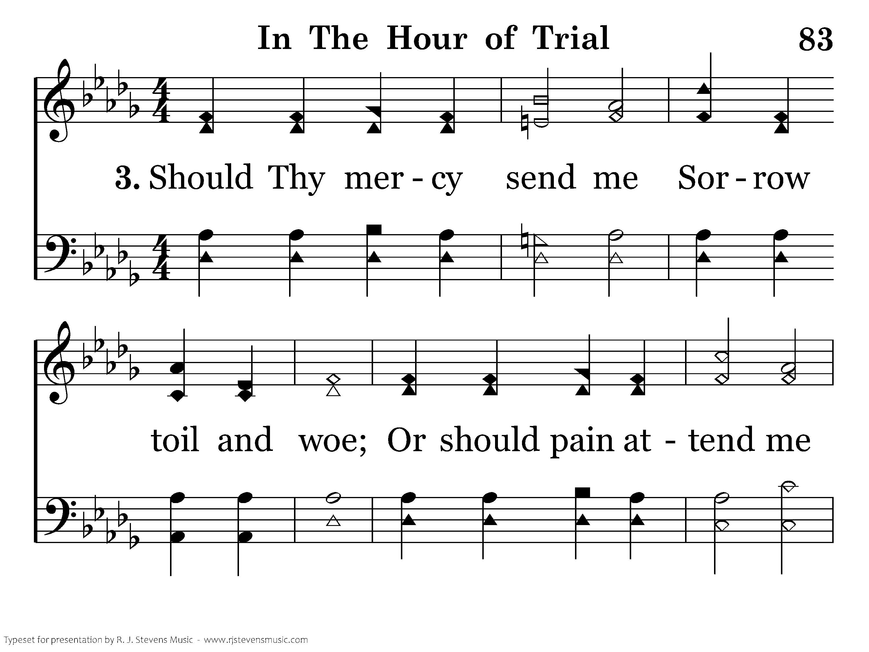 Should Thy mercy send me Sorrow toil and woe; Or should pain attend me On my path below; Grant that I may never Fail Thy hand to see, Grant that I may ever Cast my care on Thee.