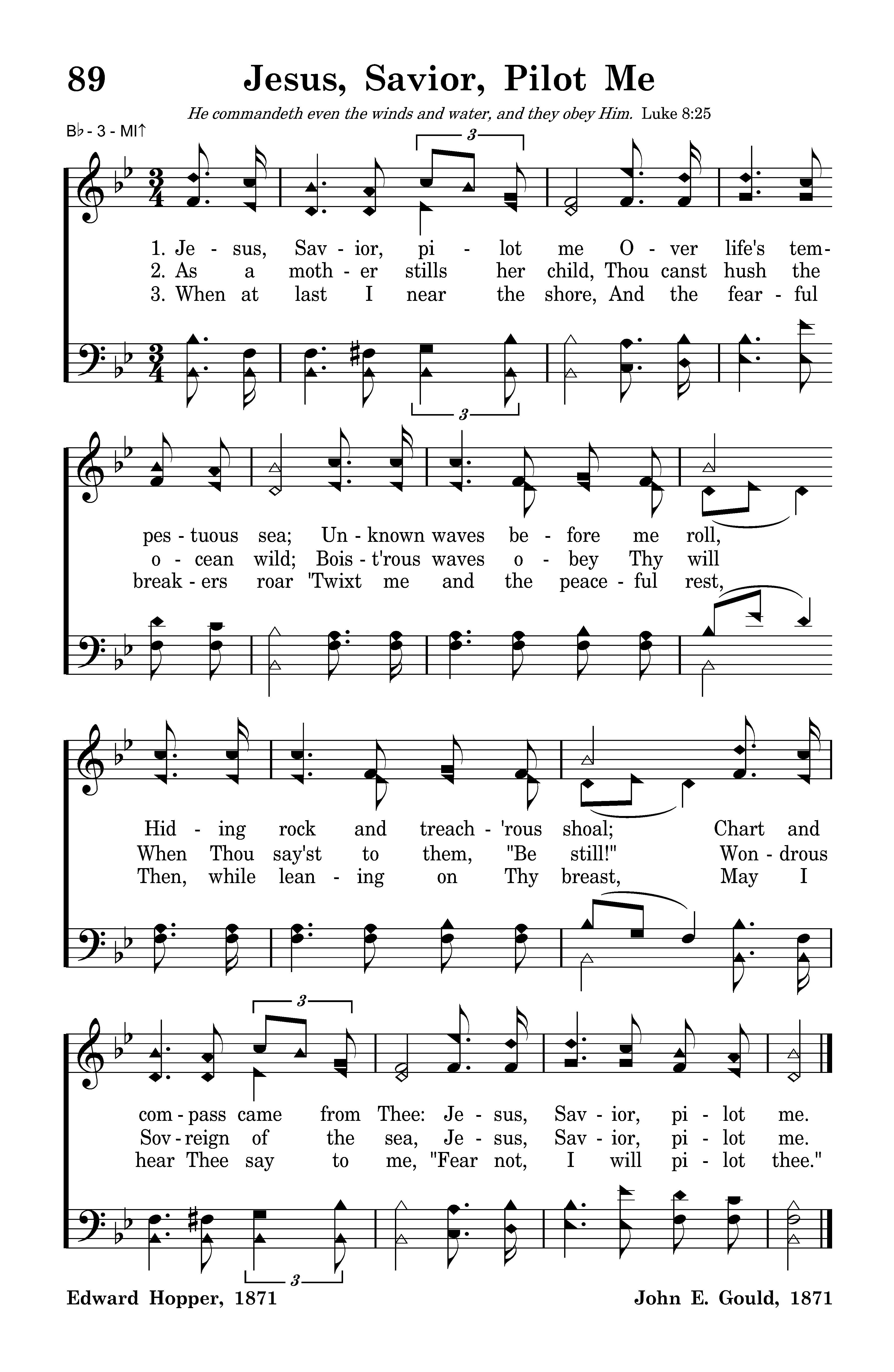 Jesus, Savior, pilot me Over life's tempestuous sea; Unknown waves before me roll, Hiding rock and treach'rous shoal; Chart and compass came from Thee: Jesus, Savior, pilot me.