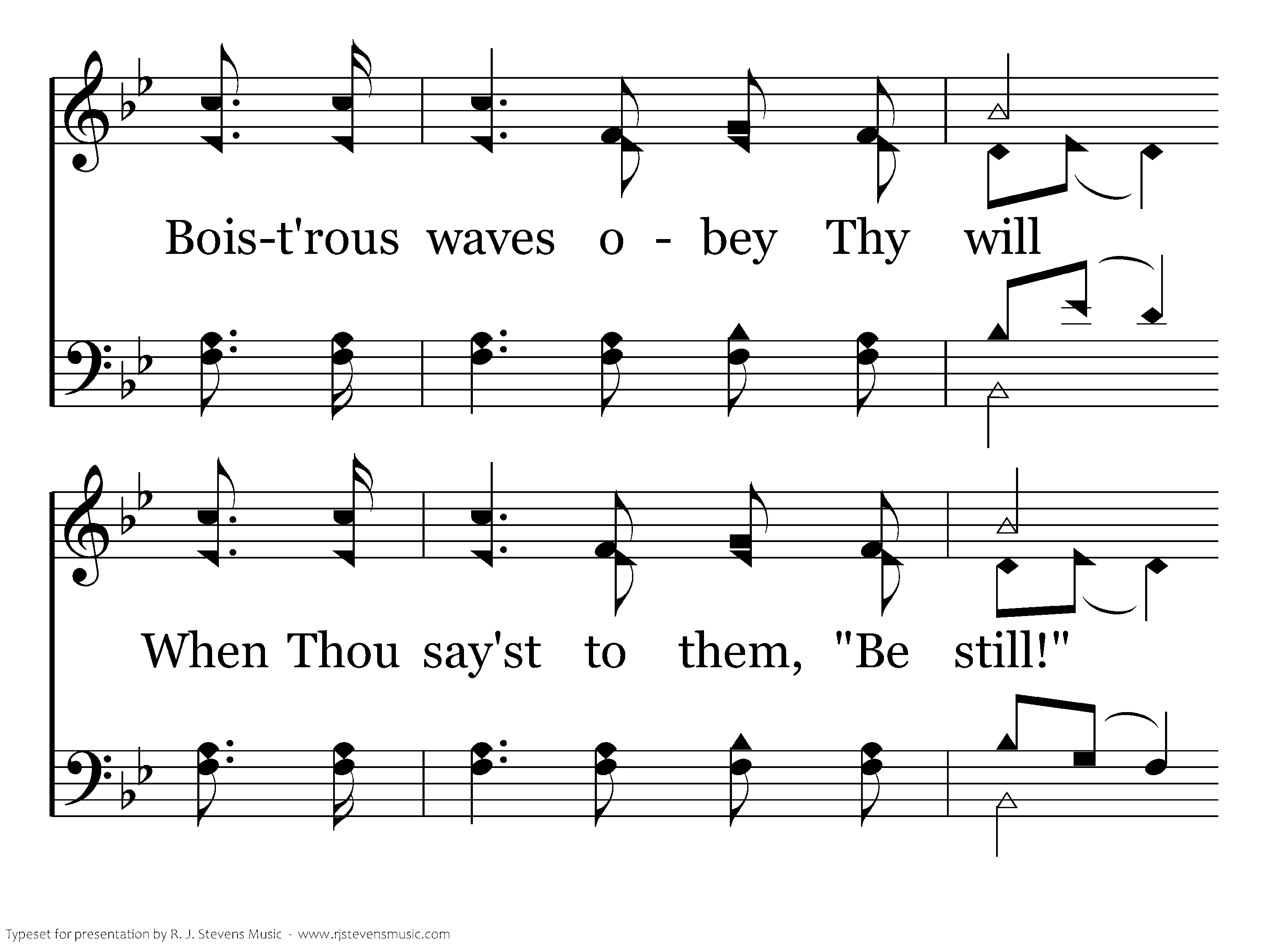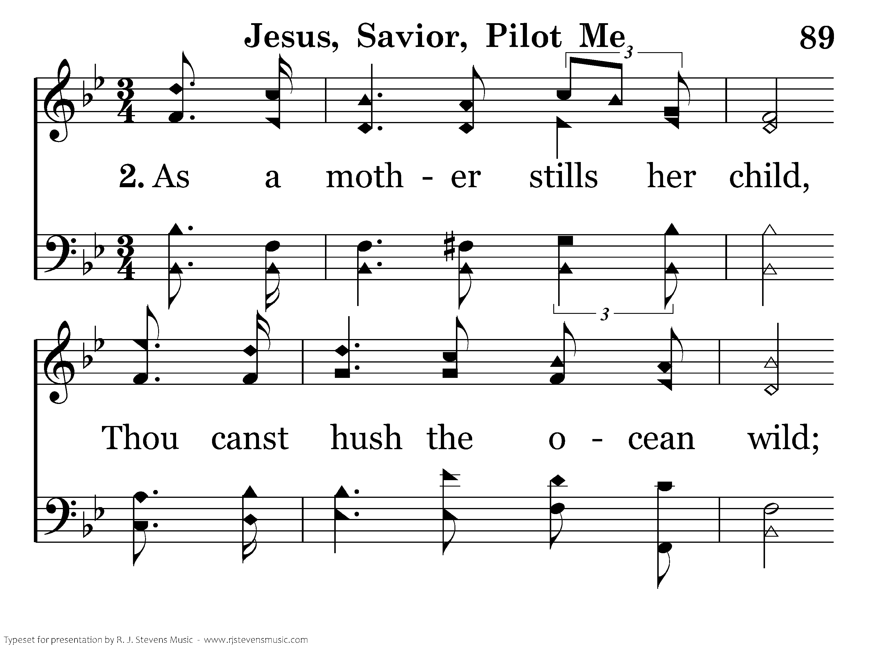 As a mother stills her child, Thou canst hush the ocean wild; Boistrous waves obey Thy will When Thou say'st to them, "Be still!" Wondrous Sov'reign of the sea, Jesus, Savior, pilot me.