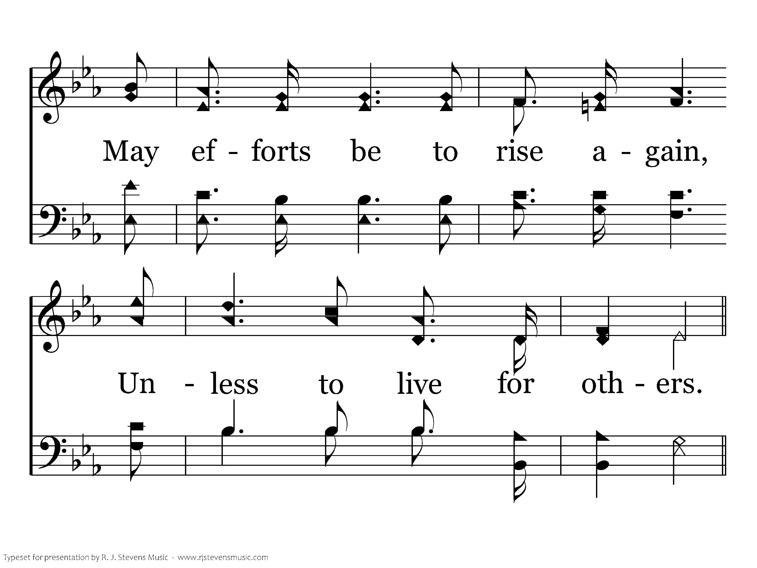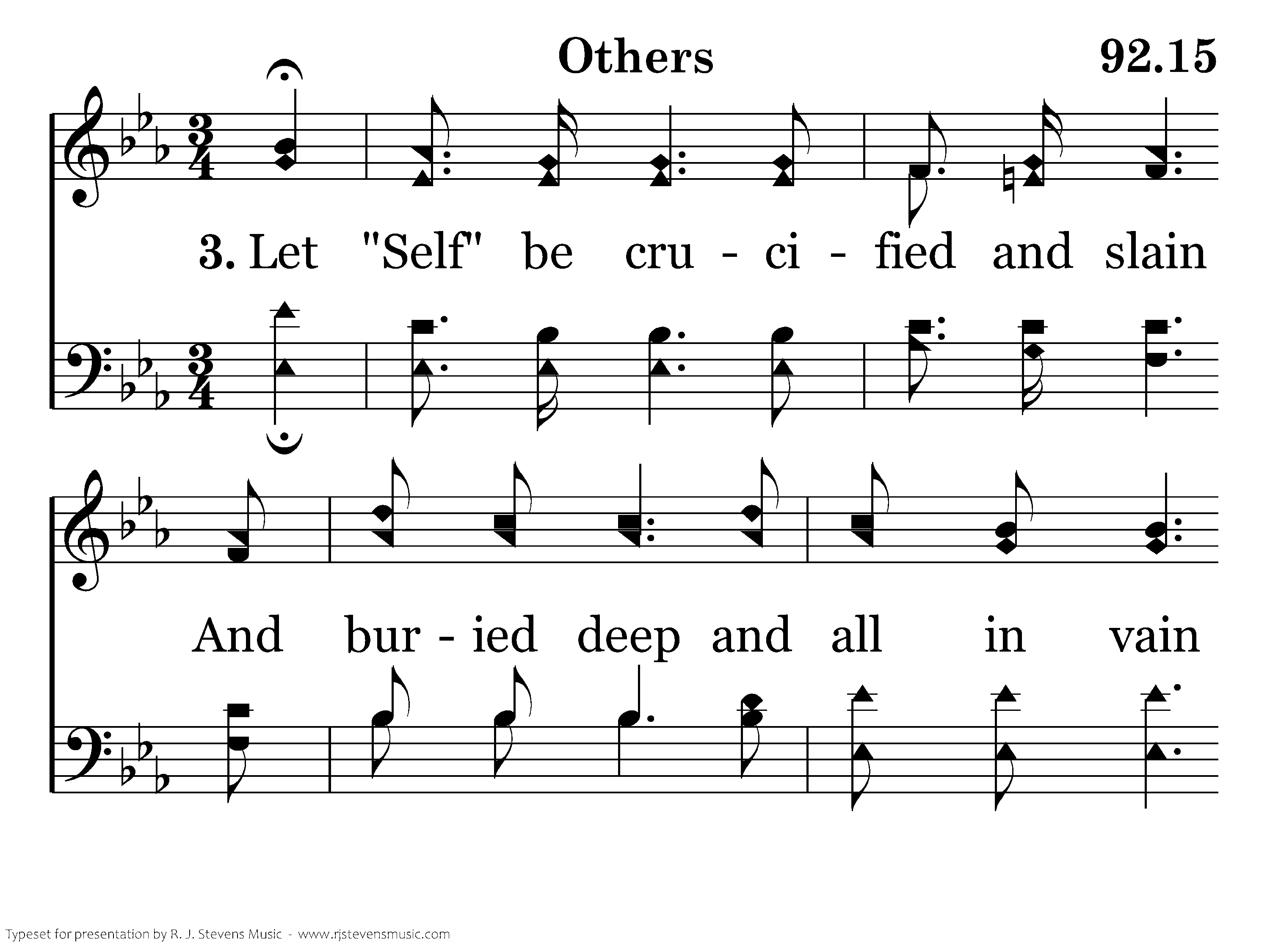 Let "self" be crucified and slain And buried deep: and all in vain May efforts be to rise again, Unless to live for others.