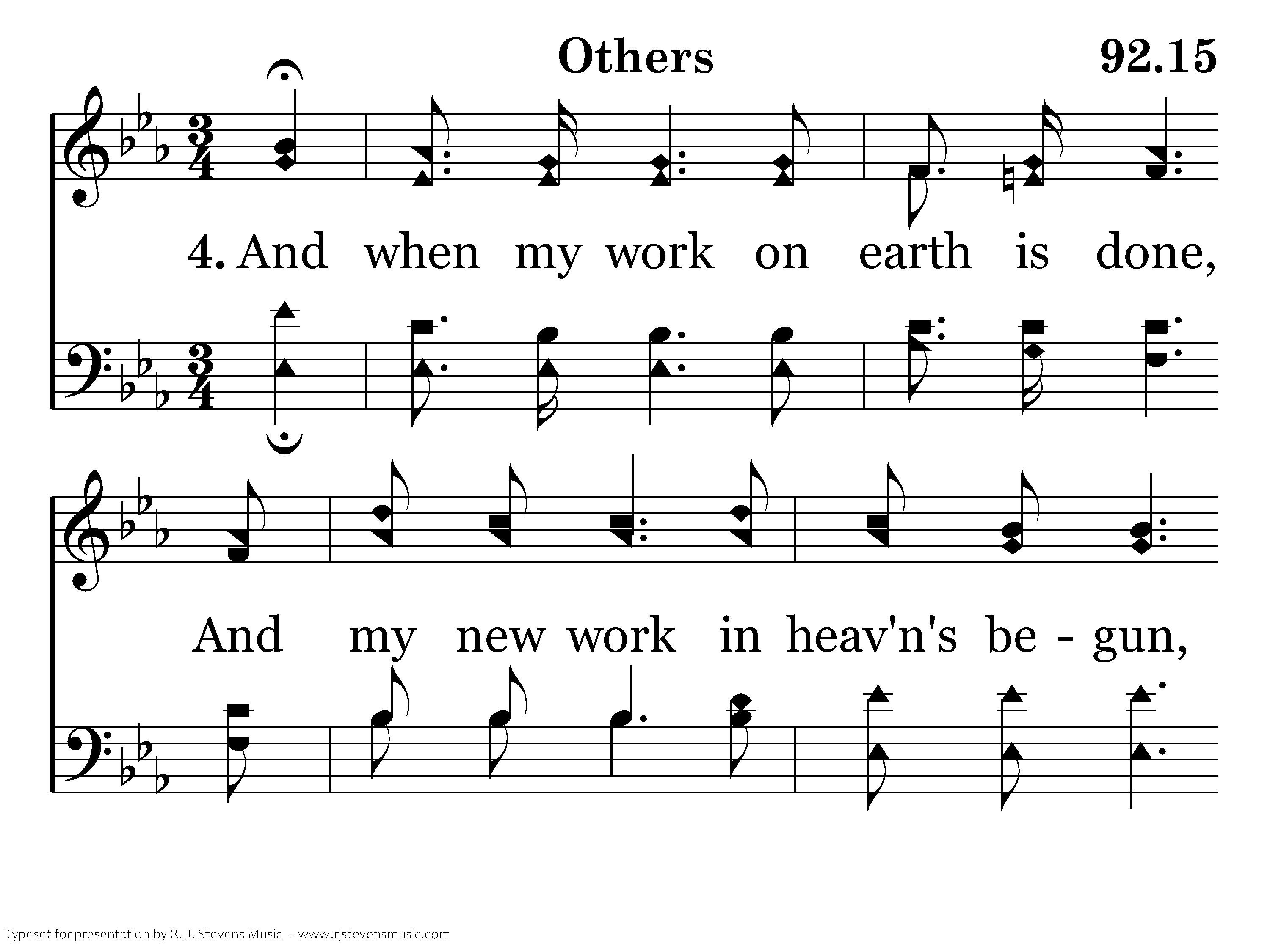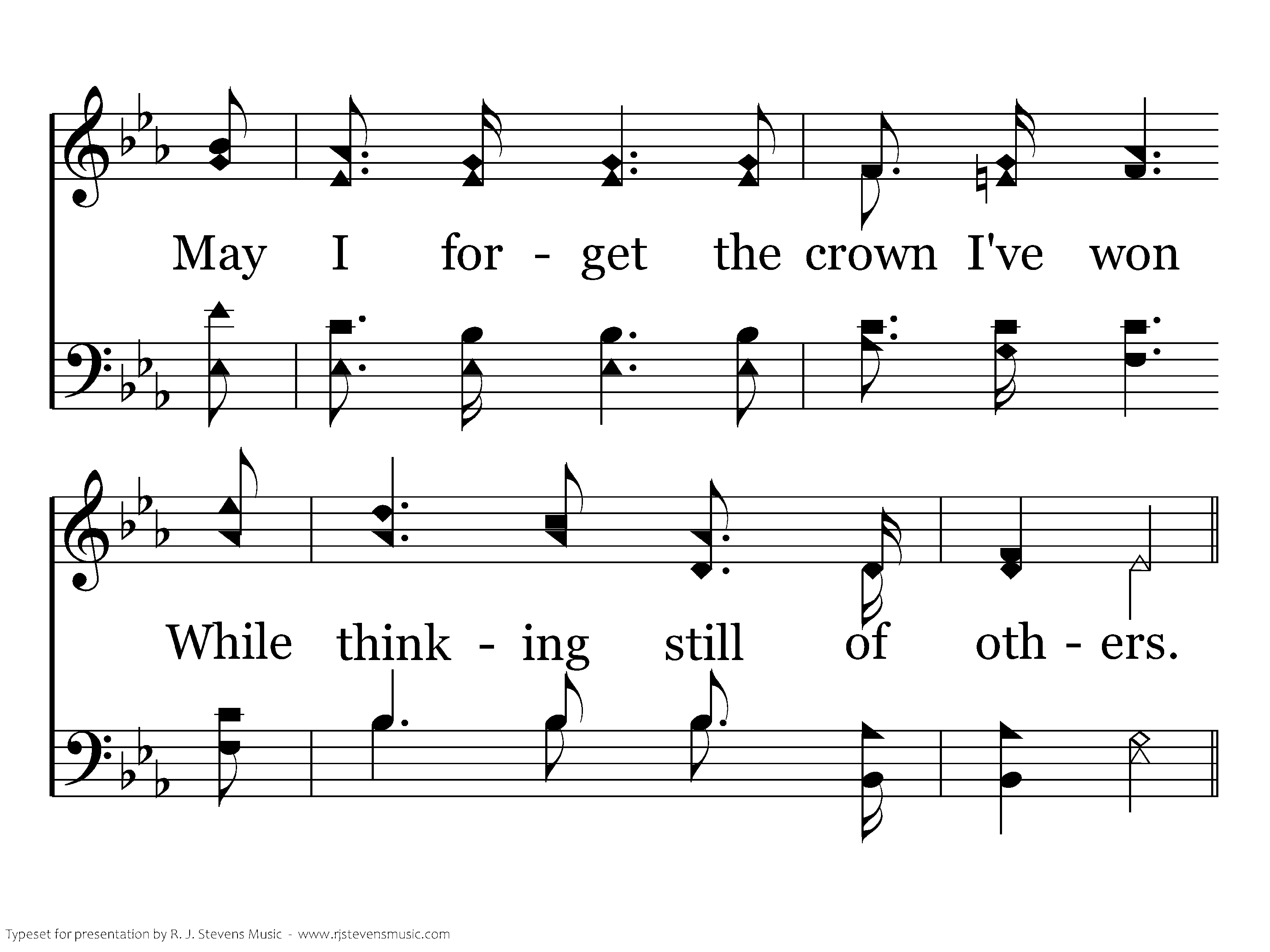 And when my work on earth is done, And my new work in heav'ns begun, May I forget the crown I've won While thinking still of others.