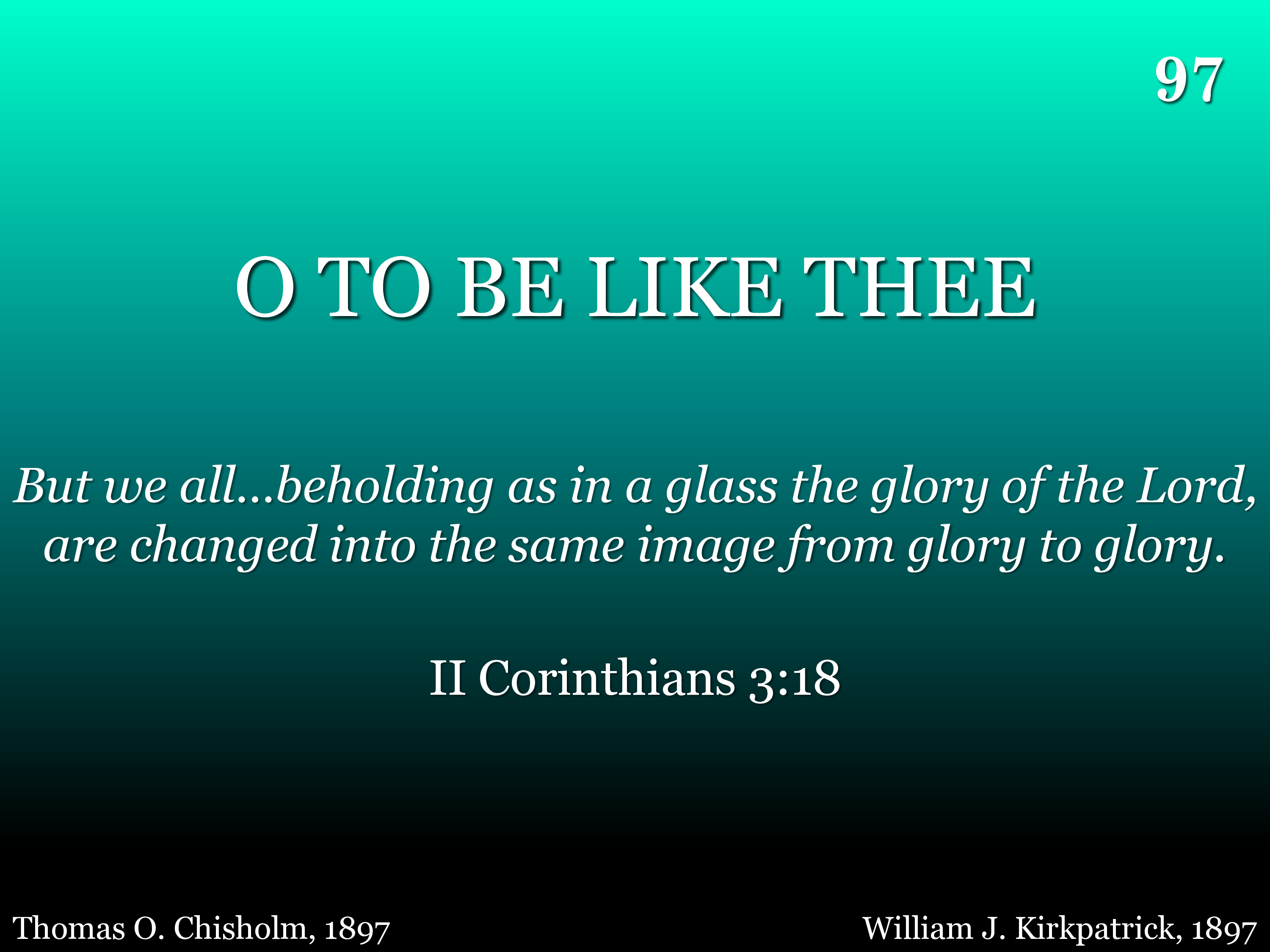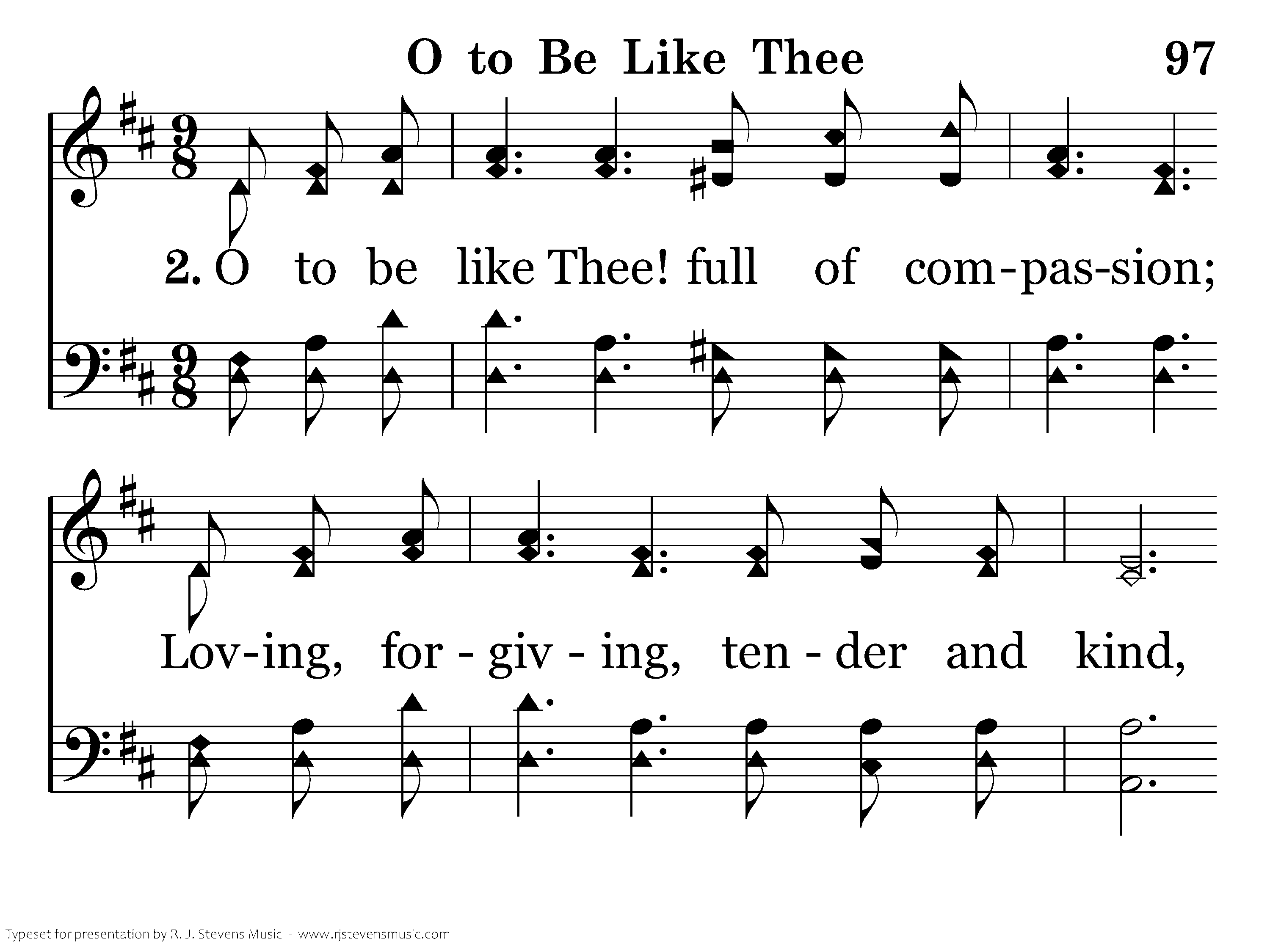 O to be like Thee! Full of compassion, Loving, forgiving, tender and kind, Helping the helpless, cheering the fainting, Seeking the wand'ring sinner to find.