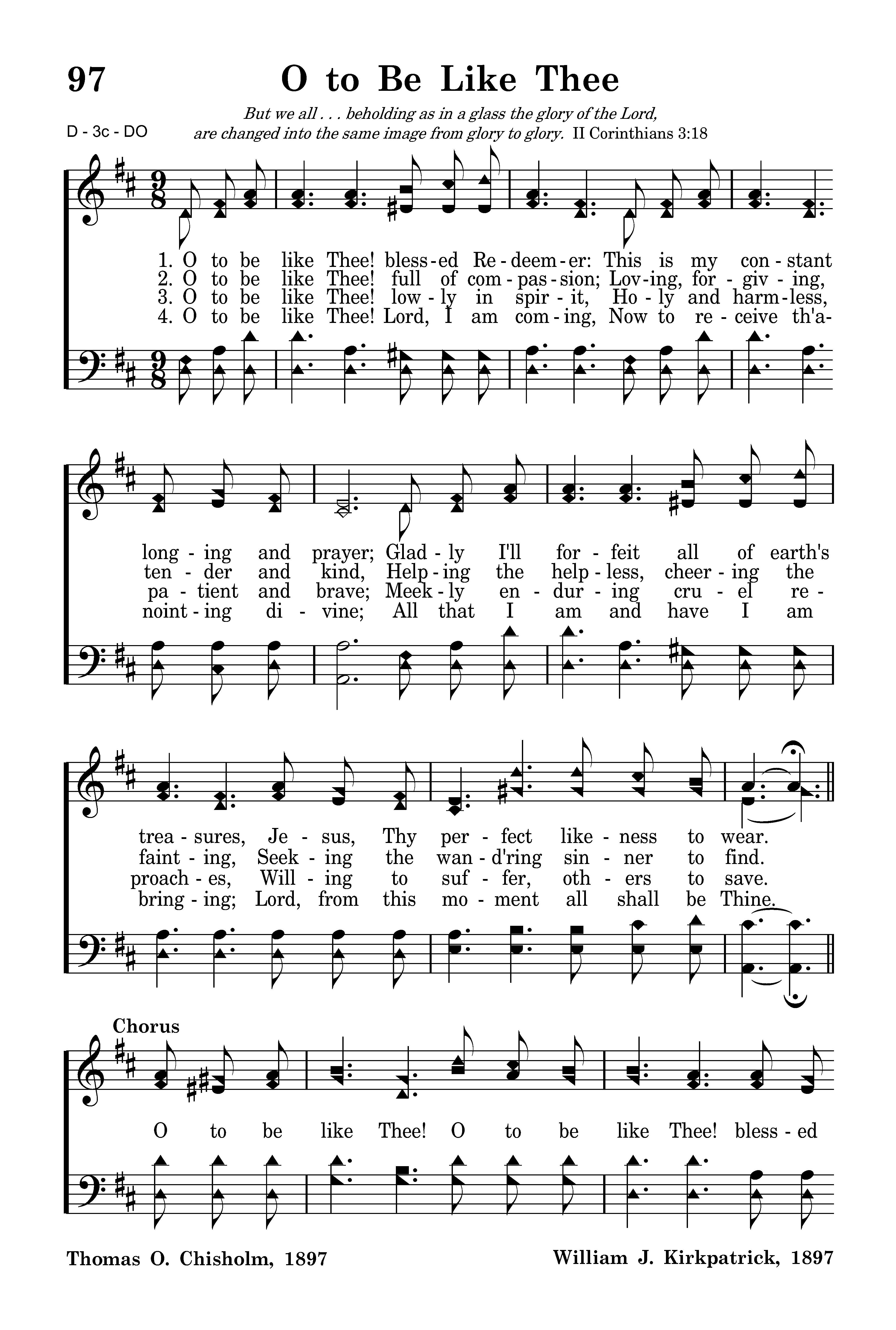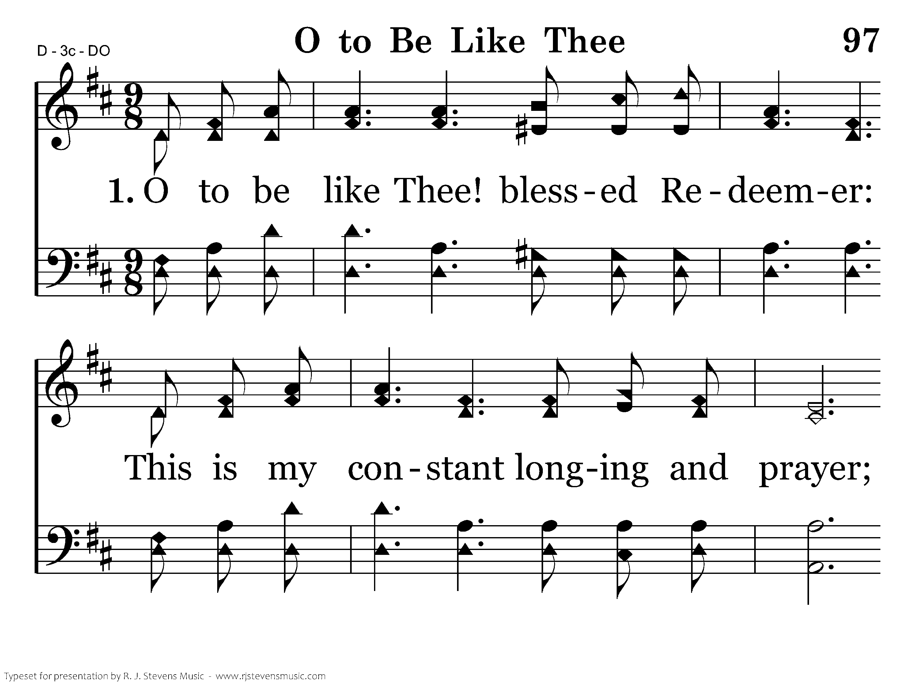O to be like Thee! O to be like Thee! blessed Redeemer, pure as Thou art; Come in Thy sweetness, come in Thy fullness; Stamp Thine own image deep on my heart.