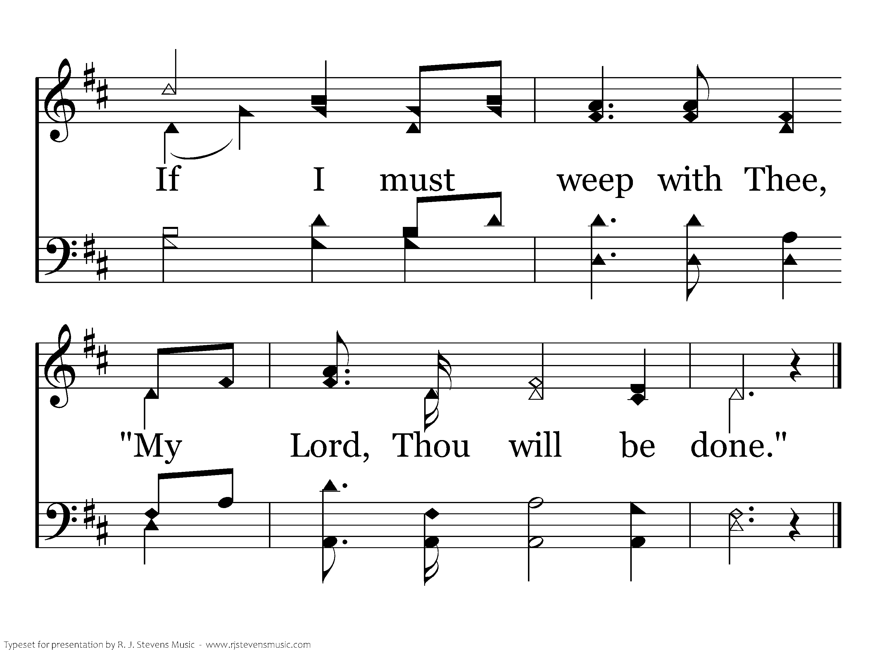 My Savior, as Thou wilt! Tho' seen thru many a tear, Let not my star of hope Grow dim or disappear; Since Thou on earth hast wept And sorrowed oft alone, If I must weep with Thee, "My Lord, Thy will be done."