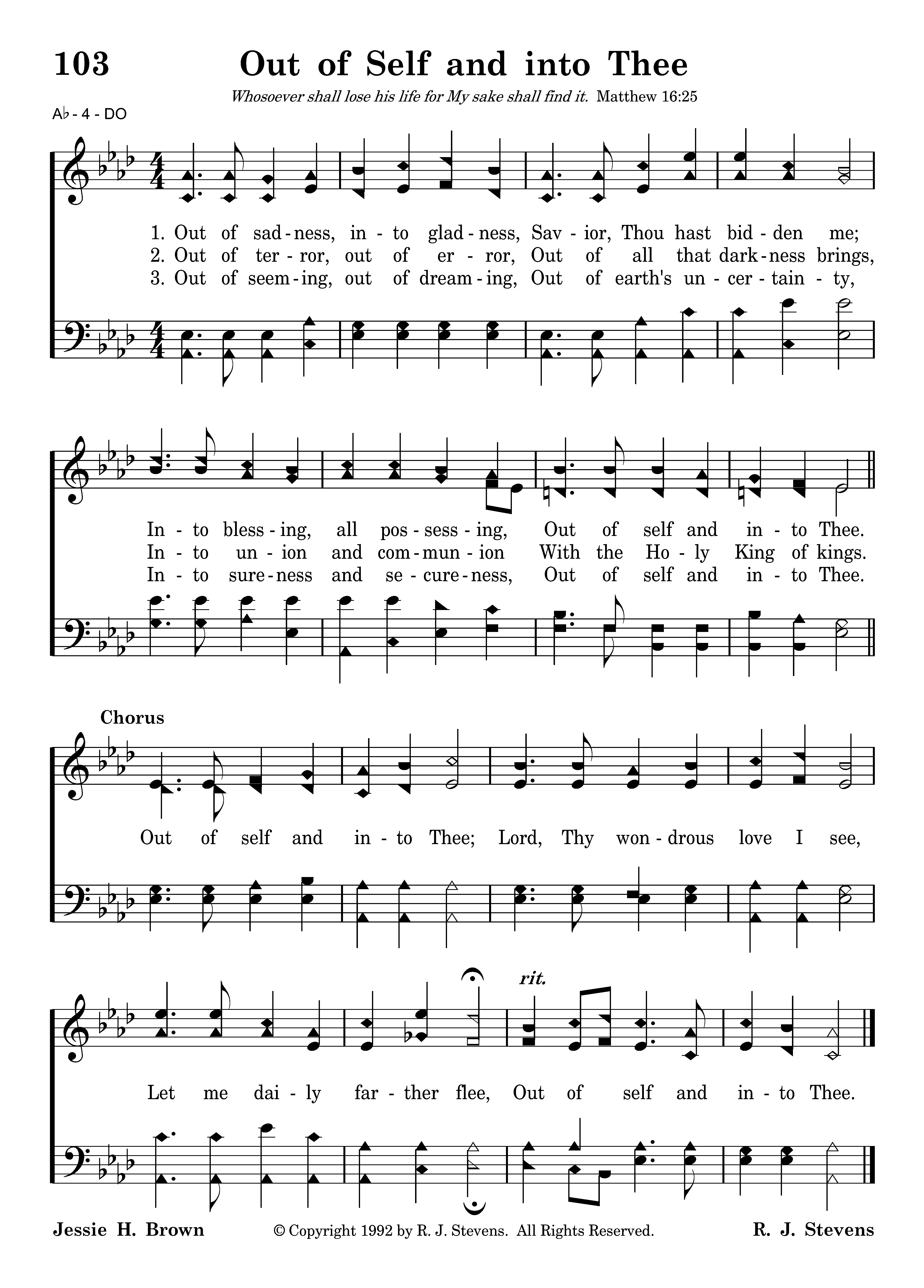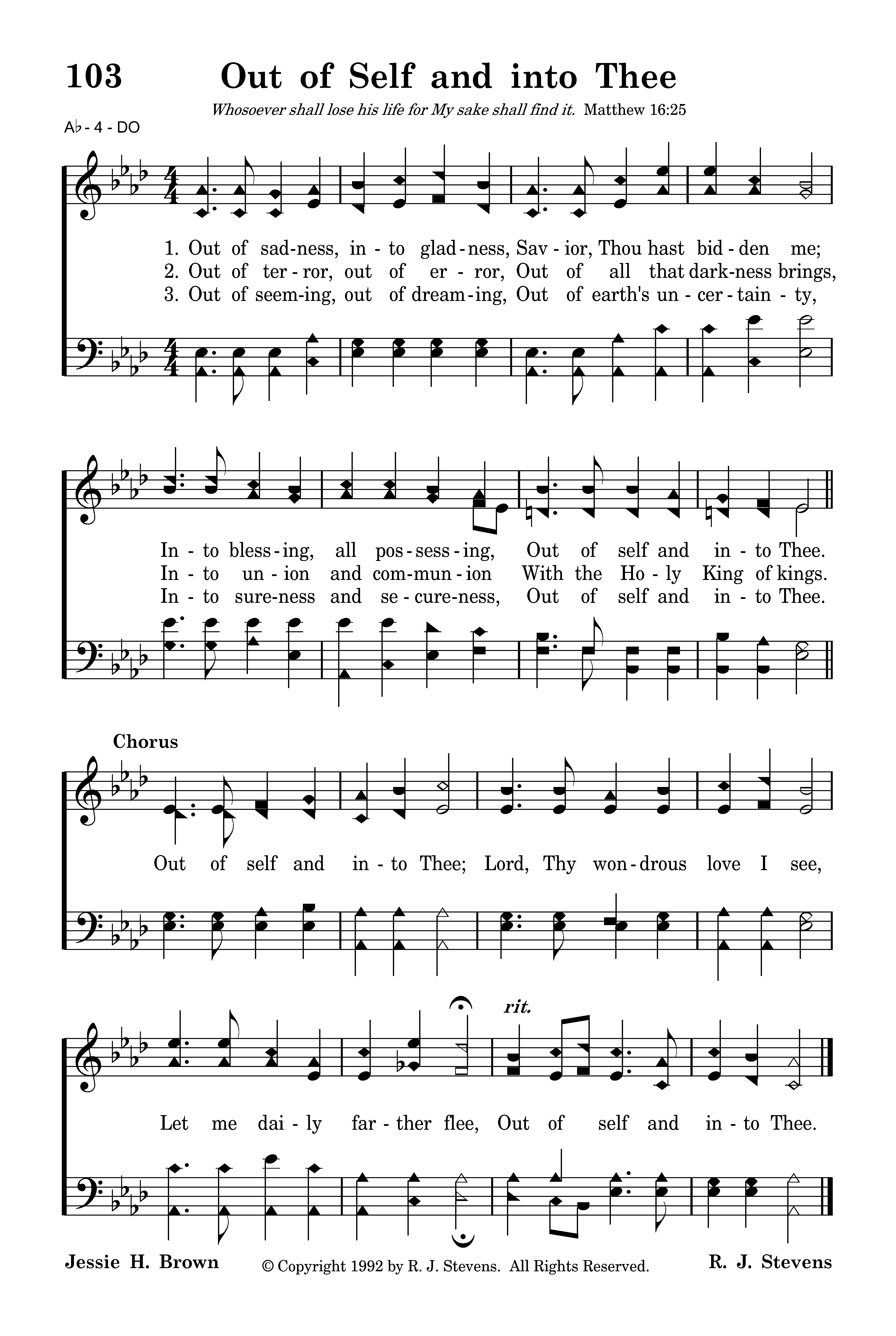 Out of sadness, Into gladness, Savior, Thou hast bidden me; Into blessing, all possessing, Out of self and into Thee.