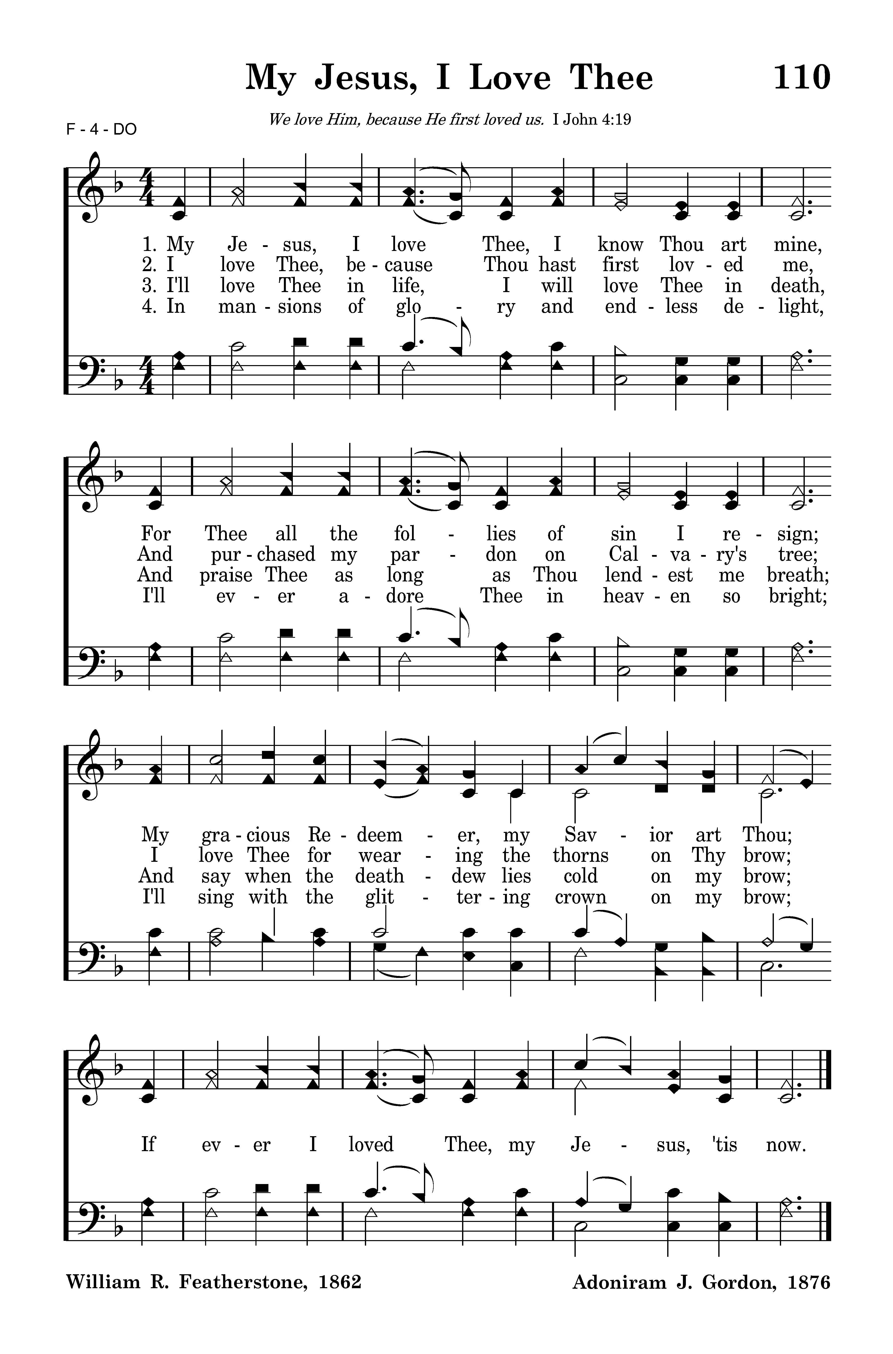My Jesus I love Thee, I know Thou art mine, For Thee all the follies of sin I resign; My gracious Redeemer, my Savior art Thou; If ever I love Thee, my Jesus 'tis now.