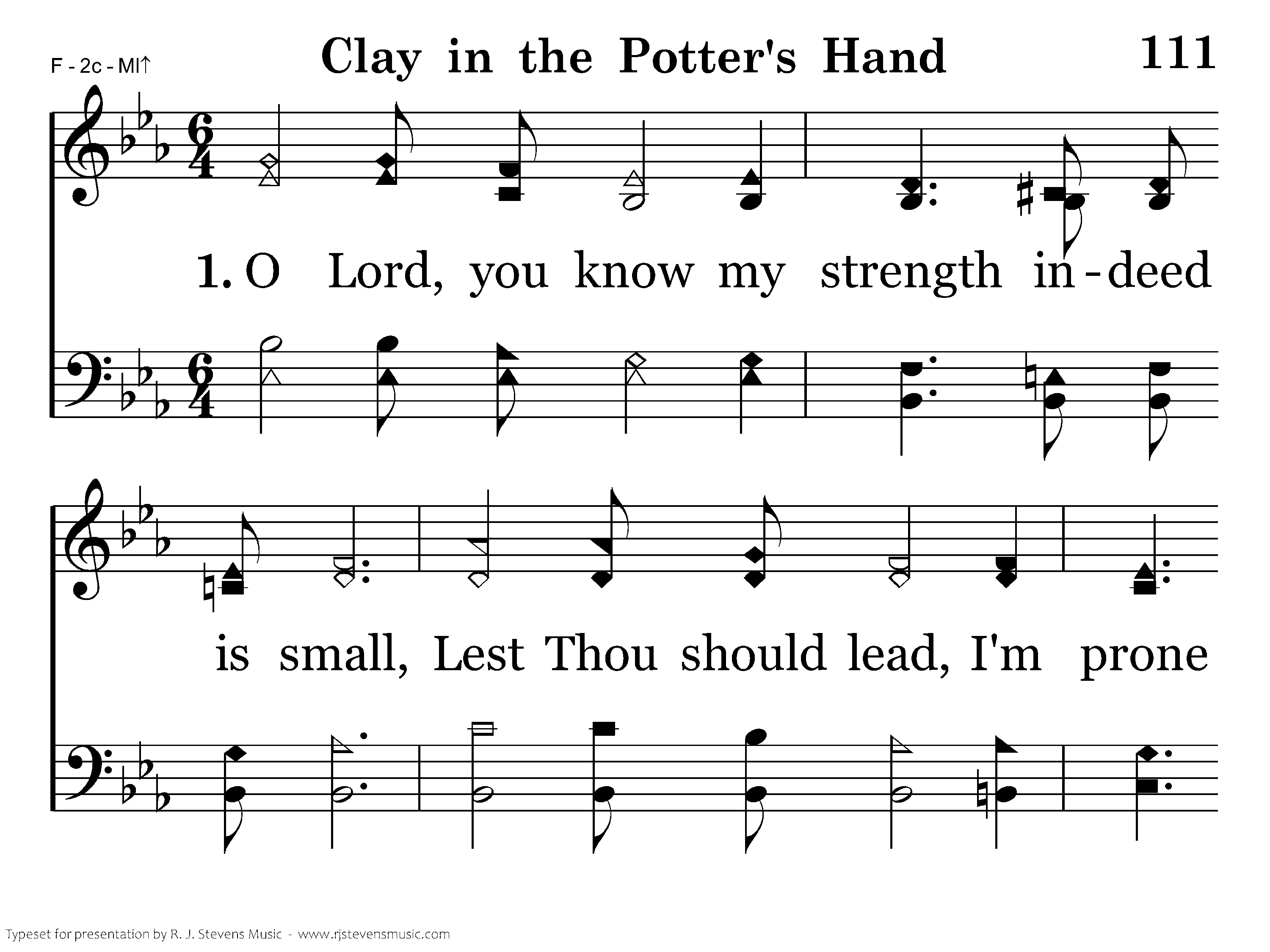 O Lord, you know my strength indeed is small, Lest Thou should lead, I'm prone to slip and fall; Guide and direct, o'er evil help me stand, Make me as clay in the potter's hand.