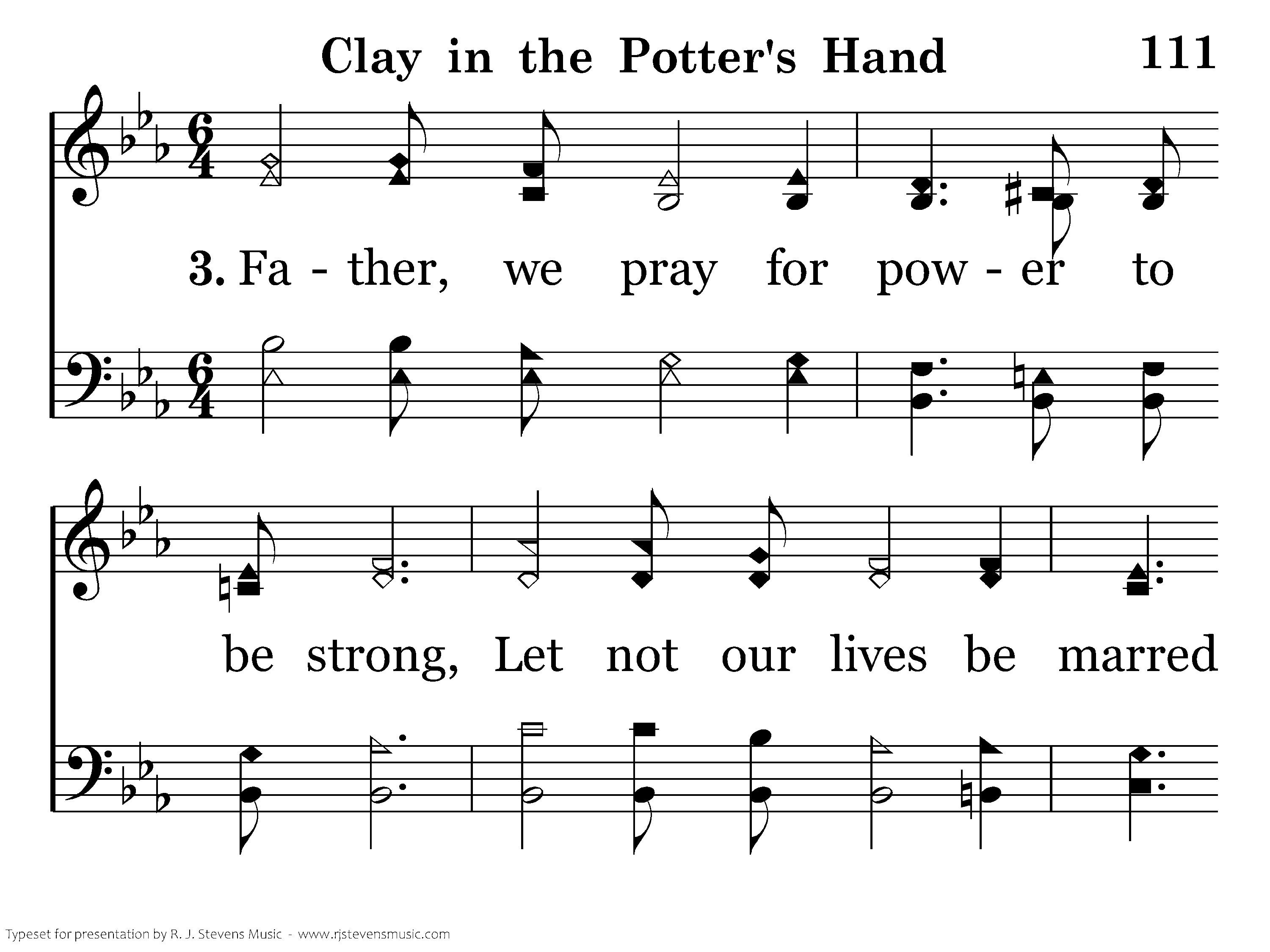 Father, we pray for power to be strong, Let not our lives be marred by sin, and wrong; Lead to Thy throne, by love take full command, Make me as clay in the potter's hand.
