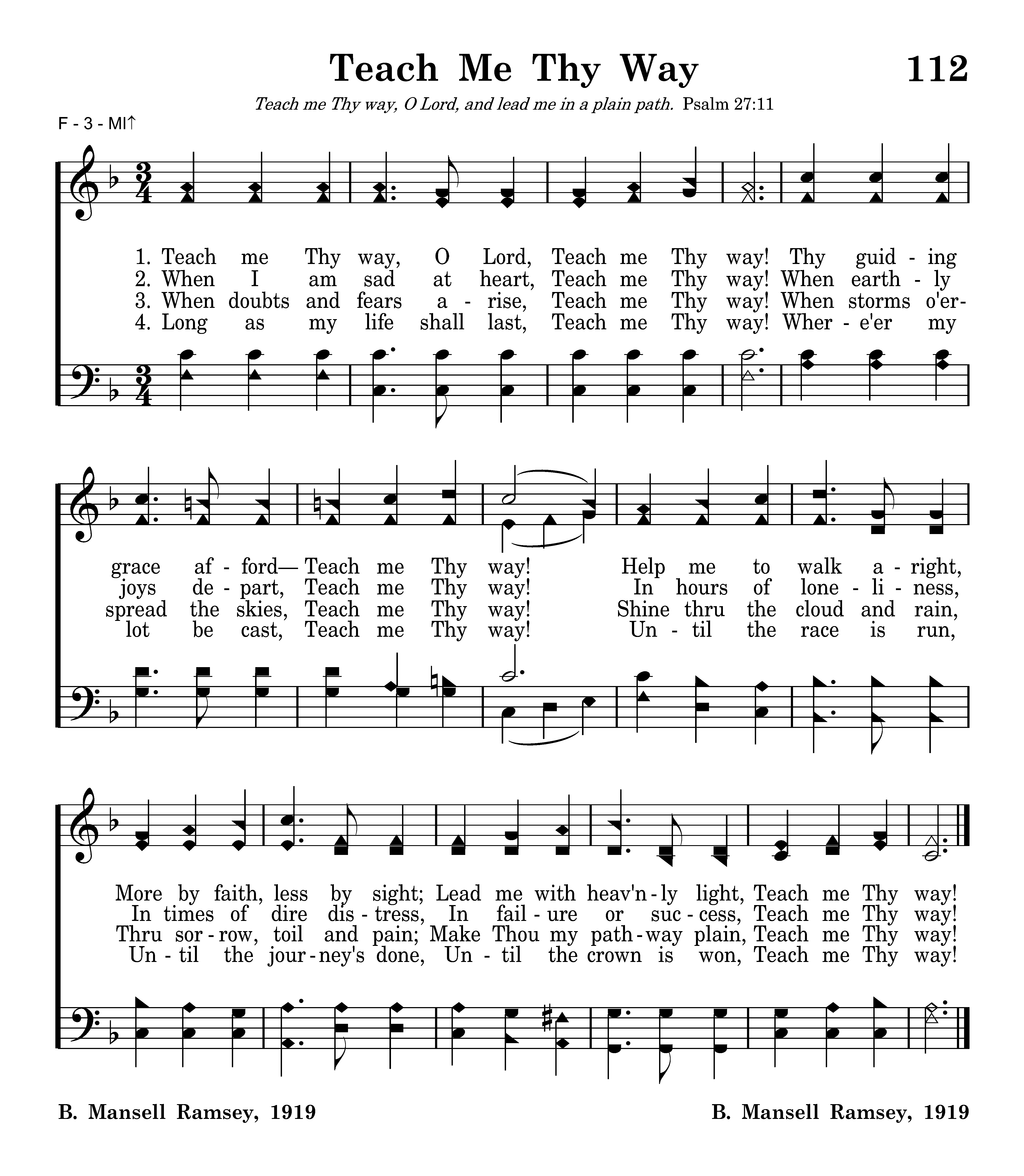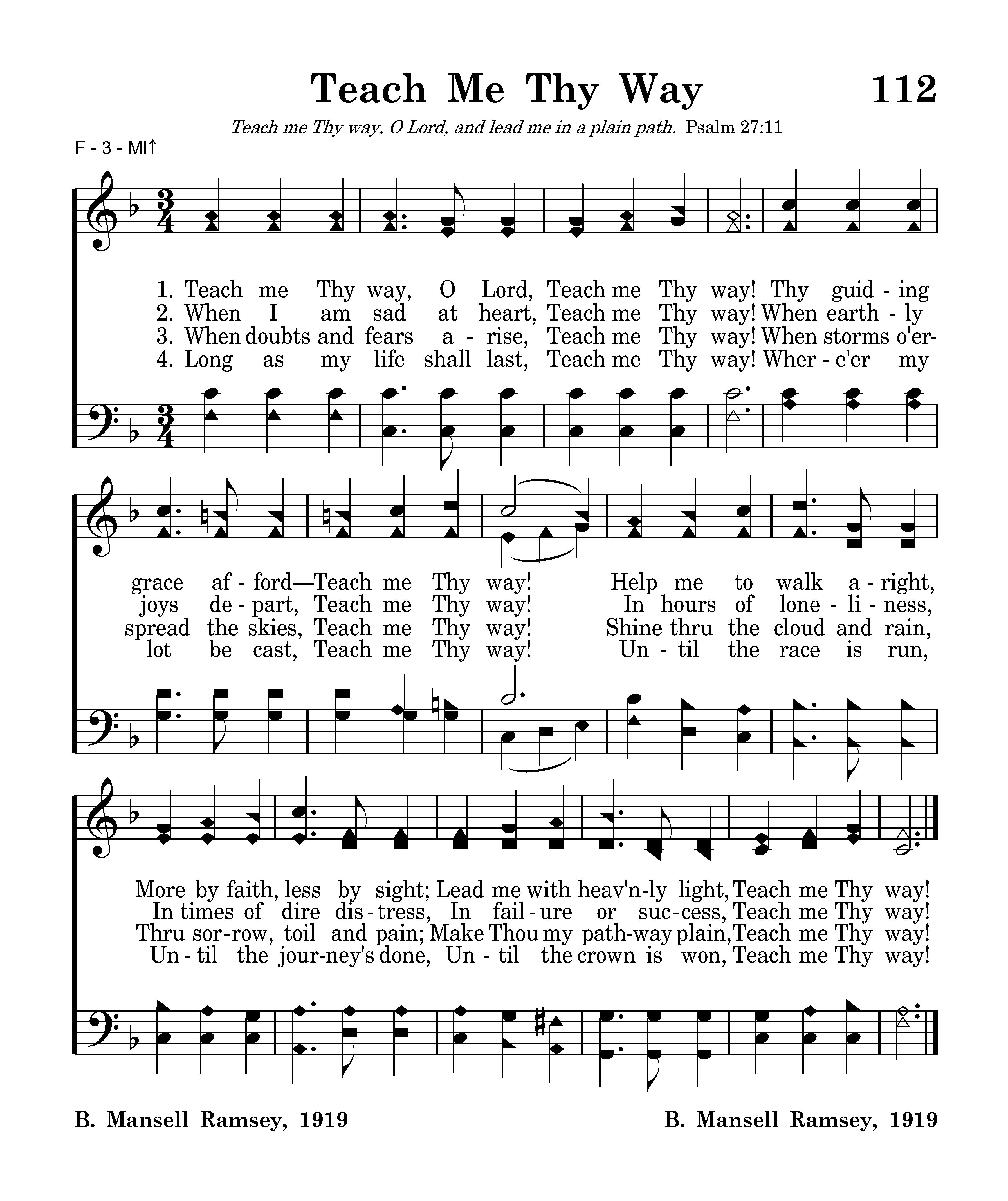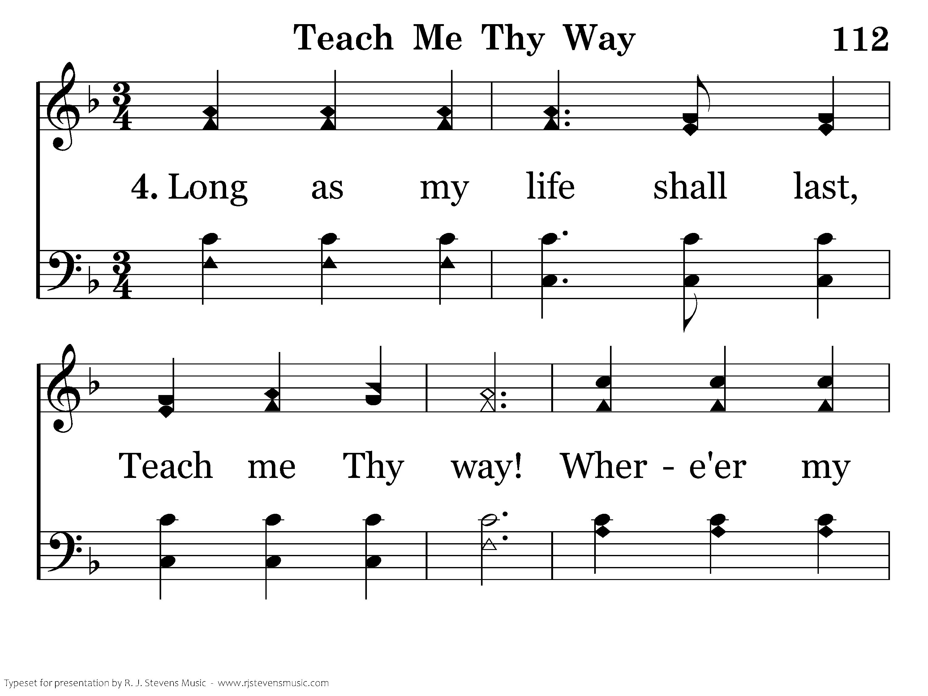Long as my life shall last, teach me Thy way! Where'er my lot be cast, teach me Thy way! Until the race is run, until the journey's done, until the crown is won, teach me Thy way!