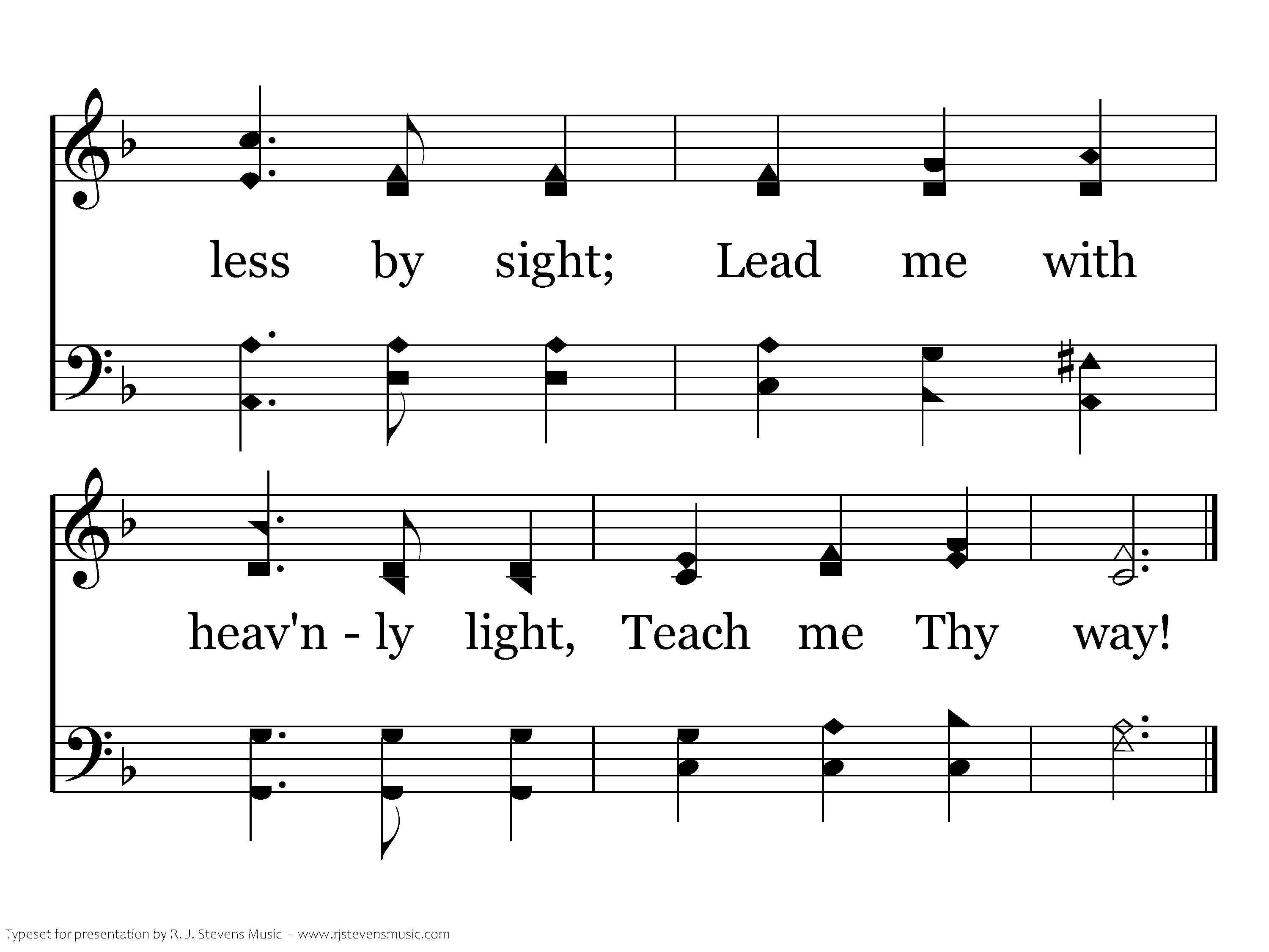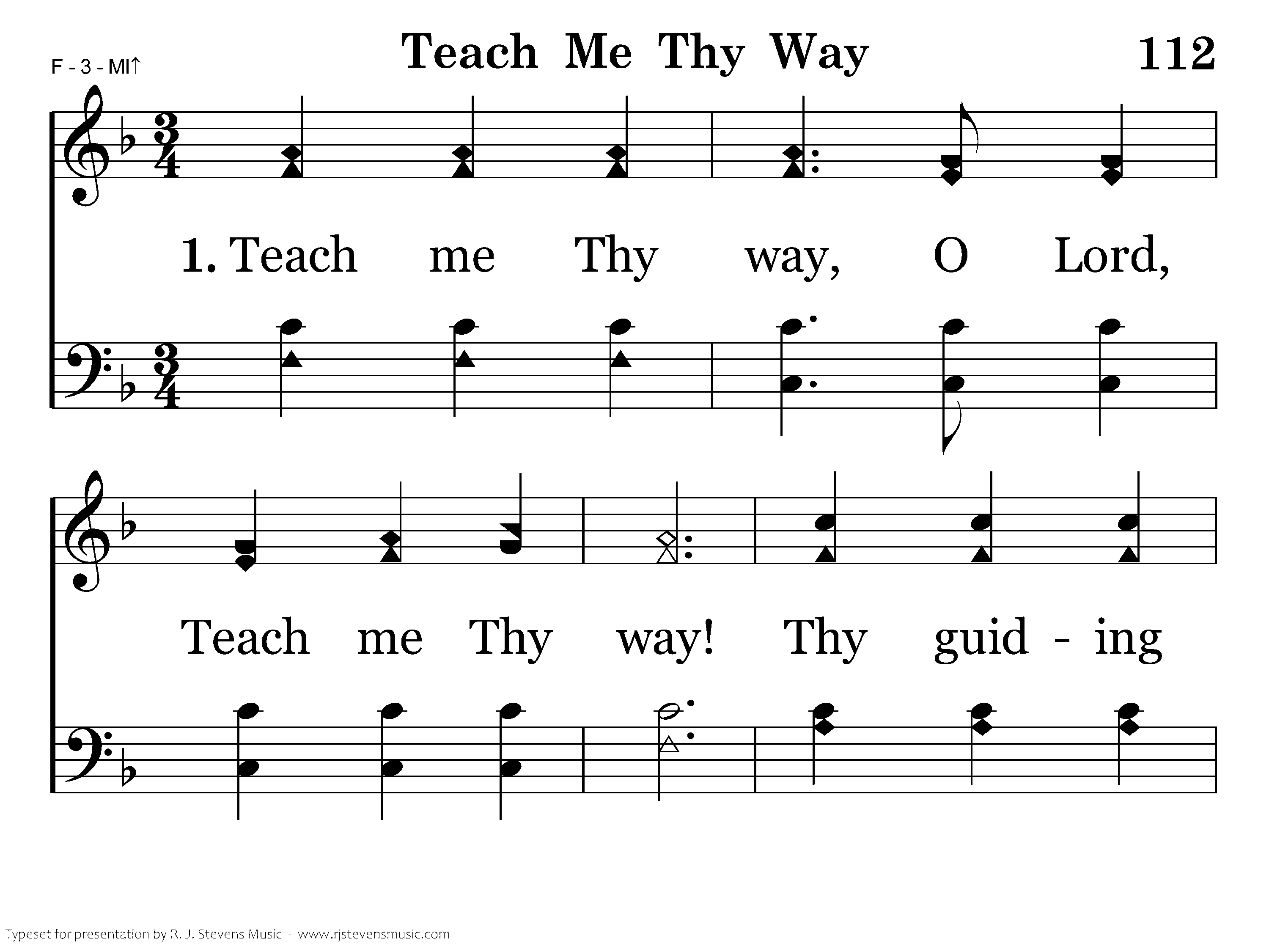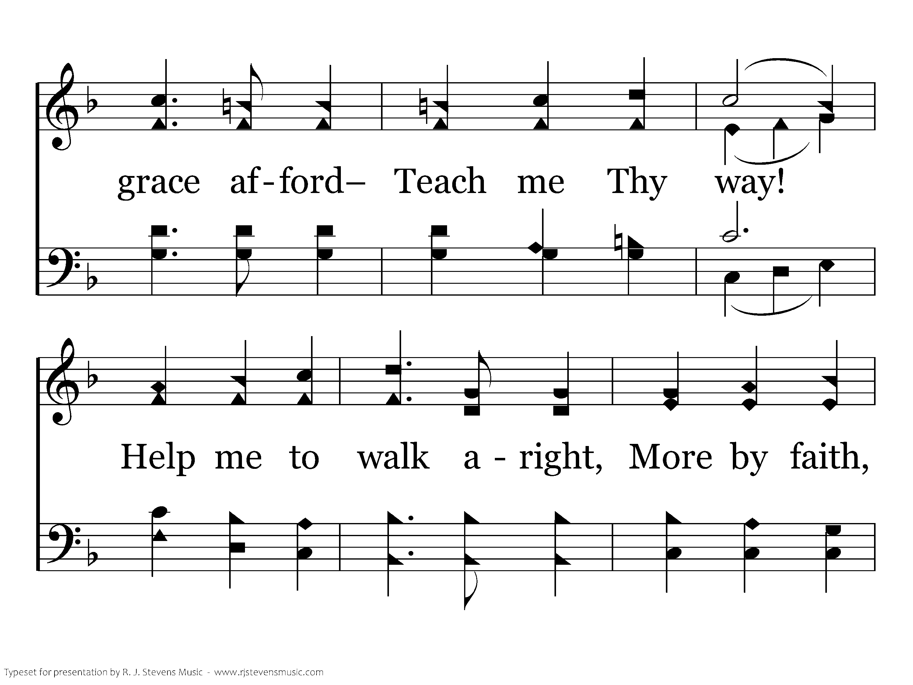Teach me Thy way, o Lord, teach me Thy way! Thy guiding grace afford teach me Thy way! Help me to walk aright, more by faith, less by sight; lead me with heav'nly light, teach me Thy way!