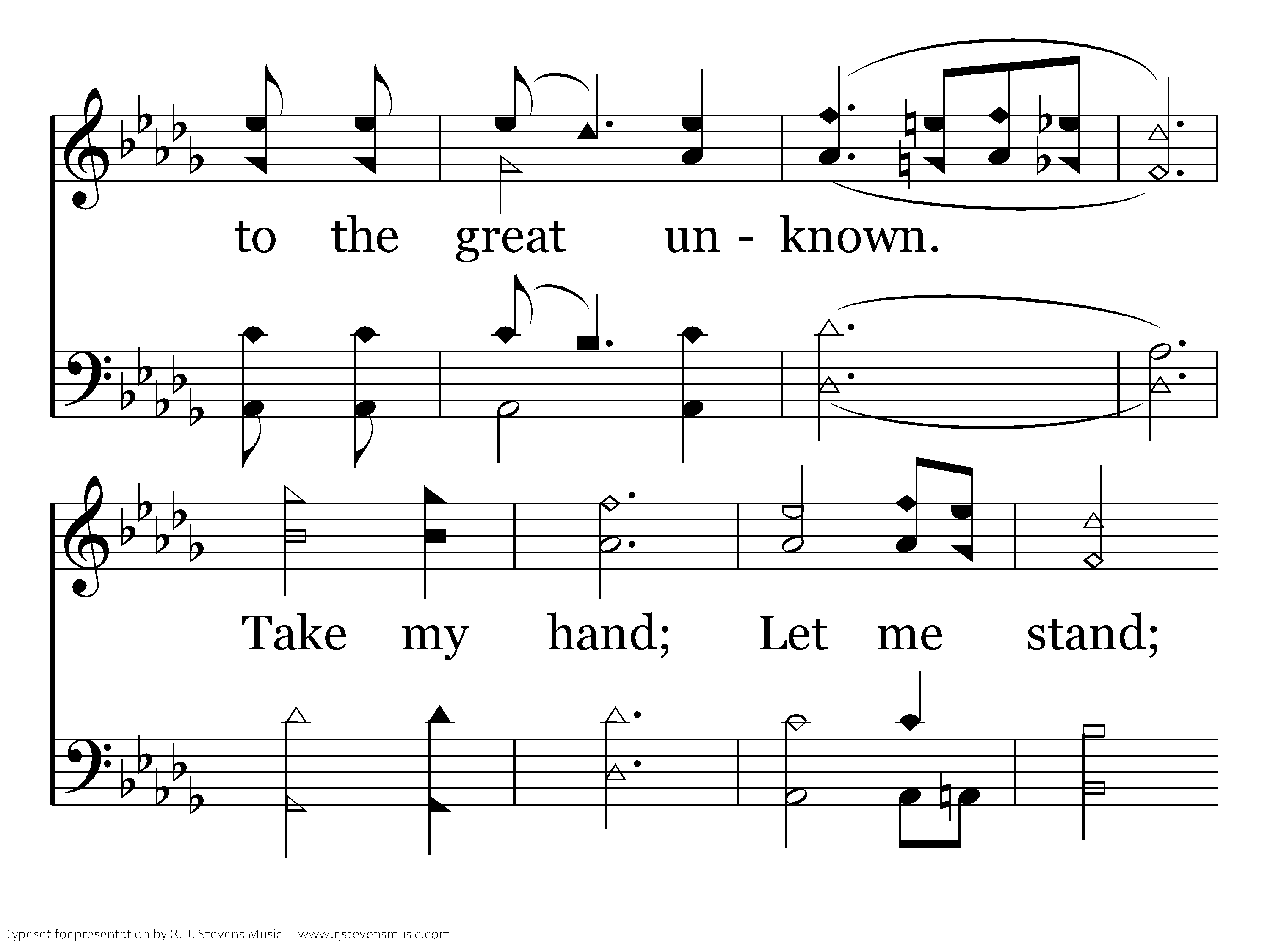 Hold my hand all the way, Every hour, every day, From here to the great unknown. Take my hand; Let me stand Where no one stands alone.