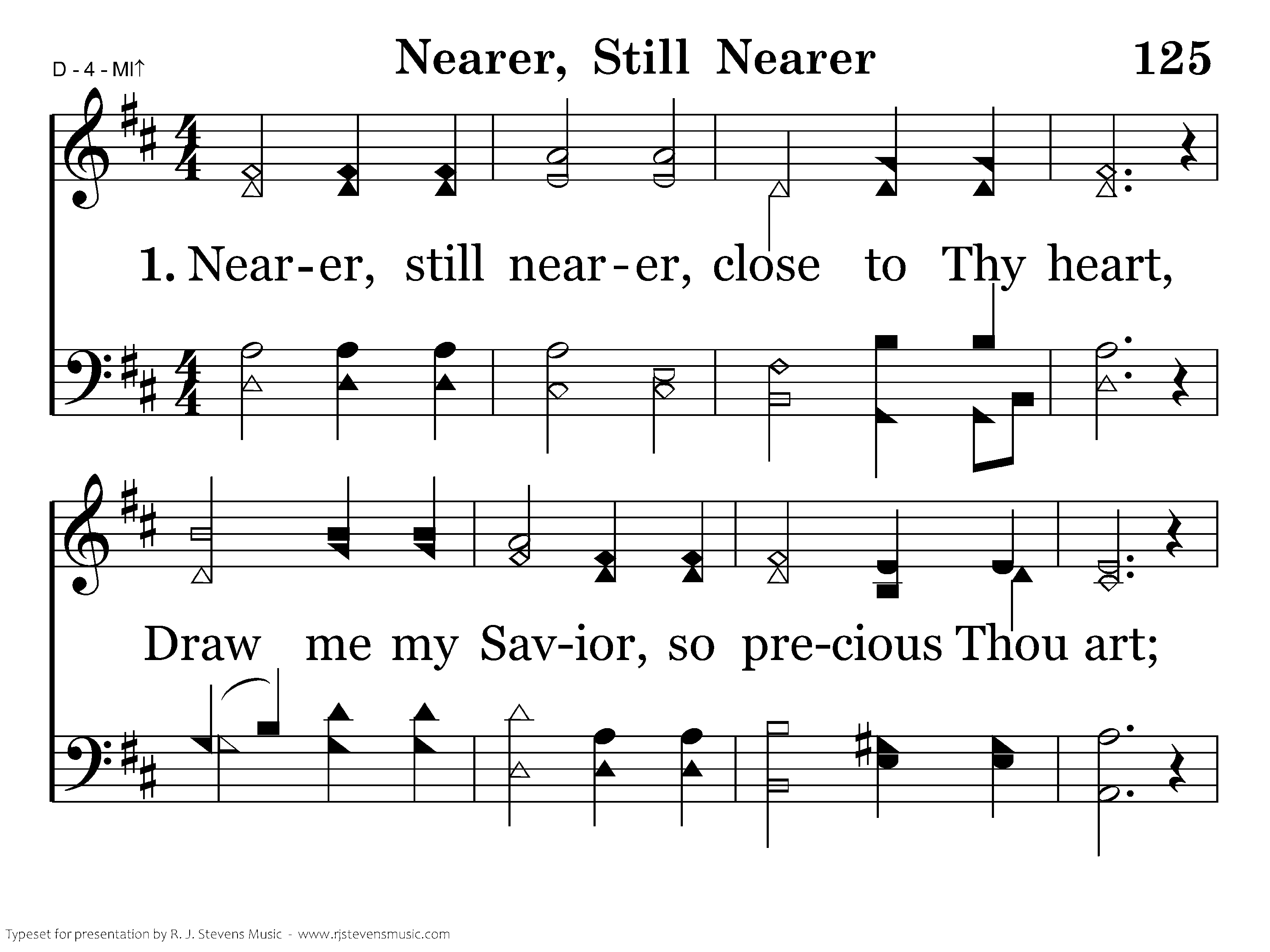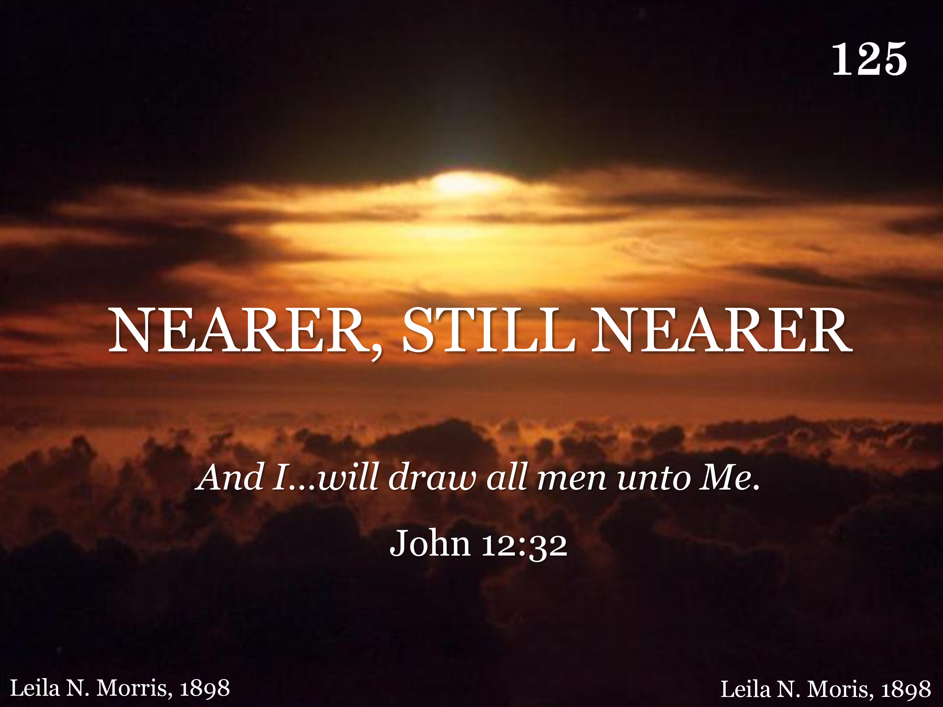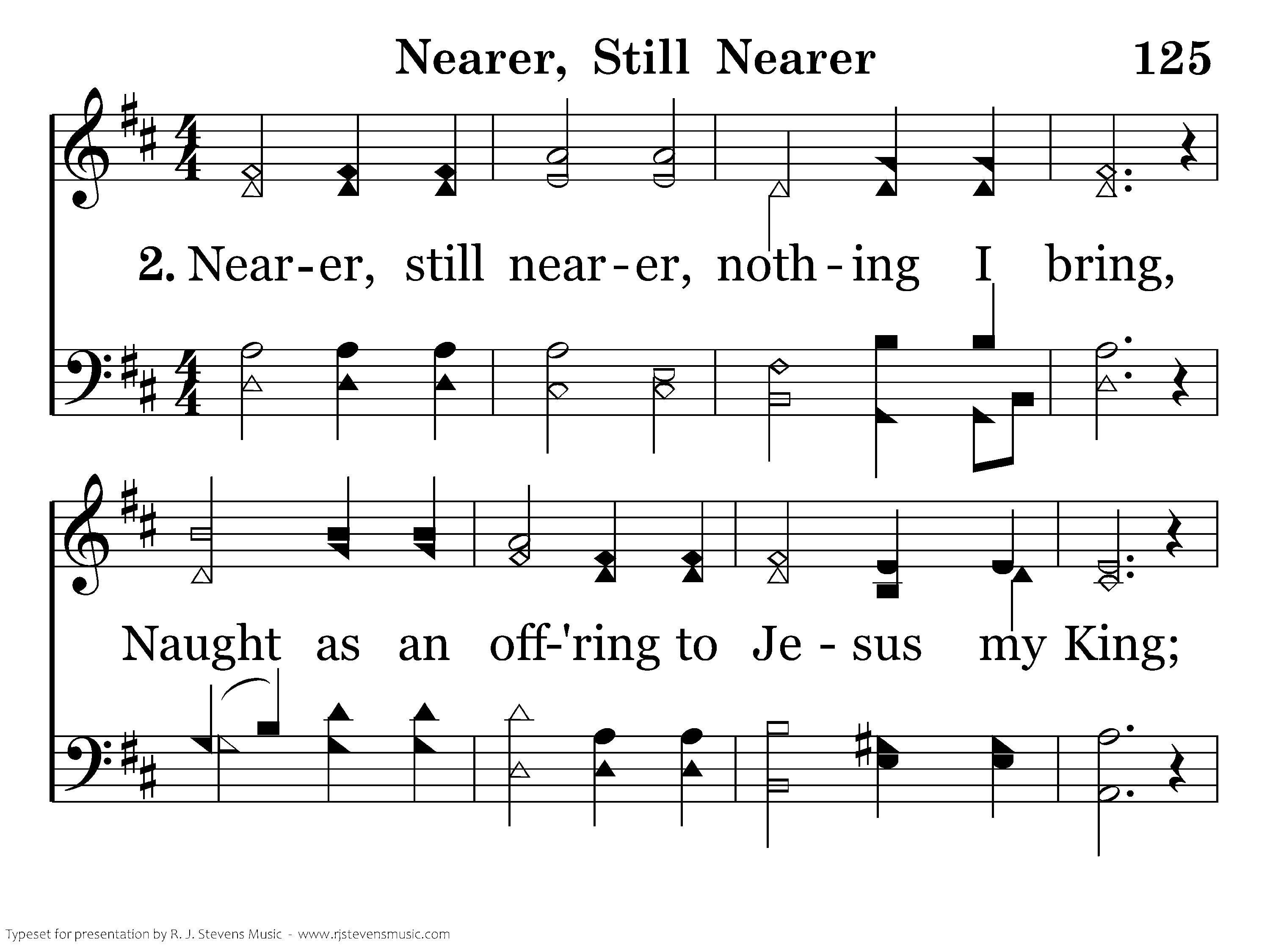 Nearer, still nearer, nothing I bring, Naught as an off'rng to Jesus my King; Only my sinful, now contrite heart, Grant me the cleansing Thy blood does impart, Grant me the cleansing Thy blood doth impart.