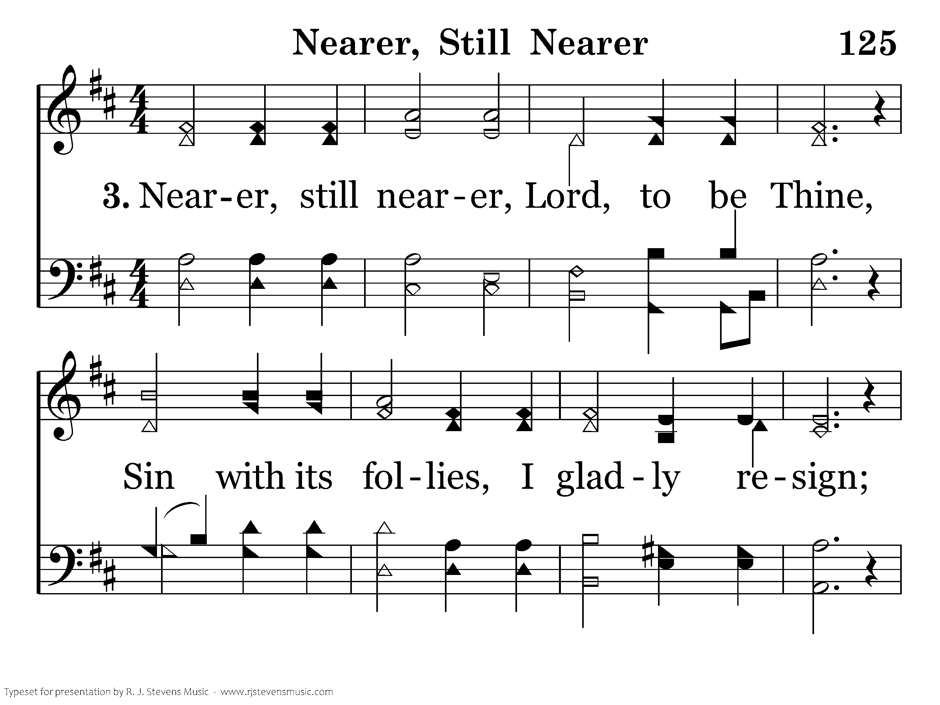 Nearer, still nearer, Lord to be Thine, Sin with its follies I gladly resign; All of its pleasures, pomp, and its pride, Give me but Jesus, my Lord crucified, Give me but Jesus, my Lord crucified.