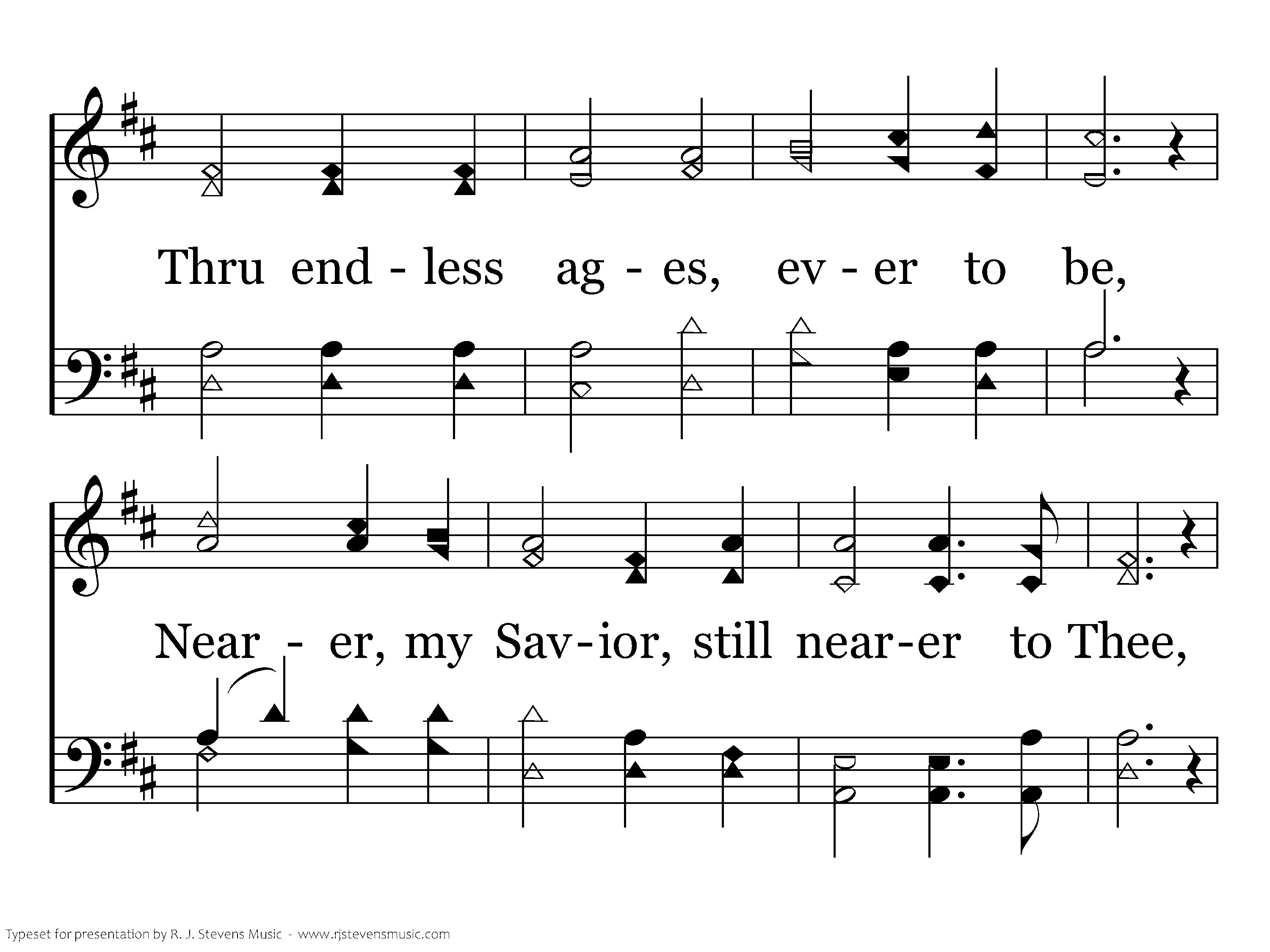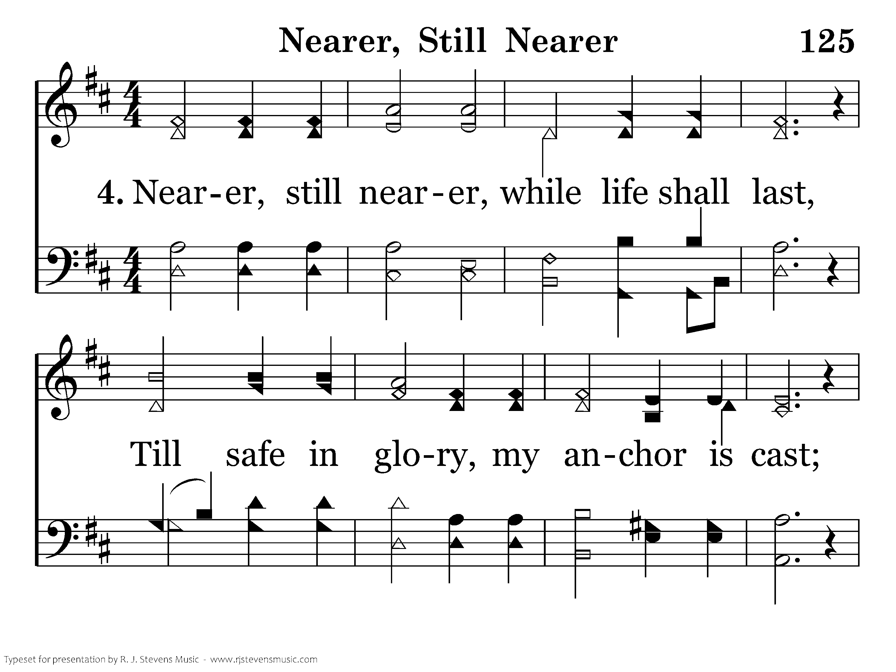 Nearer, still nearer, while life shall last, Till safe in glory, my anchor is cast; Thru endless ages, ever to be, Nearer, my Savior, still nearer to Thee, Nearer my Savior, still nearer to Thee.