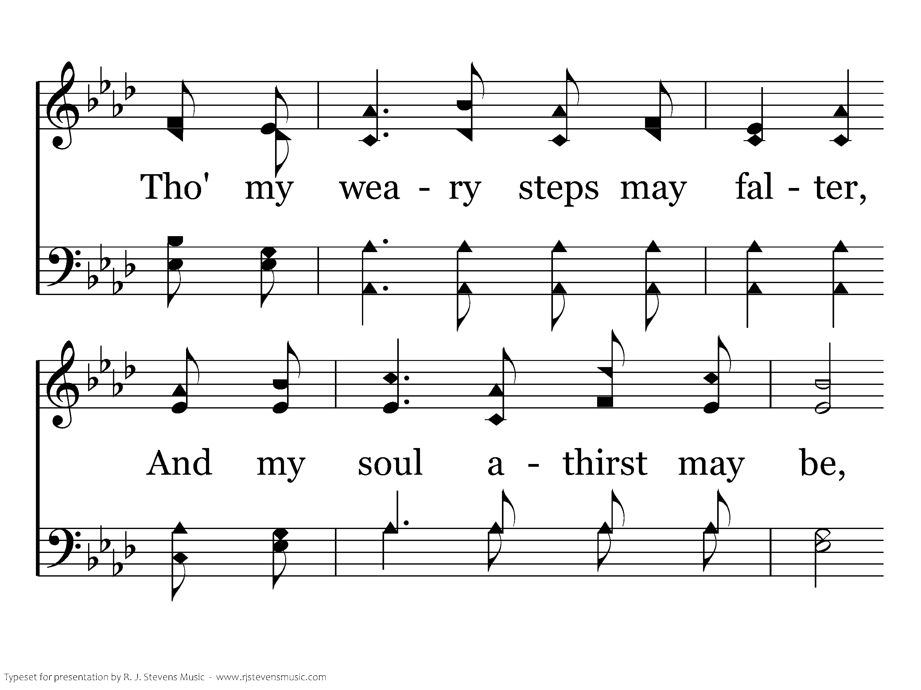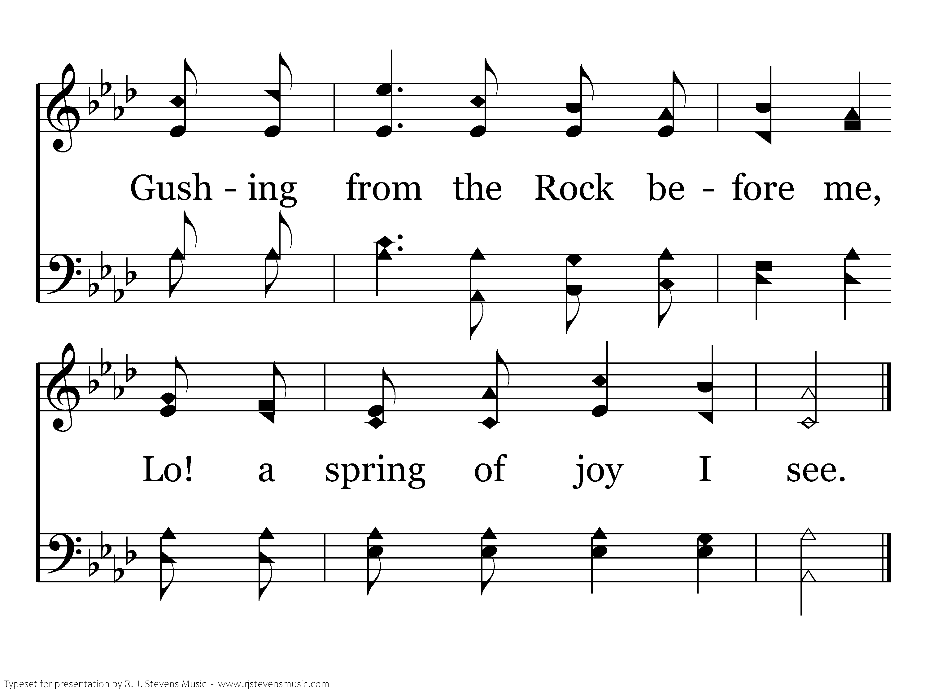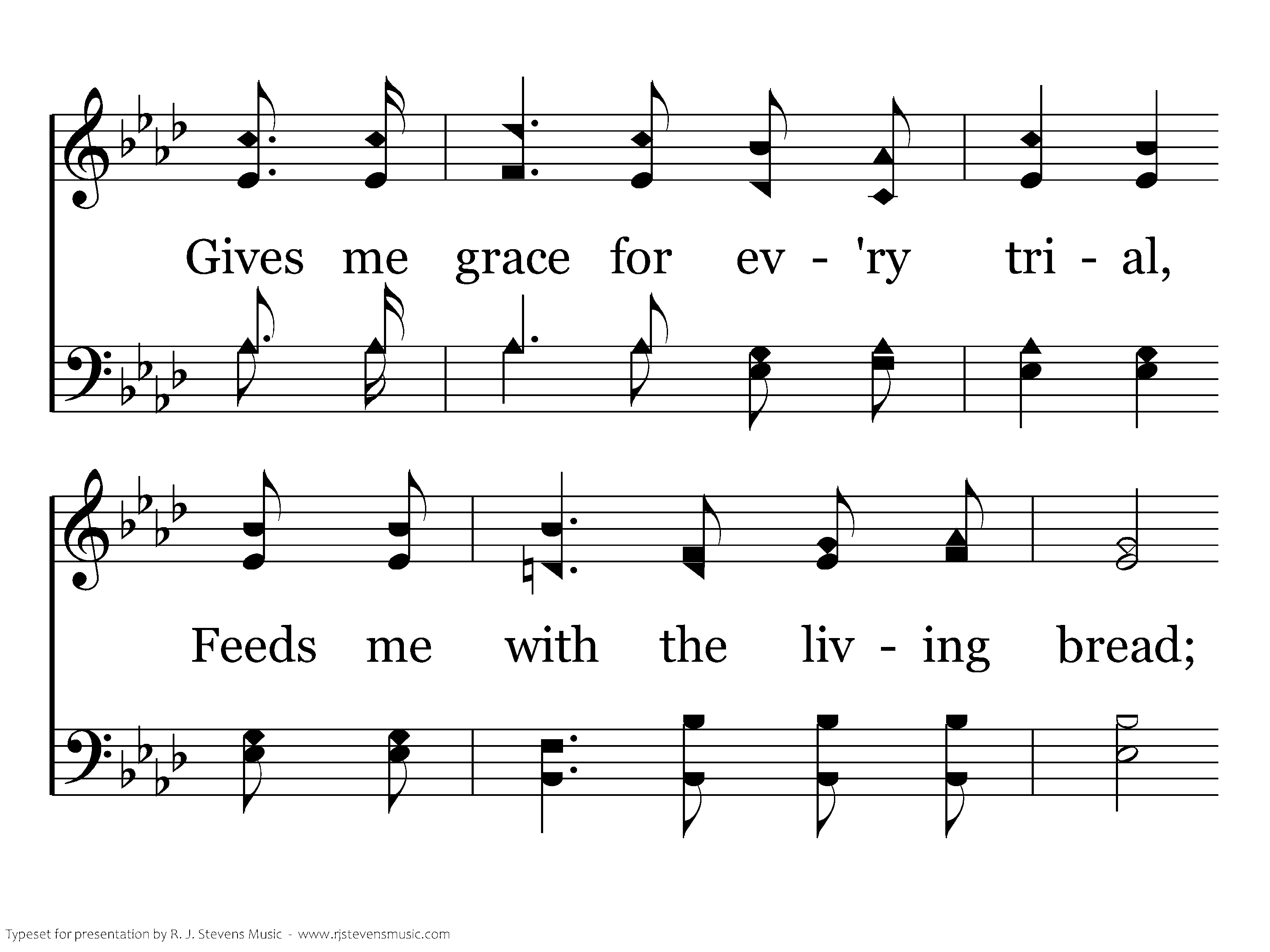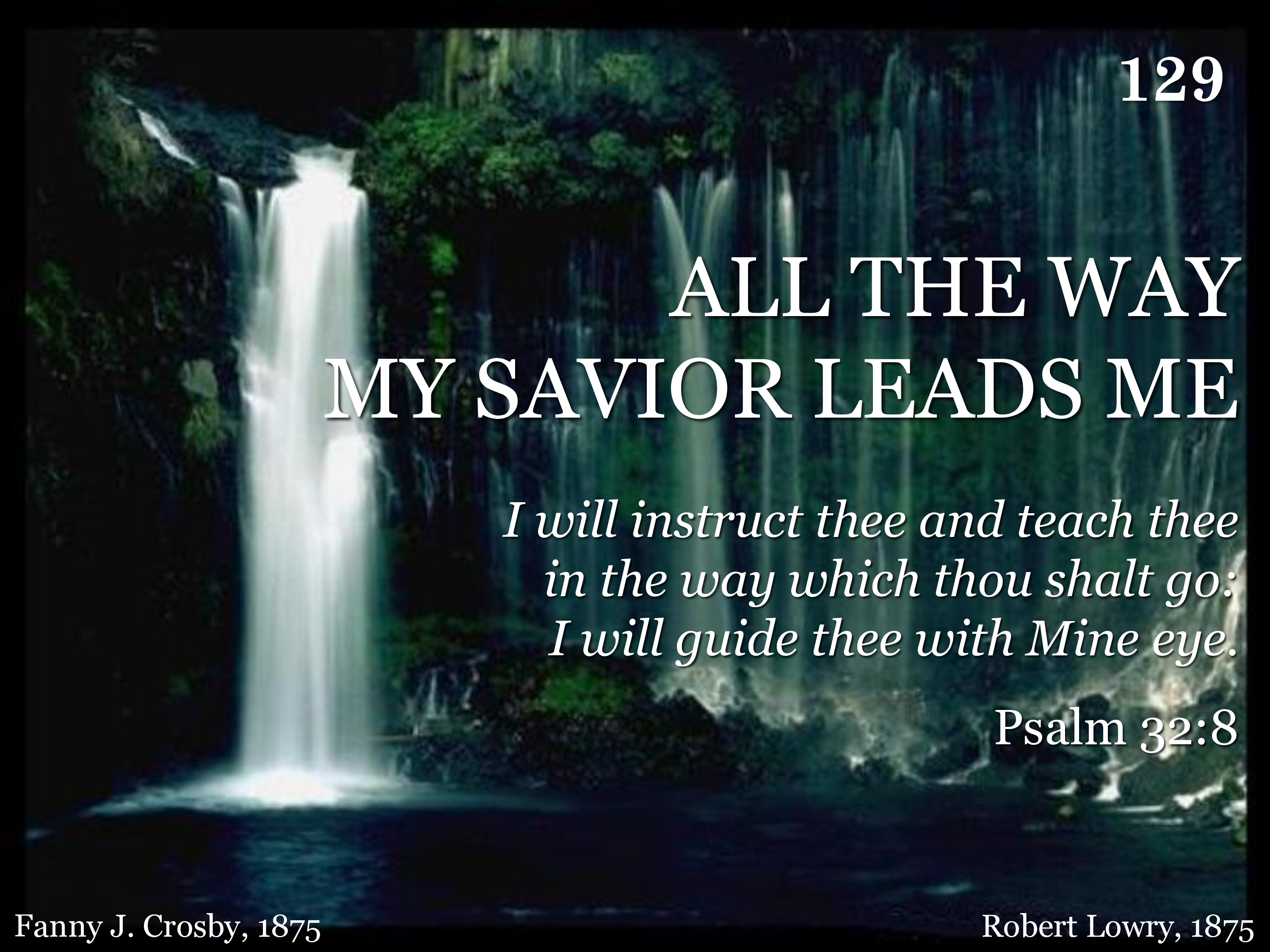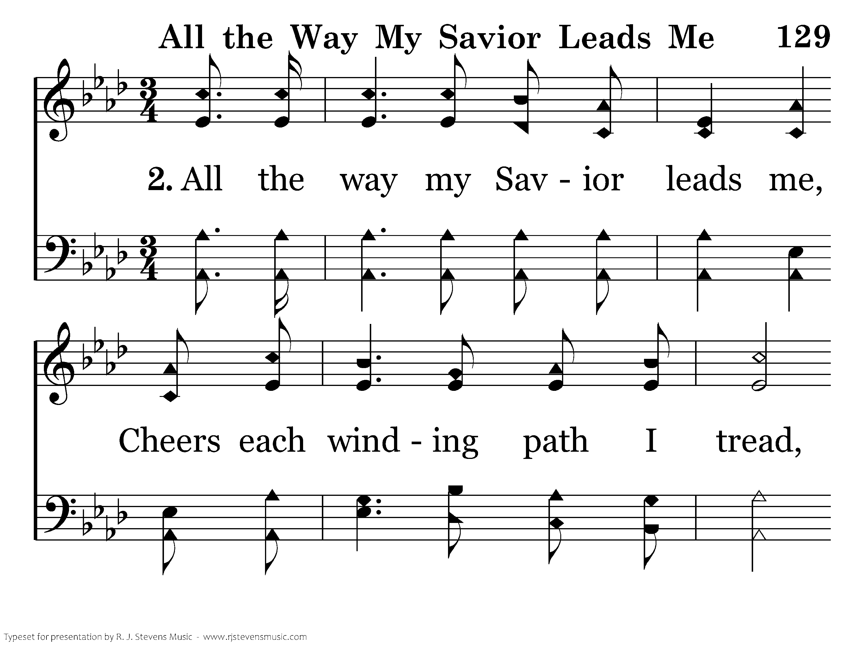 All the way my Savior leads me, Cheers each winding path I tread, Gives me grace for every trial, Feeds me with the living bread; Tho' my weary steps may falter, And my soul a thirst may be, Gushing from the rock before me, Lo! A spring of joy I see; Gushing from the rock before me, Lo! a spring of joy I see.