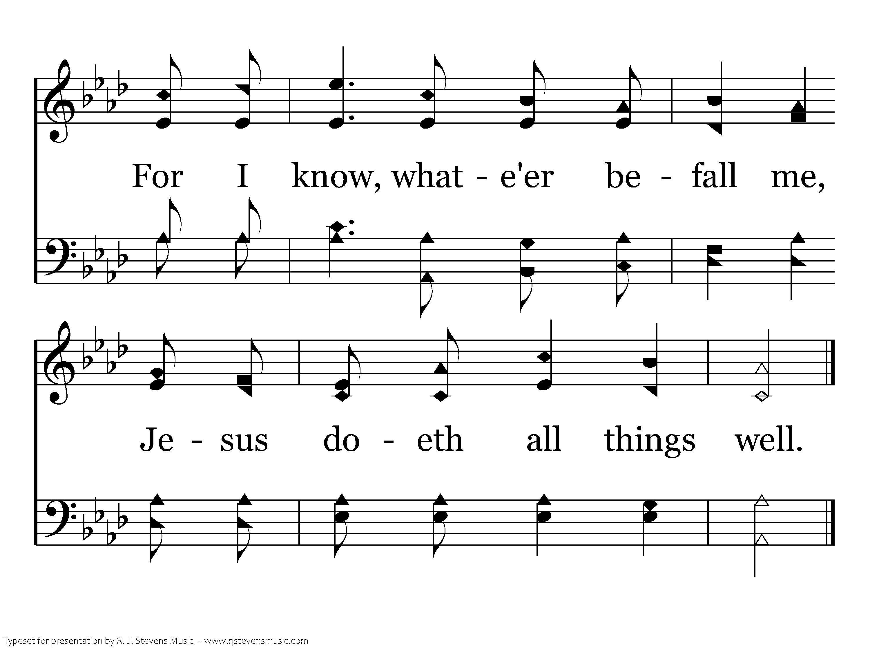 All the way my Savior leads me: What have I to ask beside? Can I doubt His tender mercy, Who through life has been my guide? Heav'nly peace, divinest comfort, Here by faith in Him to dwell! For I know whate'er befall me, Jesus doeth all things well; For I know whate'er befall me, Jesus doeth all things well.